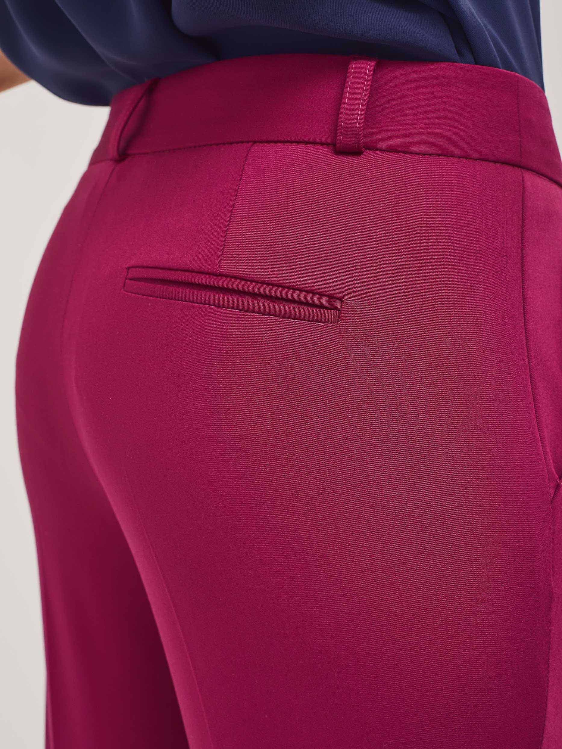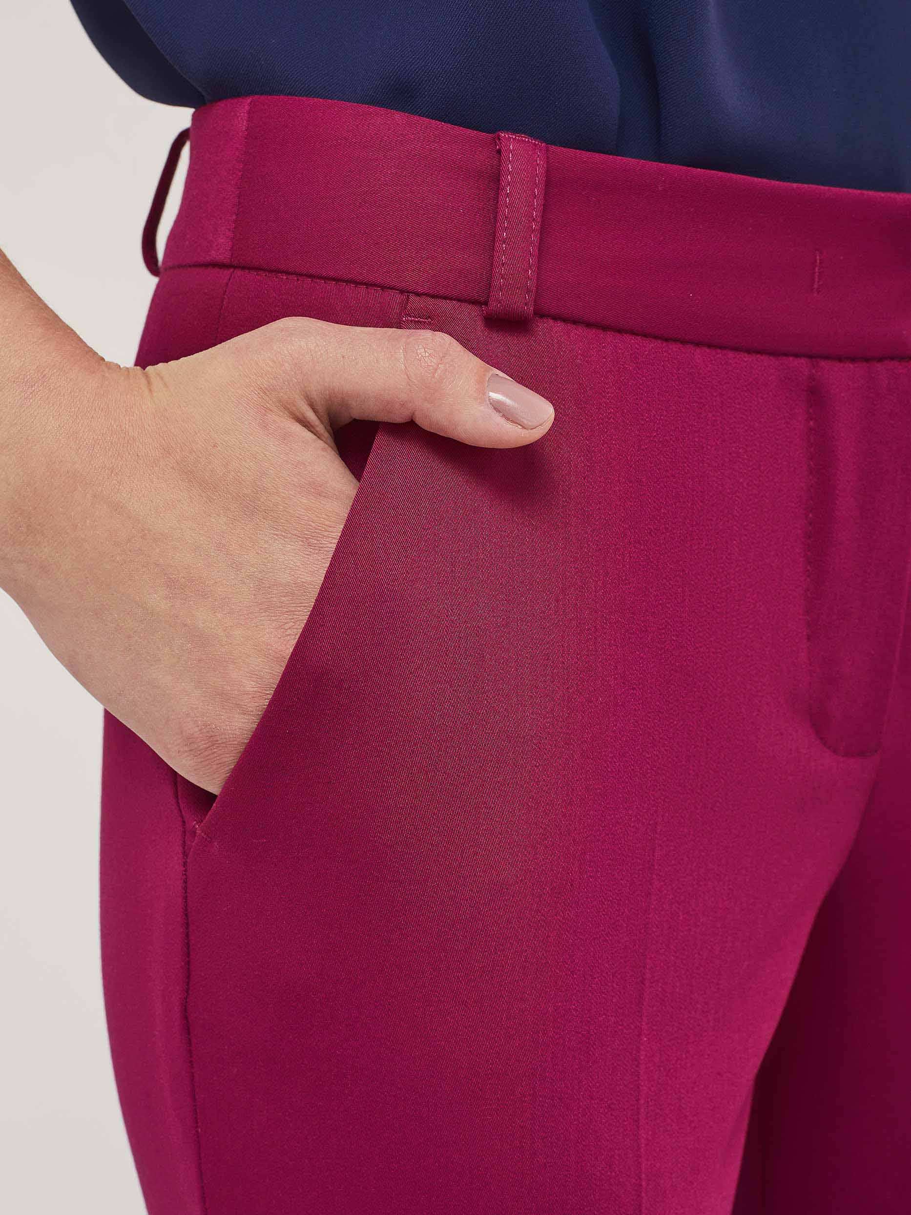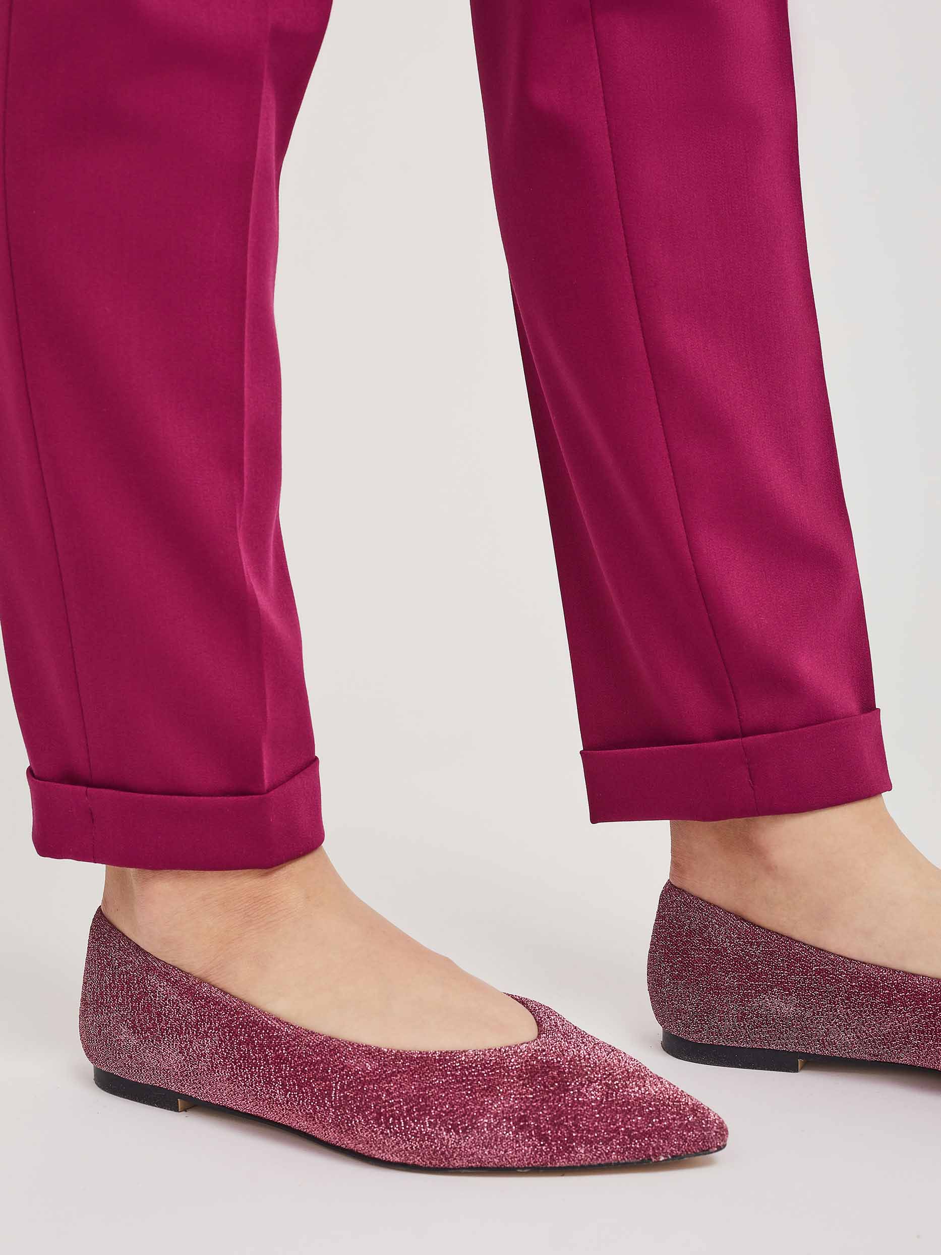 Брюки средней посадки из поливискозы. Изделие с боковыми карманами и отворотами снизу. Модель застегивается на крючки и молнию. На поясе есть шлёвки для ремня. Сзади ложный прорезной карман в рамку.  Изделие без подкладки.  Рост модели 173 см, размер 42 (российский)