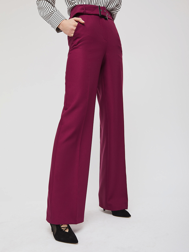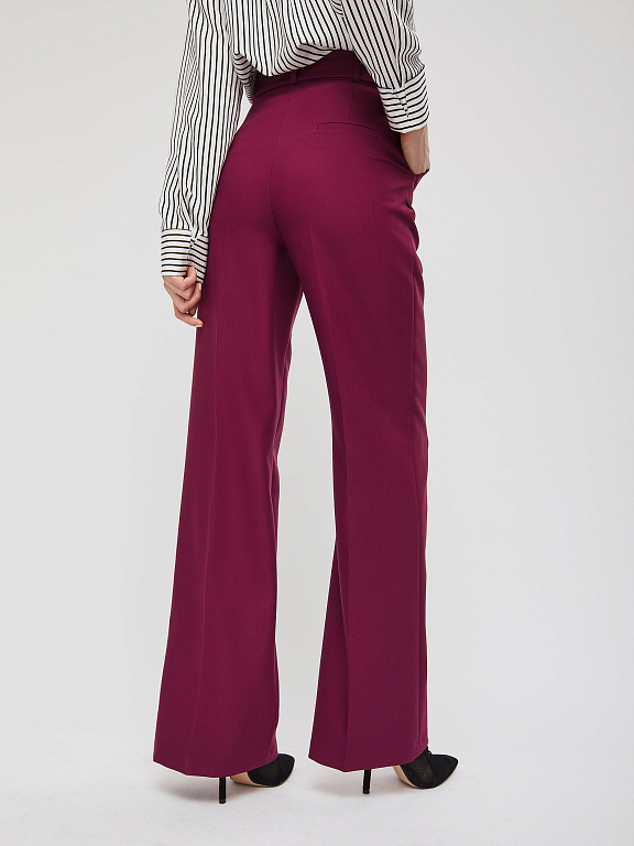 Широкие брюки из поливискозы высокой посадки. Изделие с заглаженными стрелками, боковыми карманами и поясом в цвет из основной ткани. Сзади ложный прорезной карман с листочкой. Застёжка на крючок, молнию и пуговицу. Изделие без подкладки. Рост модели 173 см, размер 42 (российский). Плотность ткани: 220 г/м2