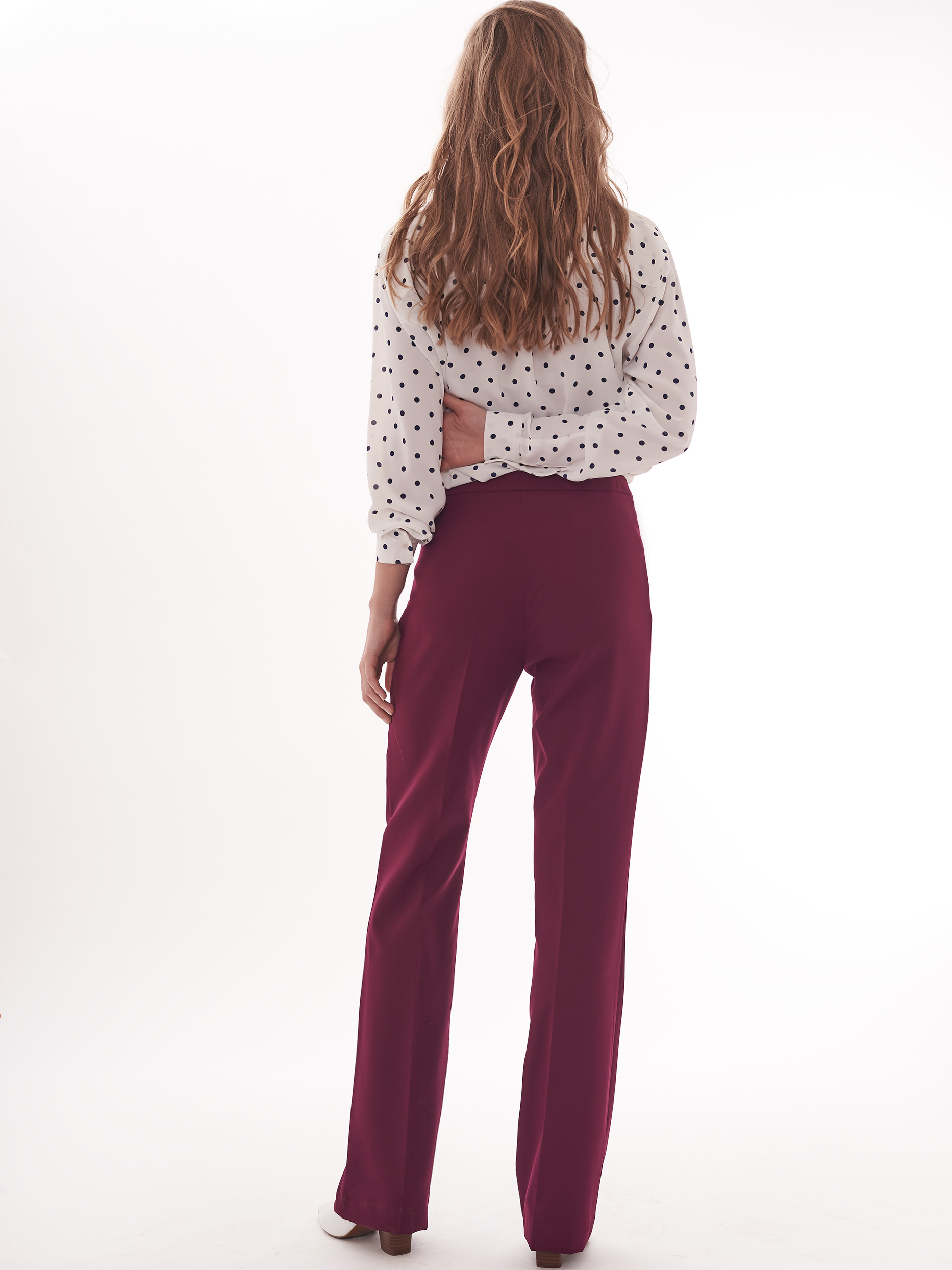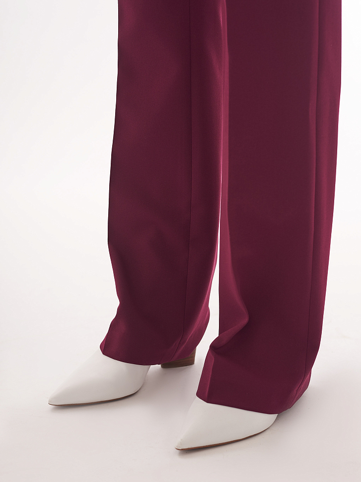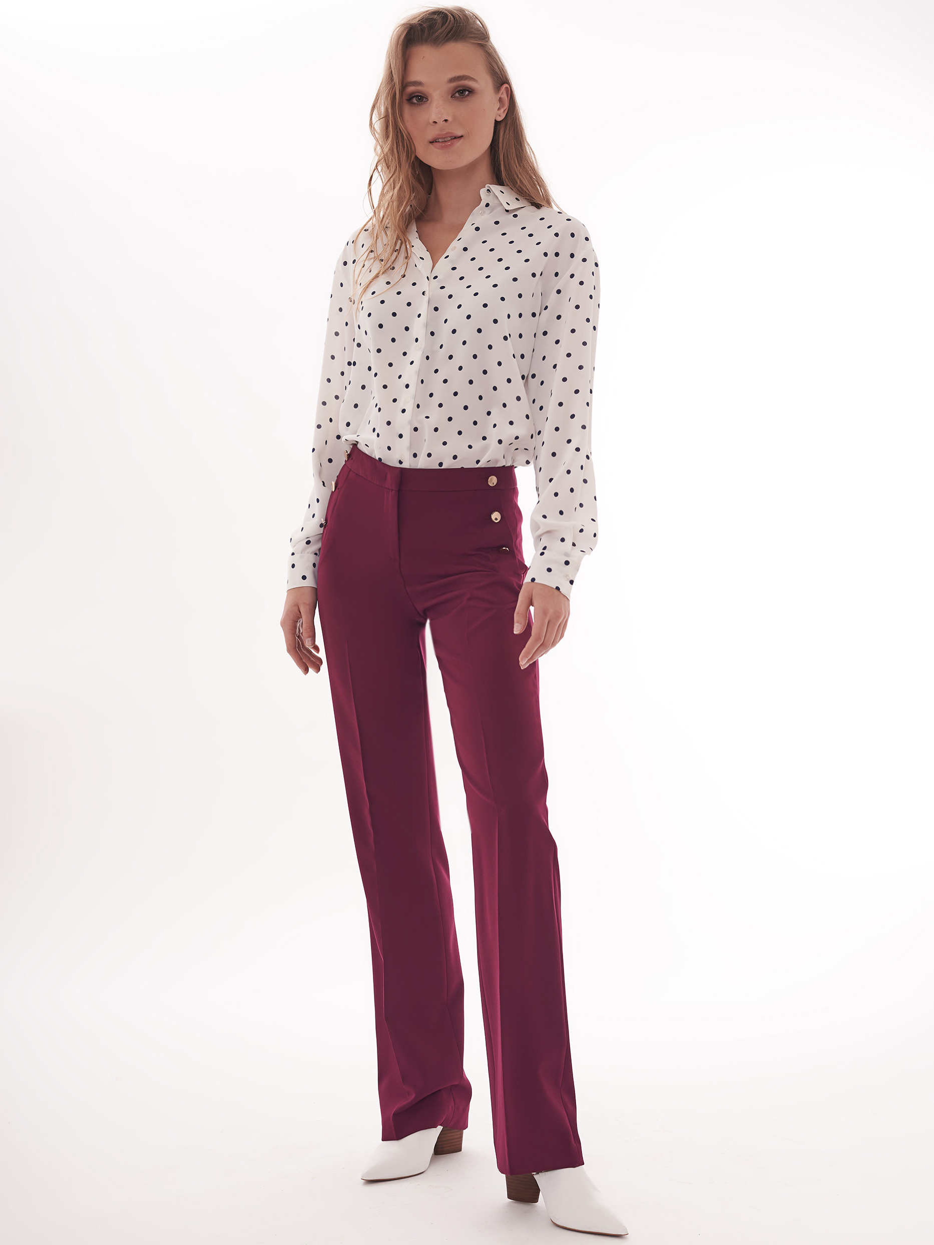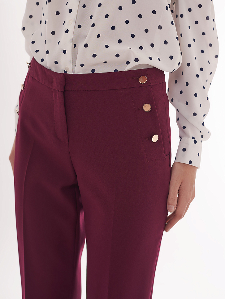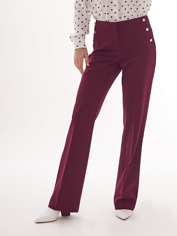 Брюки прямого кроя средней посадки. Втачной пояс, декоративные ряды металлических пуговиц вдоль прорезных боковых карманов.