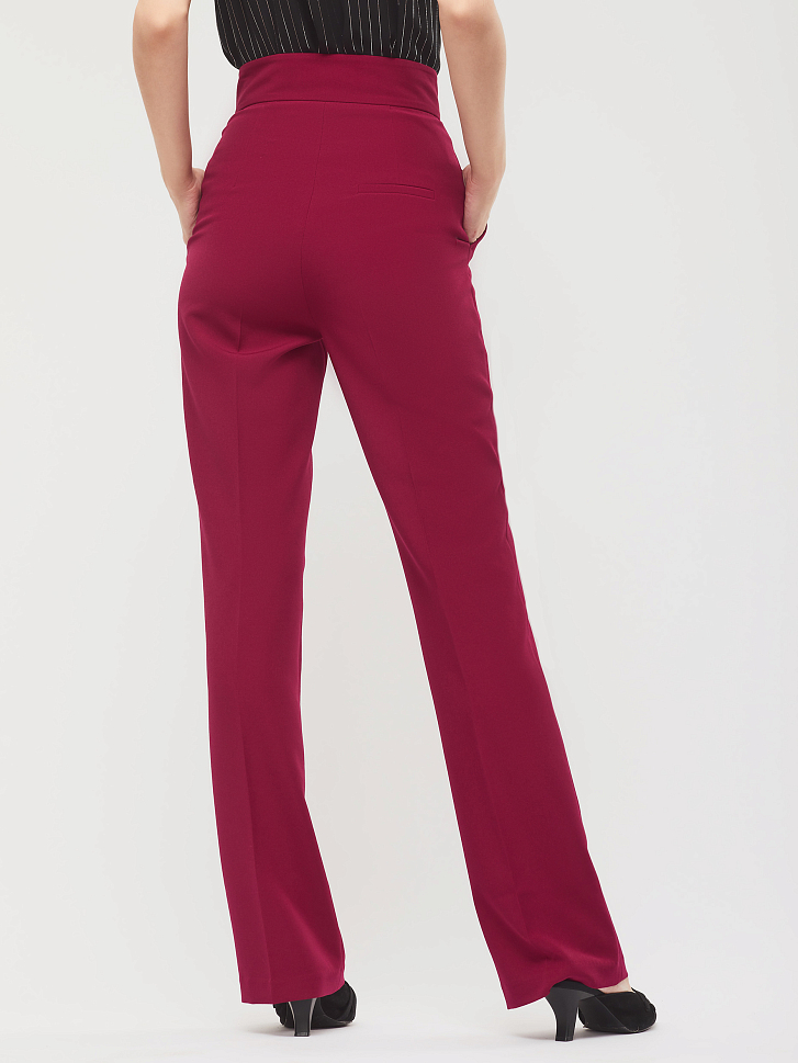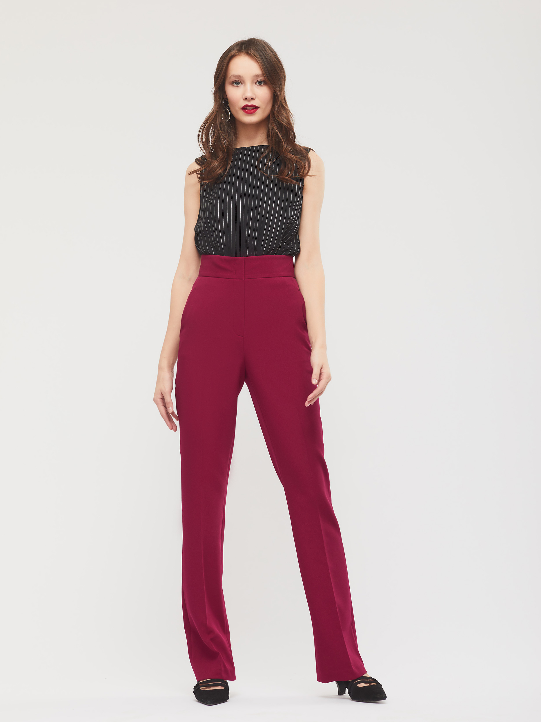 Брюки-клёш завышенной посадки с заглаженными стрелками.  Брюки с боковыми карманами, сзади ложный прорезной карман с листочкой. Застёжка на крючок, молнию и пуговицу. Изделие без подкладки. Рост модели 173 см, размер 42 (российский). Плотность ткани: 200 г/м2