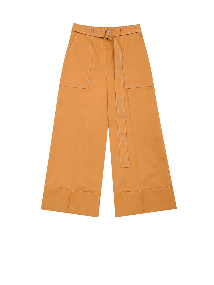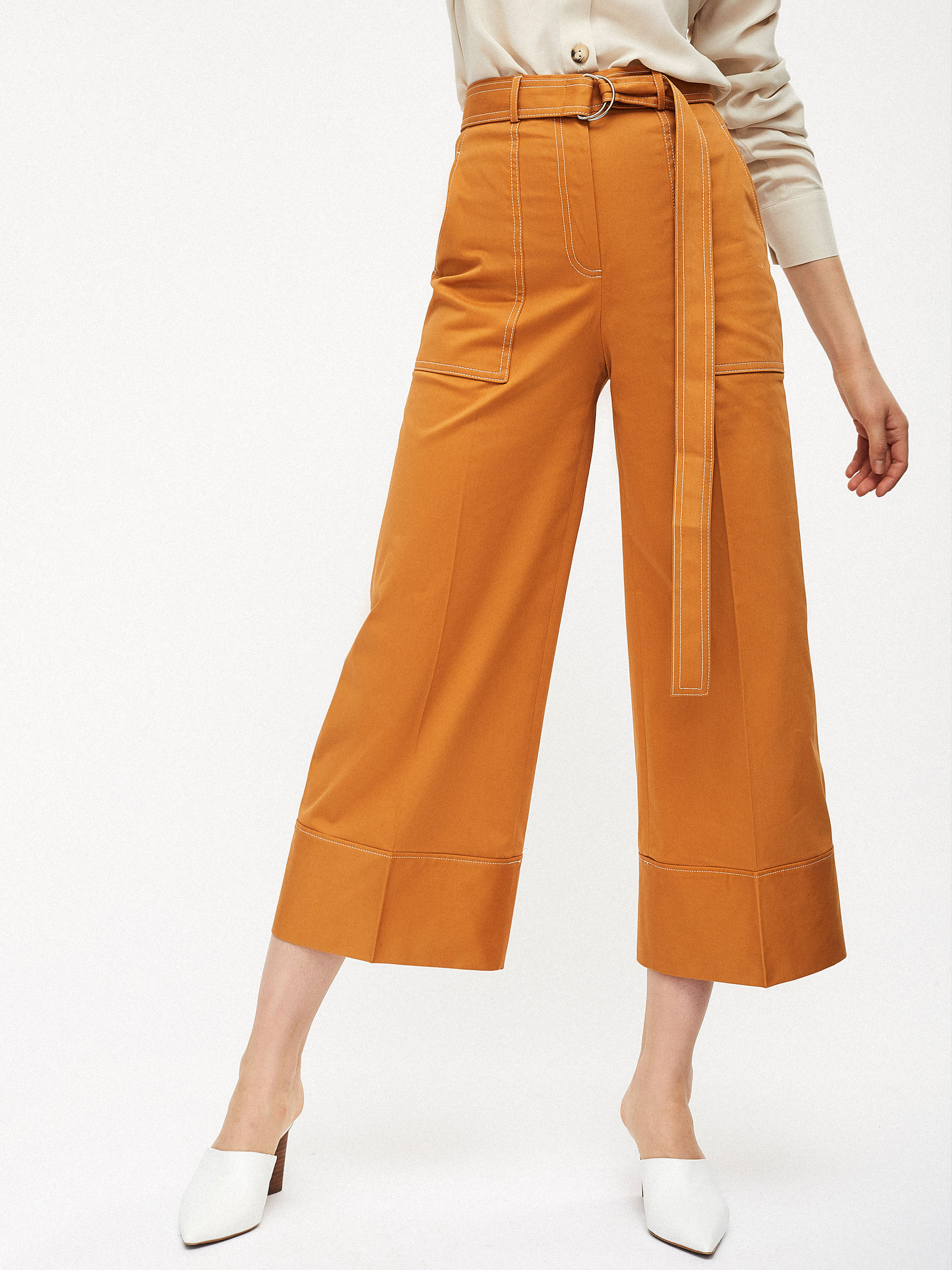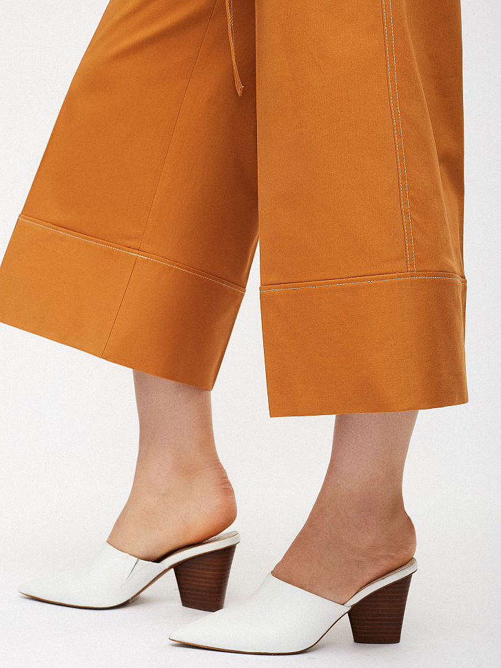 Брюки-кюлоты, выполненные из смесового хлопка. Высокая посадка, пояс в тон, накладные карманы по бокам, контрастная отстрочка.