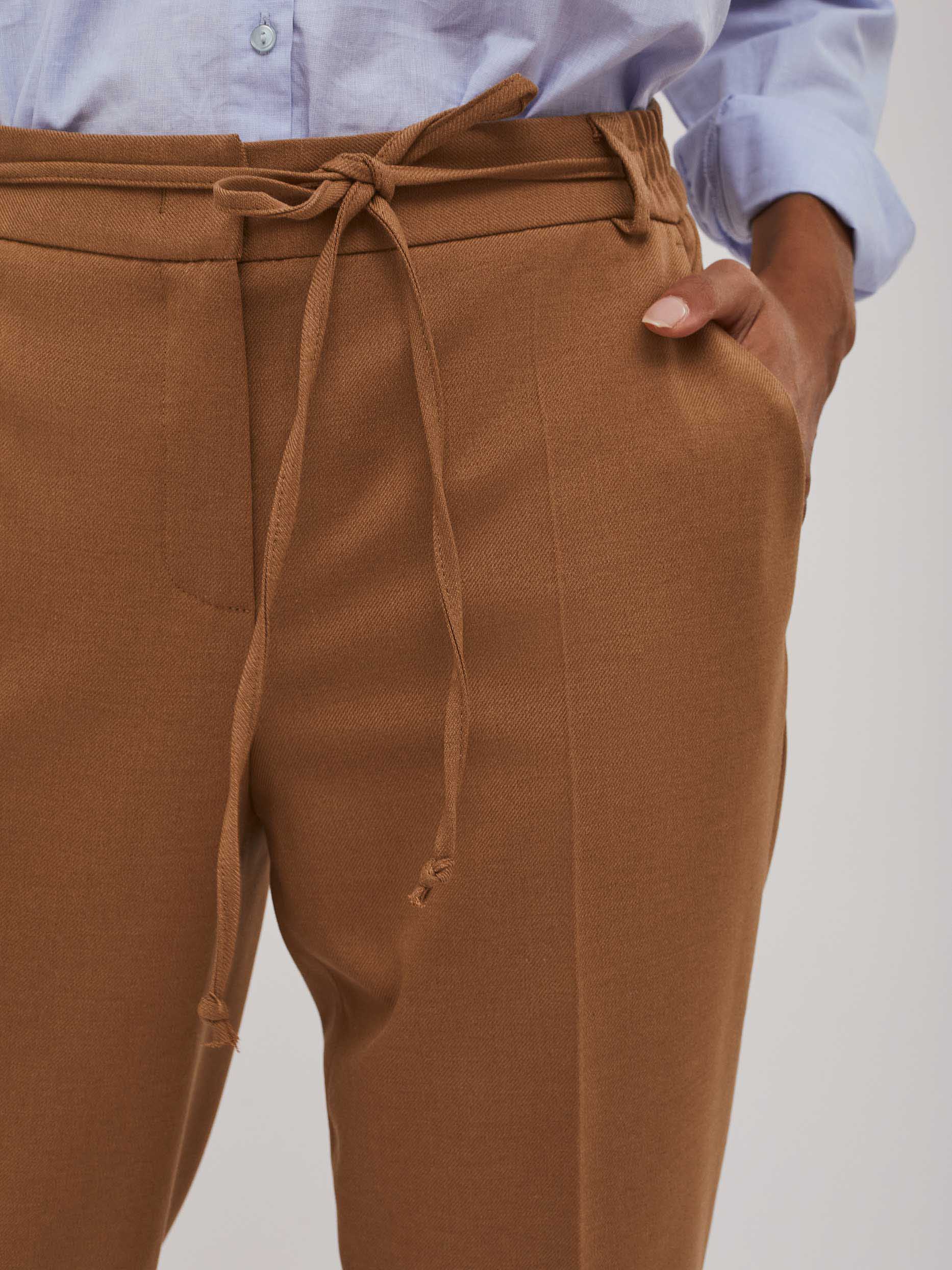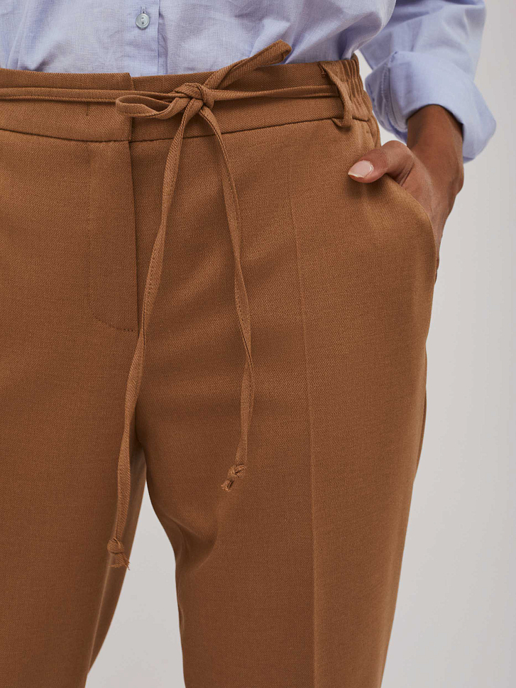 Брюки зауженного кроя с завязками. Средняя посадка, эластичный втачной пояс, прорезные карманы по бокам, декоративный карман сзади, отвороты по нижнему краю.