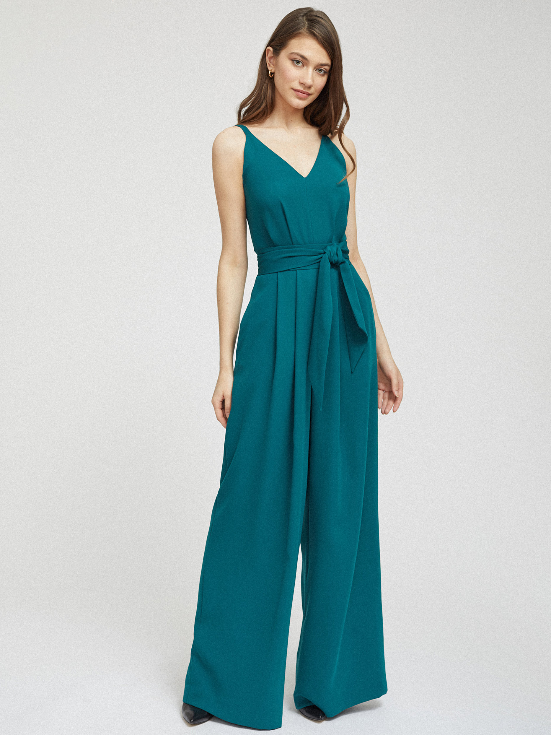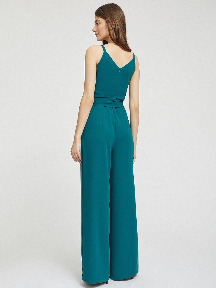 Комбинезон приталенного силуэта на тонких бретелях. V-образный вырез, защипы на талии, боковые карманы в швах, брюки широкого кроя, подкладка в верхней части. Застегивается на потайную молнию.