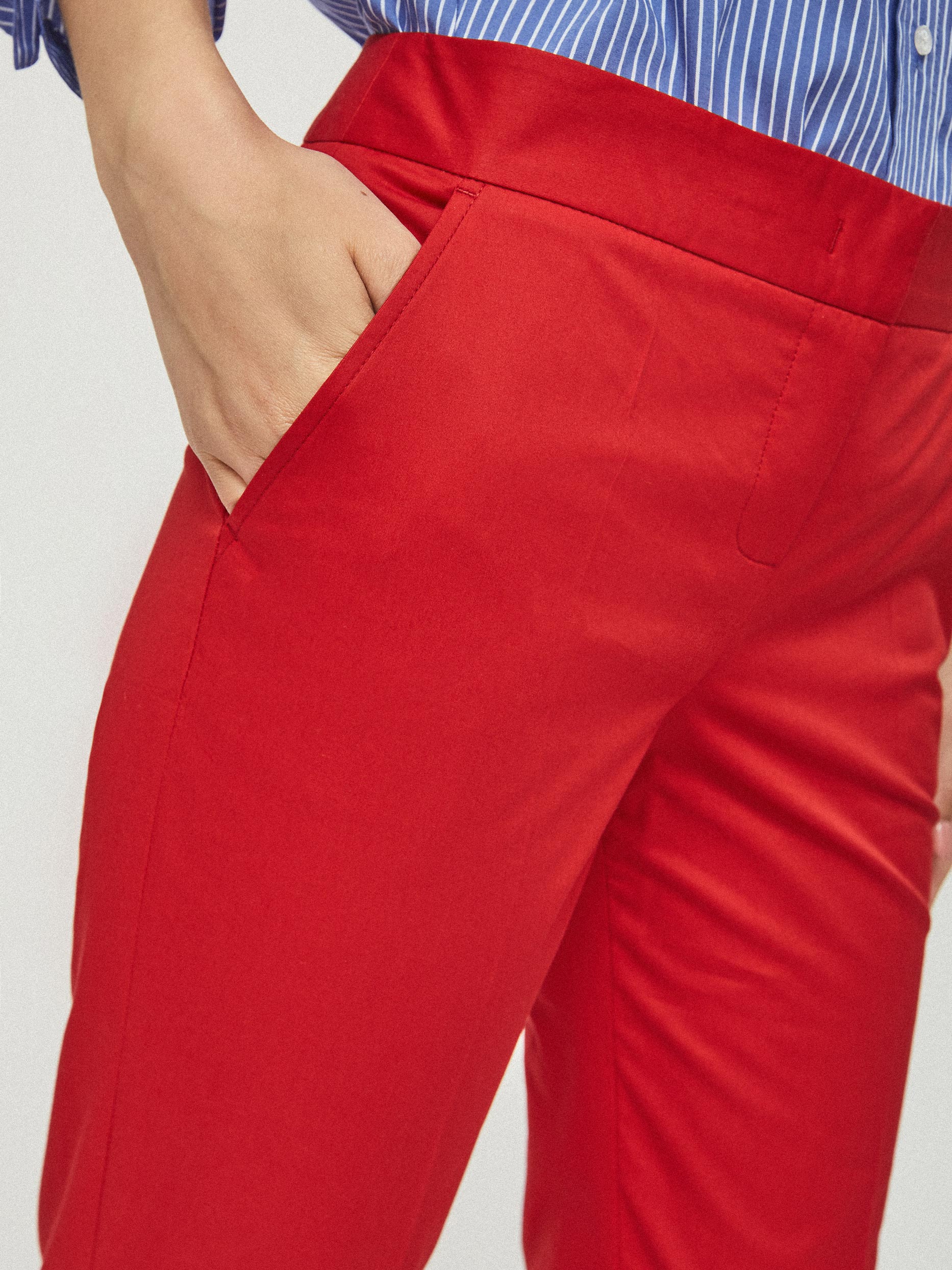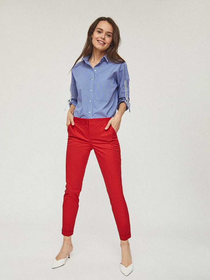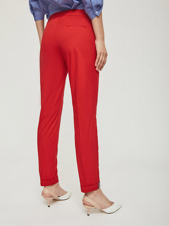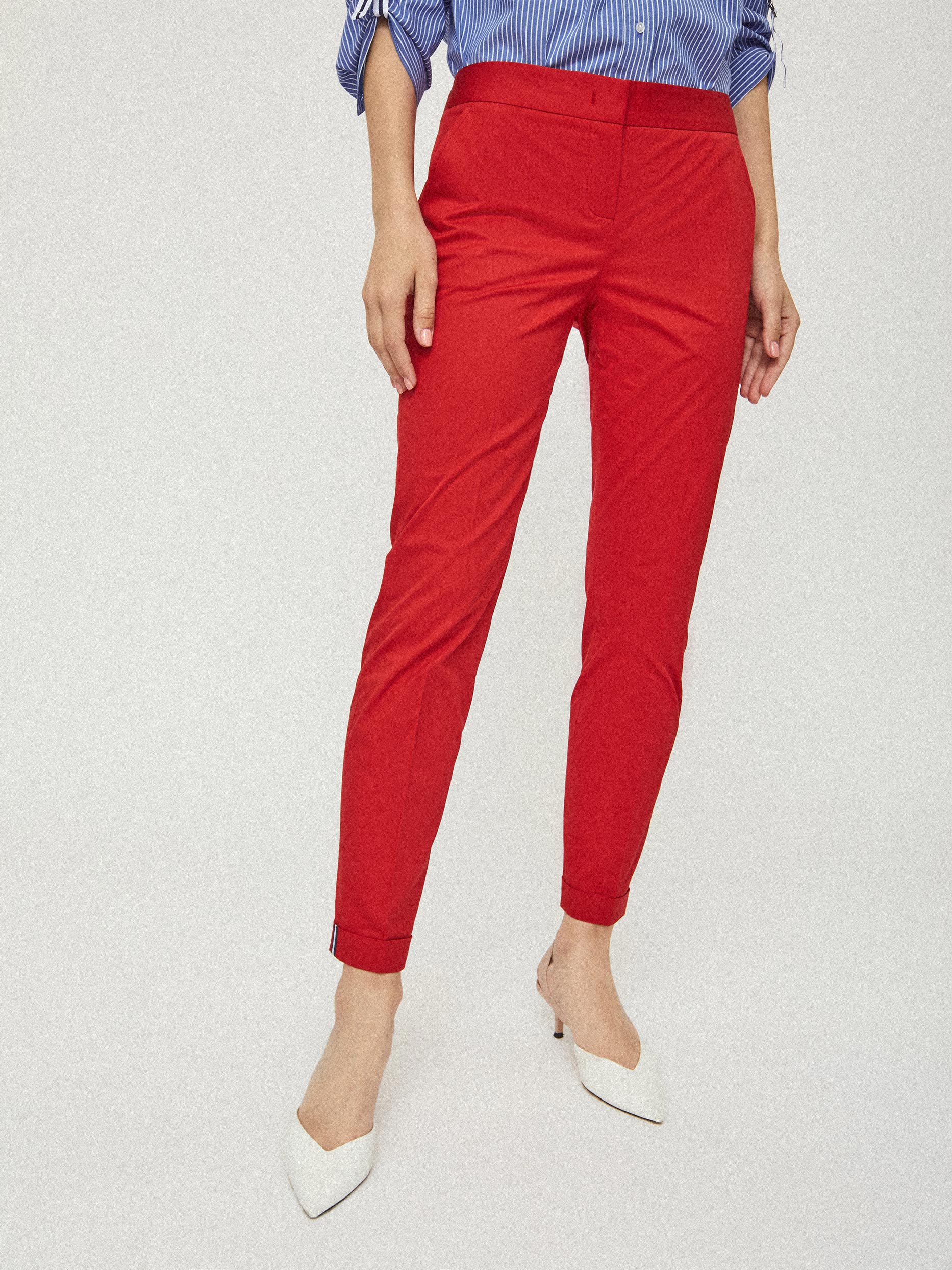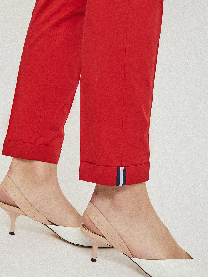 Укороченные брюки облегающего кроя, изготовленные из смесового хлопка с боковыми прорезными карманами. Низ брюк с отворотами, декорированными контрастной лентой.