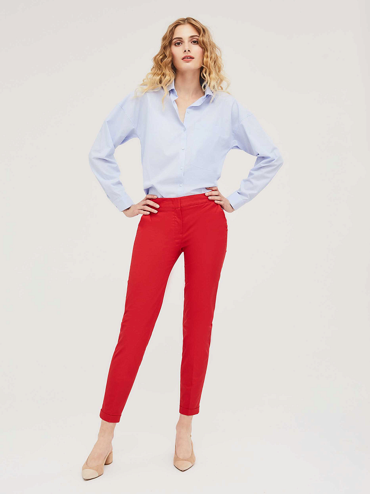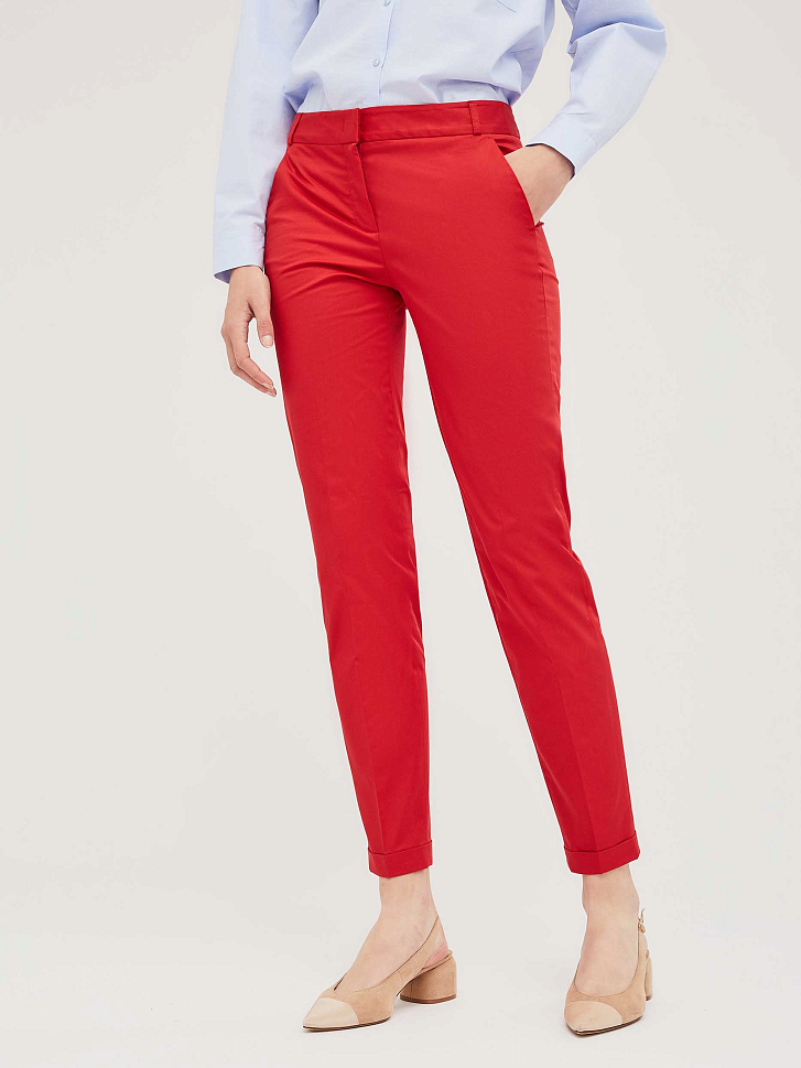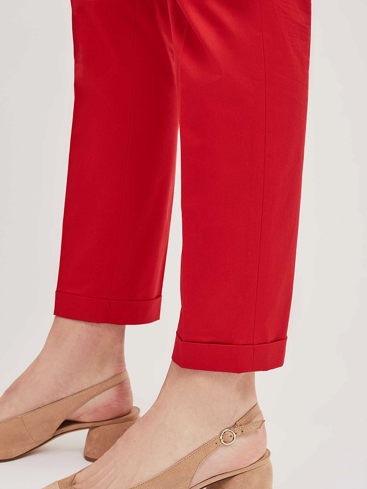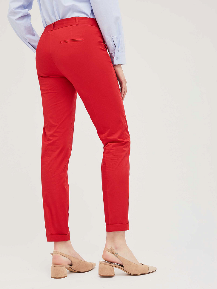 Хлопковые зауженные брюки с зашитыми отворотами снизу и боковыми карманами. Брюки со шлёвками для ремня на талии. Сзади прорезной карман в рамку. Изделие без подкладки.  Рост модели 175 см, размер 42 (российский)