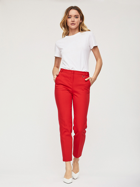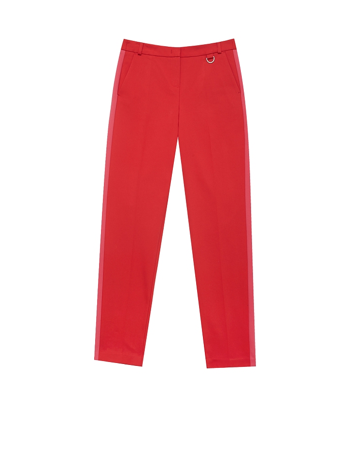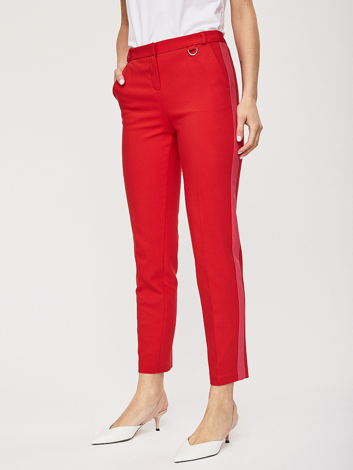 Зауженные брюки из плотного полихлопка с контрастными лампасами. На поясе есть шлёвки для ремня и декоративный элемент с металлическим полукольцом. Брюки с боковыми карманами. Изделие без подкладки. Рост модели 177 см, размер 42 (российский)