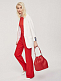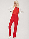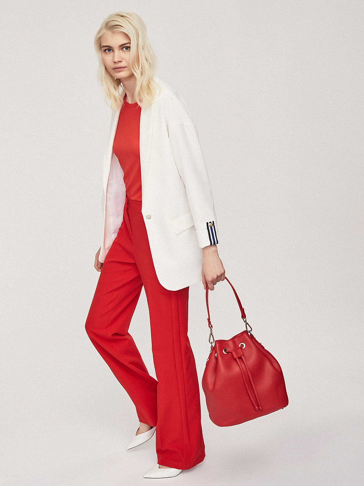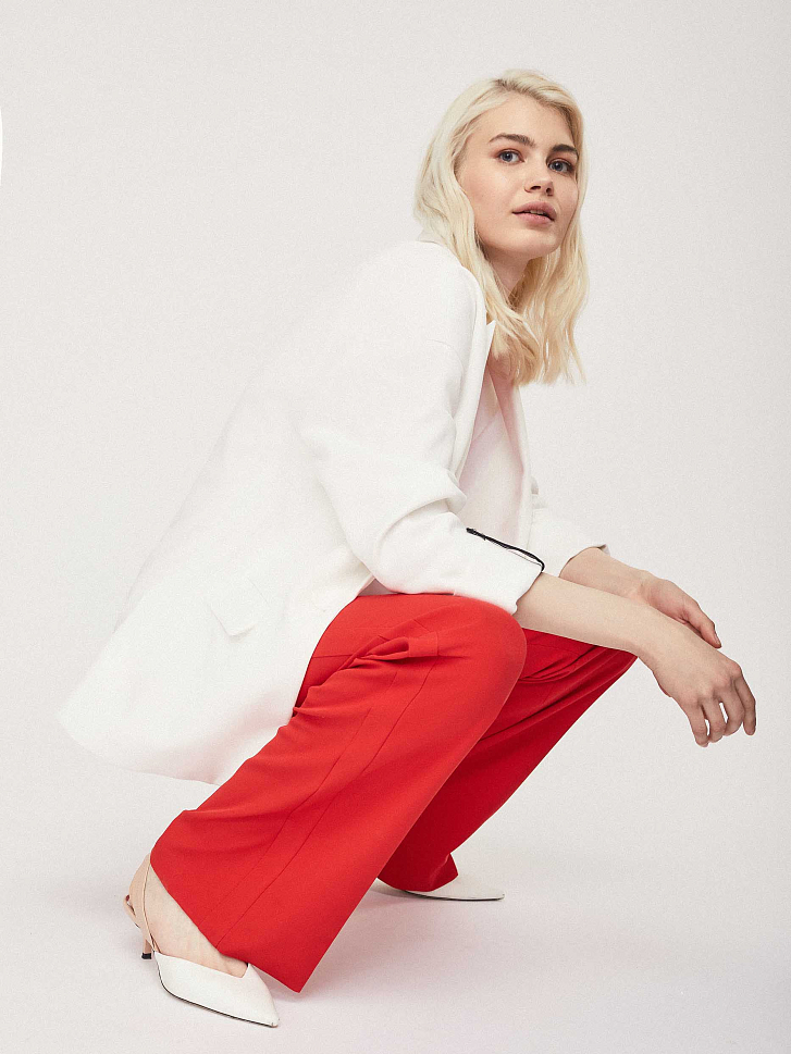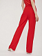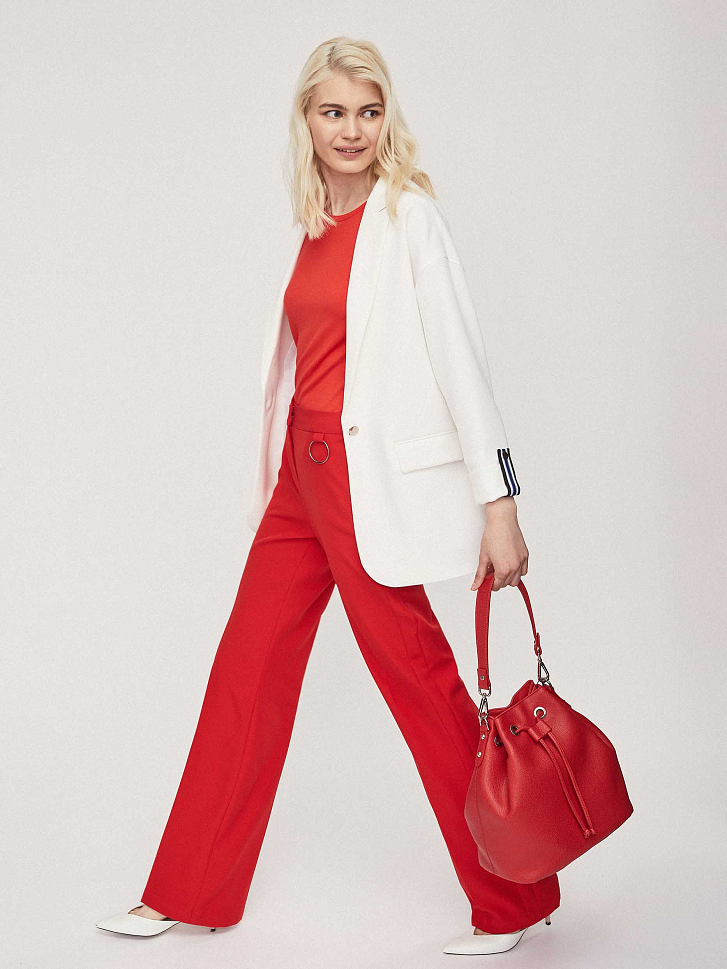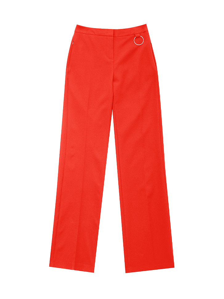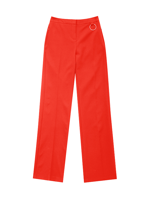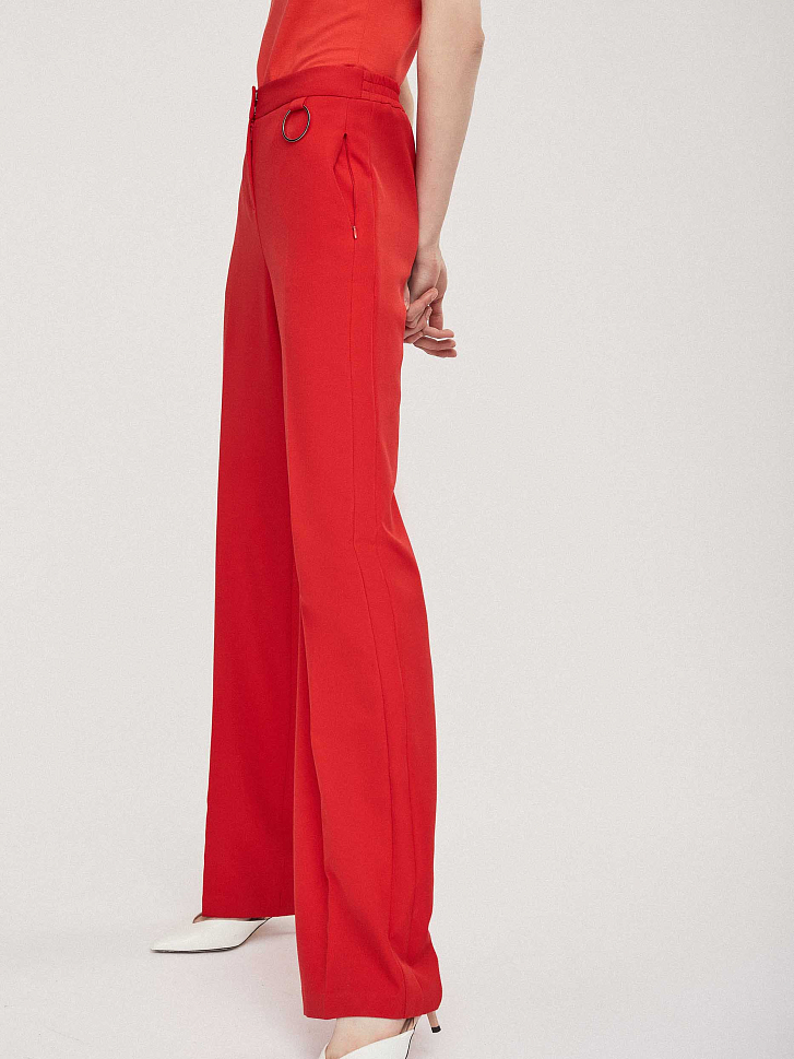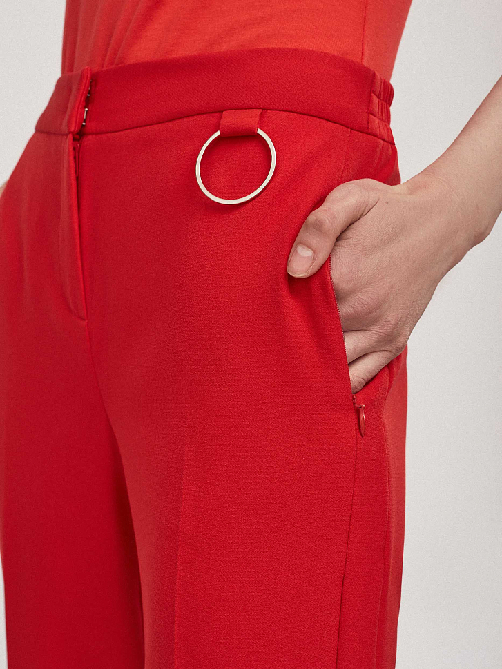 Брюки прямого кроя на талии с лампасами в цвет основной ткани, боковыми карманами и декоративным металлическим кольцом на поясе.