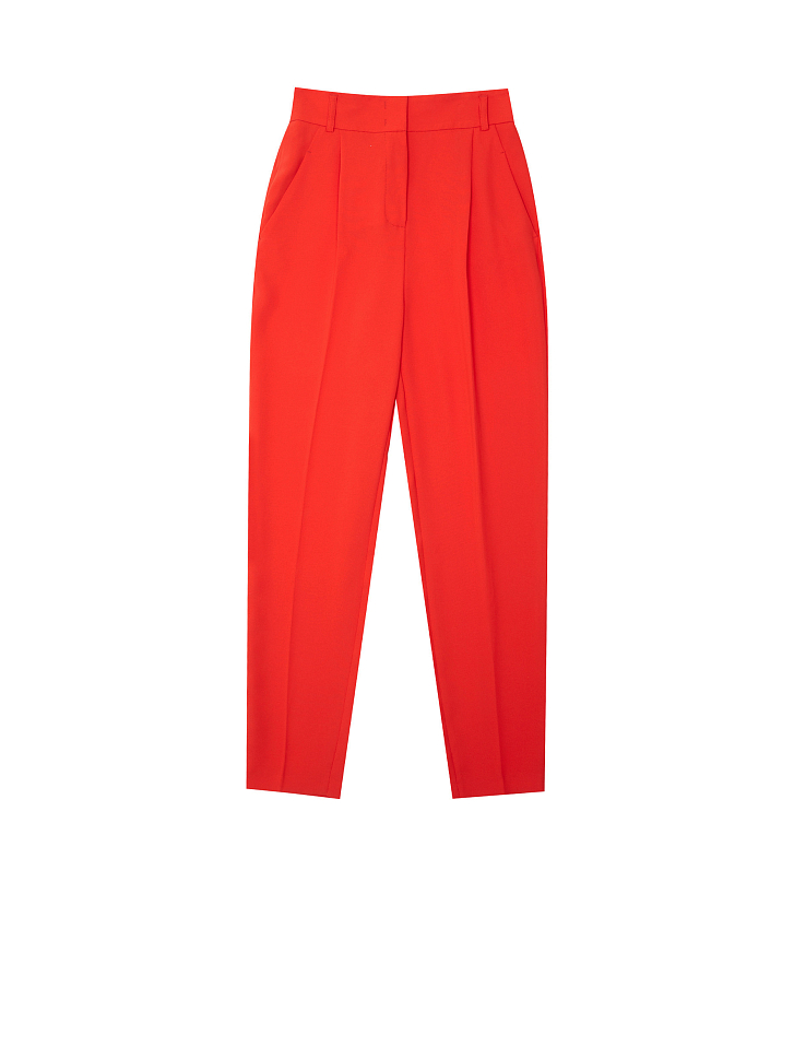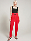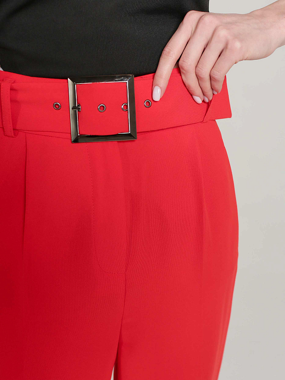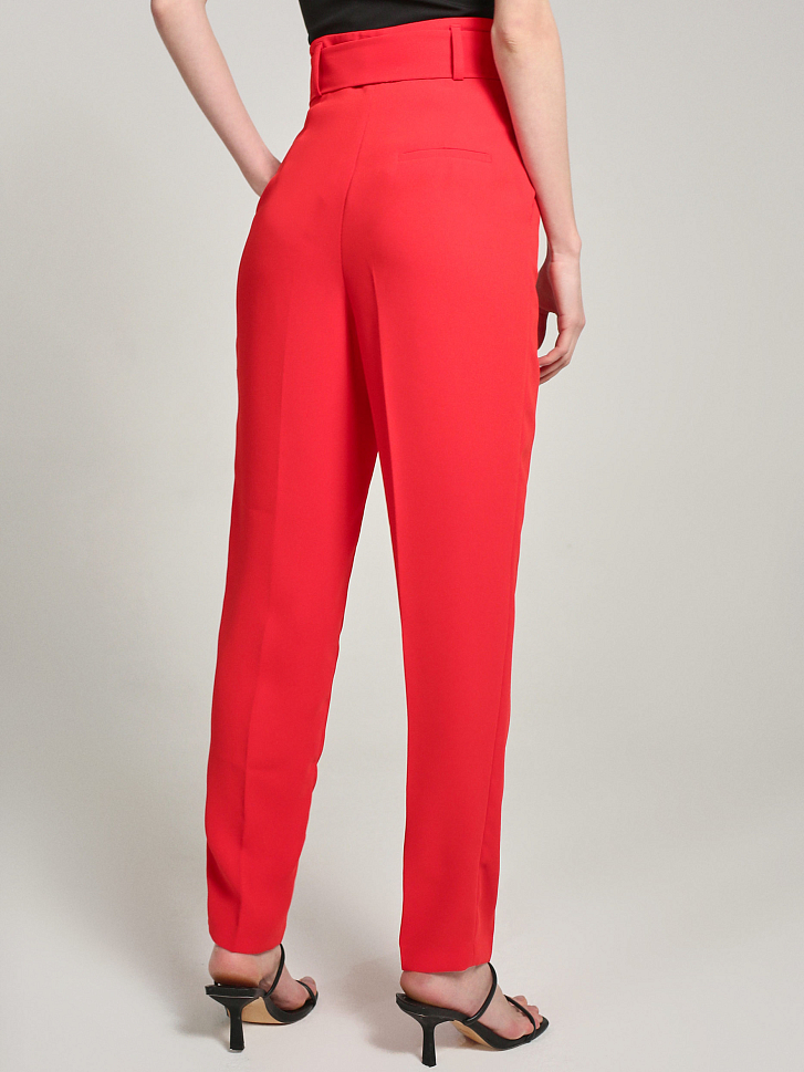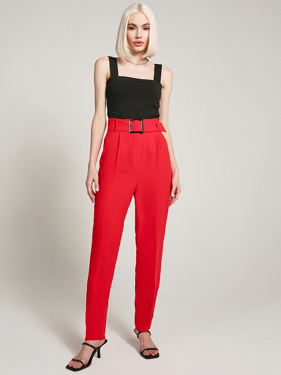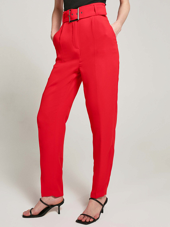 Однотонные брюки зауженного кроя с защипами. Высокая посадка, втачной пояс, прорезные карманы по бокам, декоративный карман сзади. В комплекте пояс с металлической пряжкой.