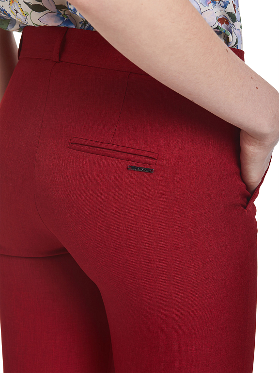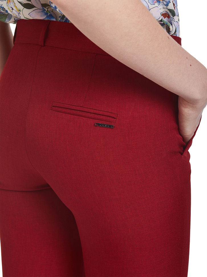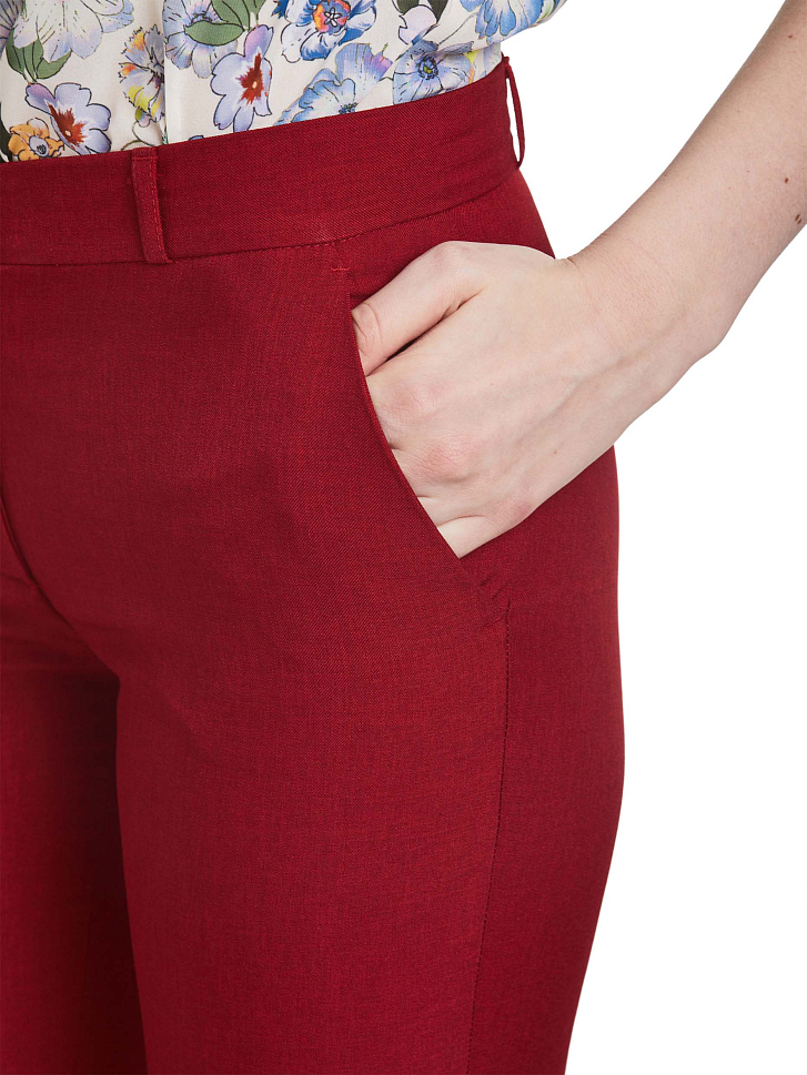 Зауженные брюки средней посадки. Изделие с боковыми карманами и отворотами. Модель застегивается на крючок.