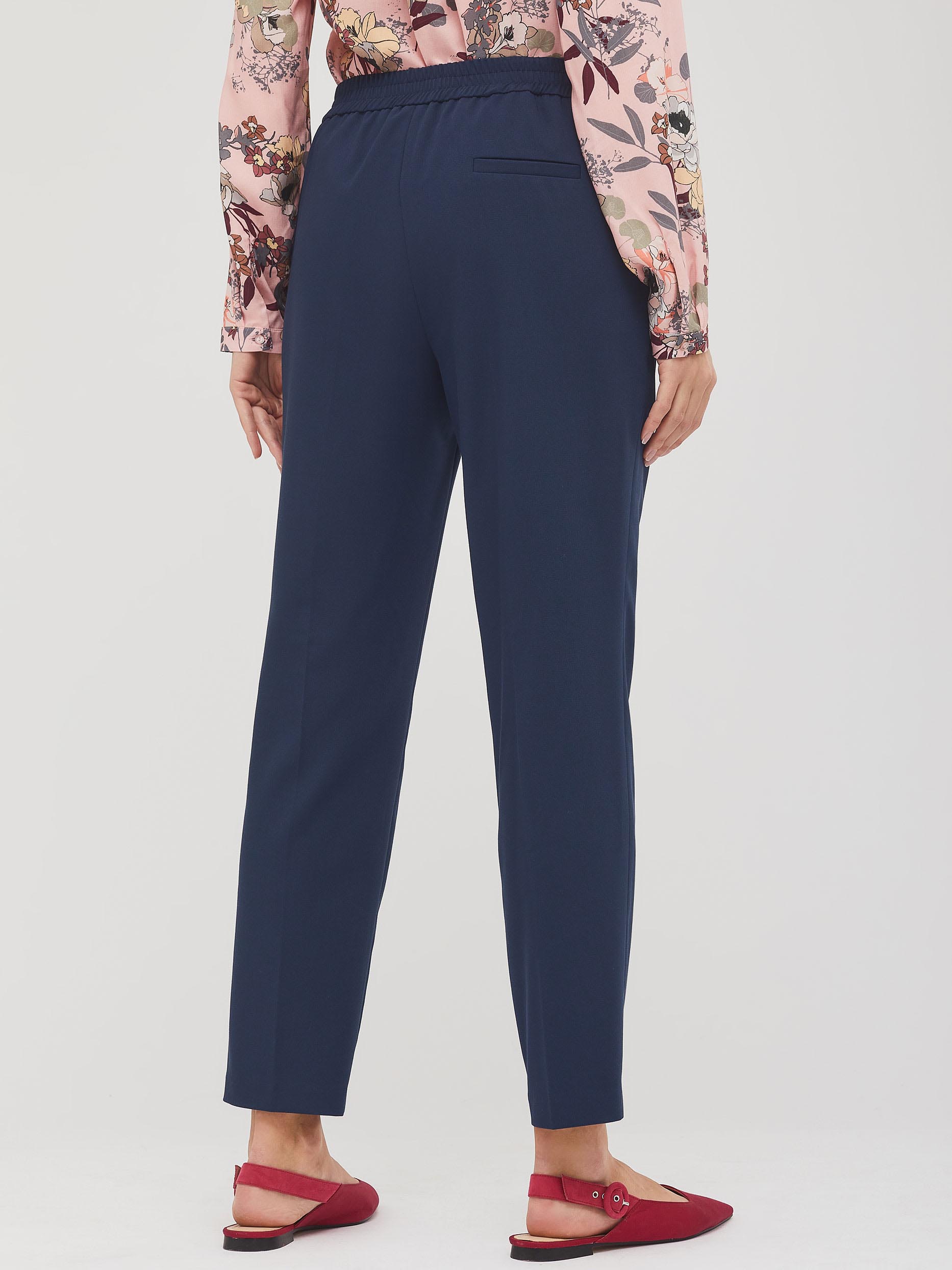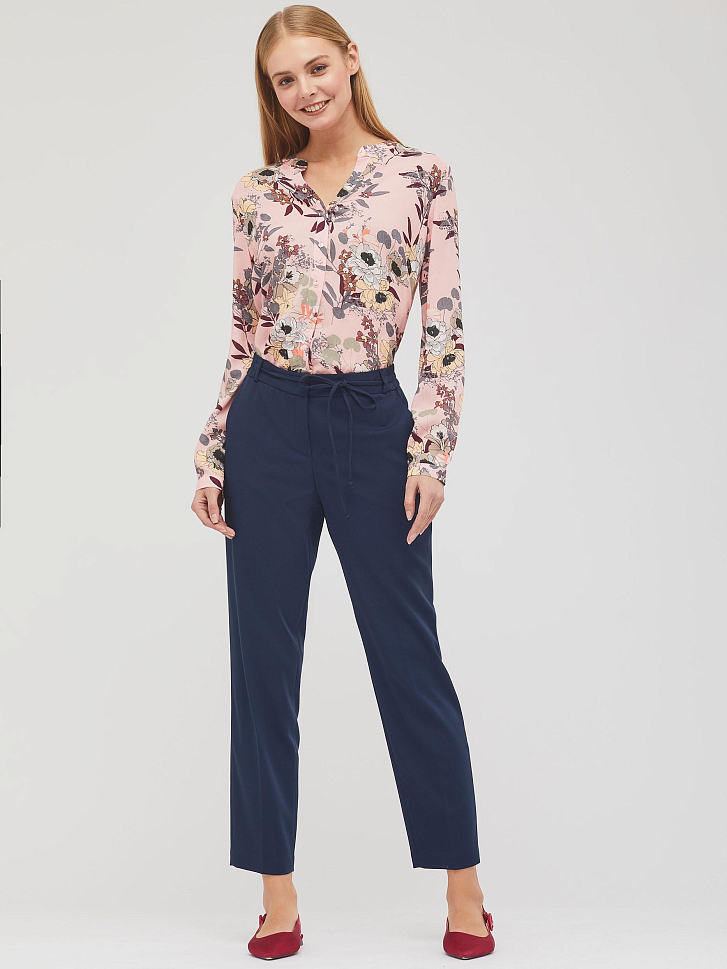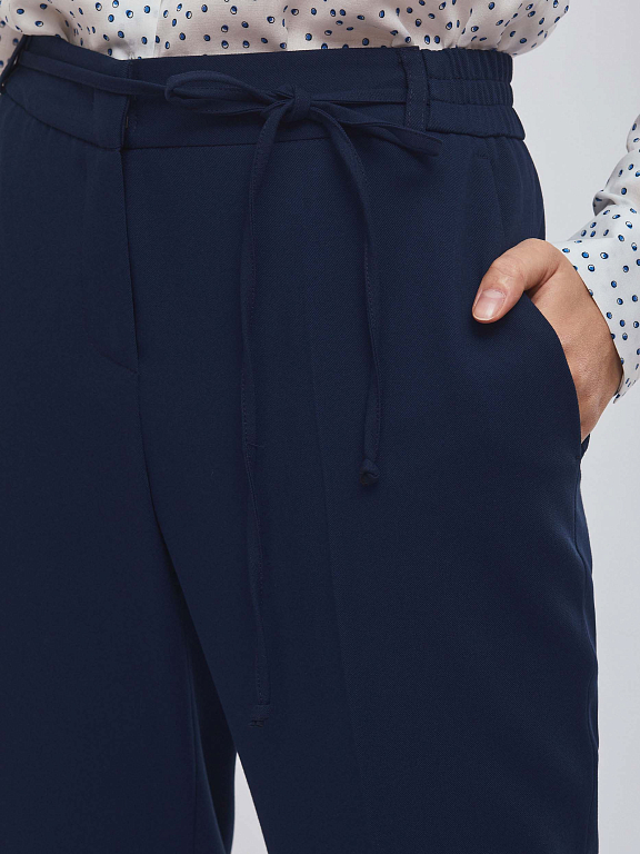 Укороченные брюки средней посадки из поливискозы. Изделие с заглаженными стрелками, боковыми карманами и тонким поясом на бант. Сзади ложный прорезной карман с листочкой. Застёжка на крючоки и молнию. Изделие без подкладки. Рост модели 173 см, размер 42 (российский). Плотность ткани: 250 г/м2