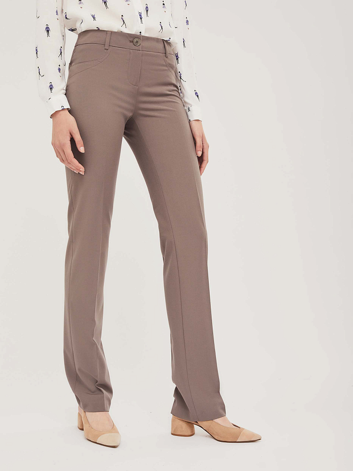 Прямые брюки из поливискозы с декоративными рельефами и  строчкой в цвет. Изделие со шлёвками для ремня. Брюки с заглаженными стрелками. Изделие без подкладки. Рост модели 177 см, размер 42 (российский)