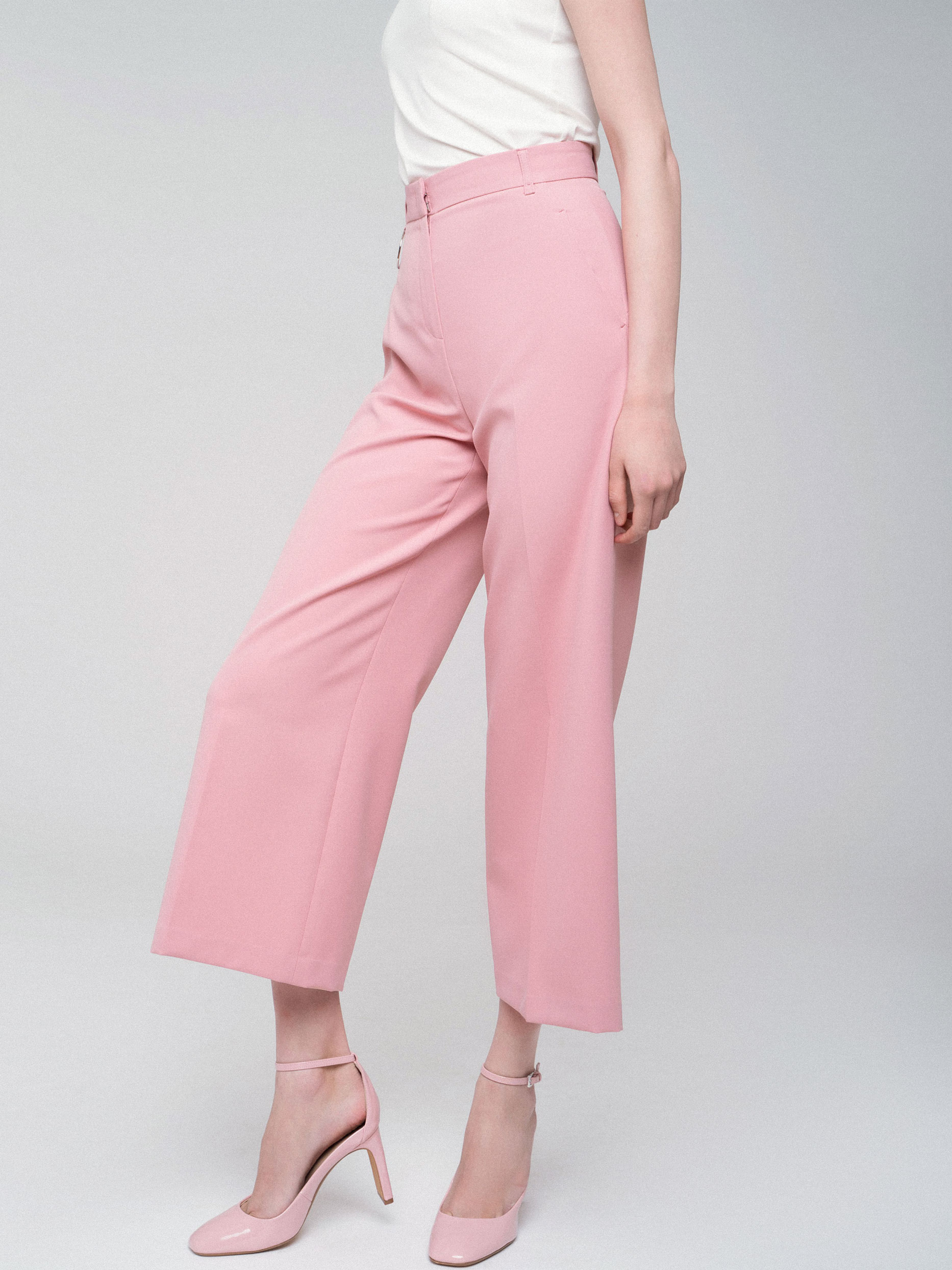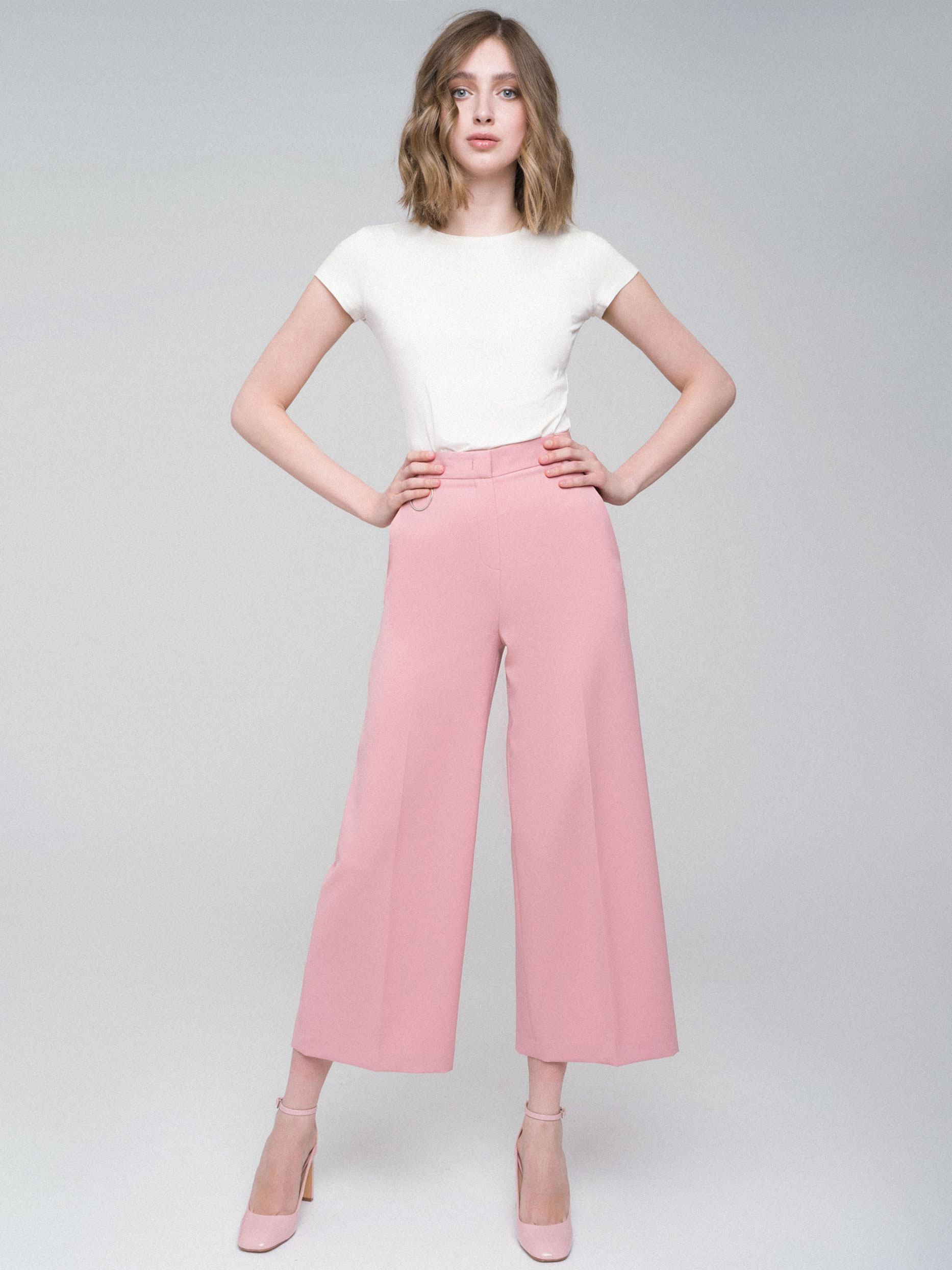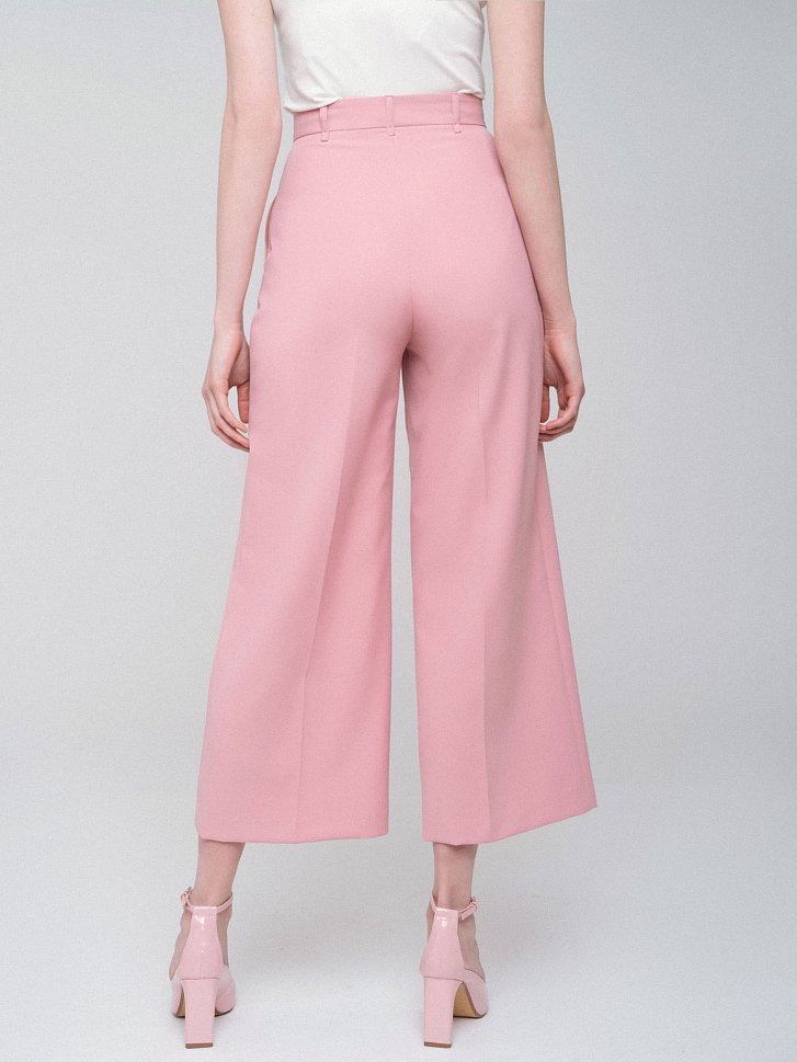 Брюки-кюлоты широкого кроя. Высокая посадка, втачной пояс с декоративным металлическим кольцом, прорезные карманы по бокам.