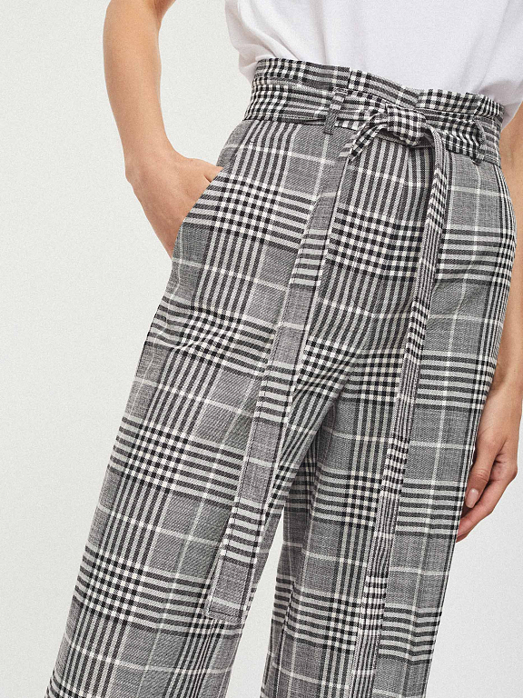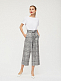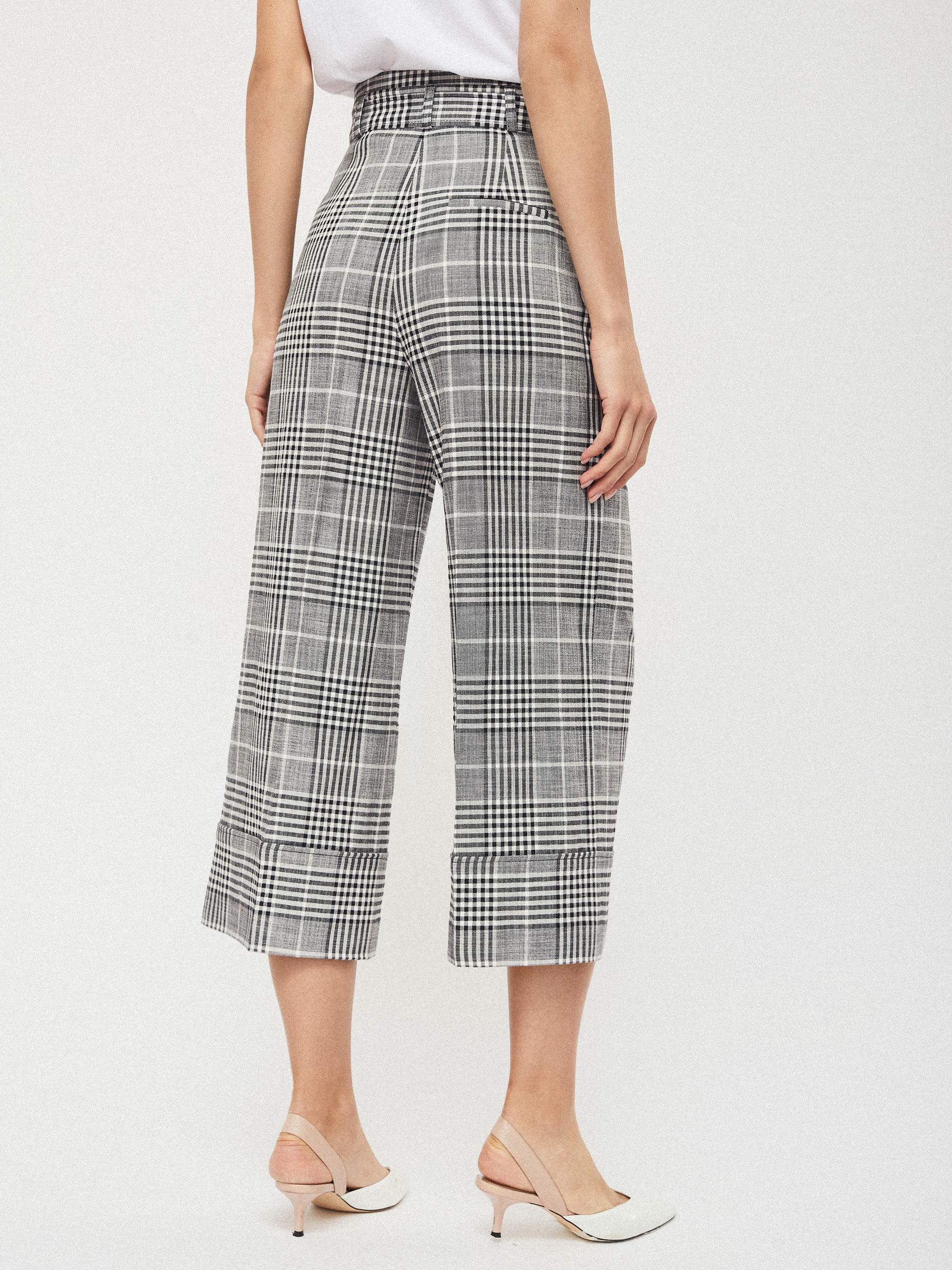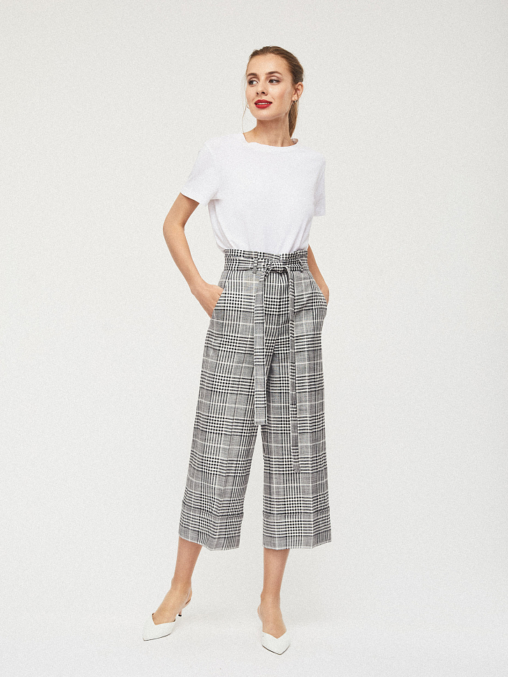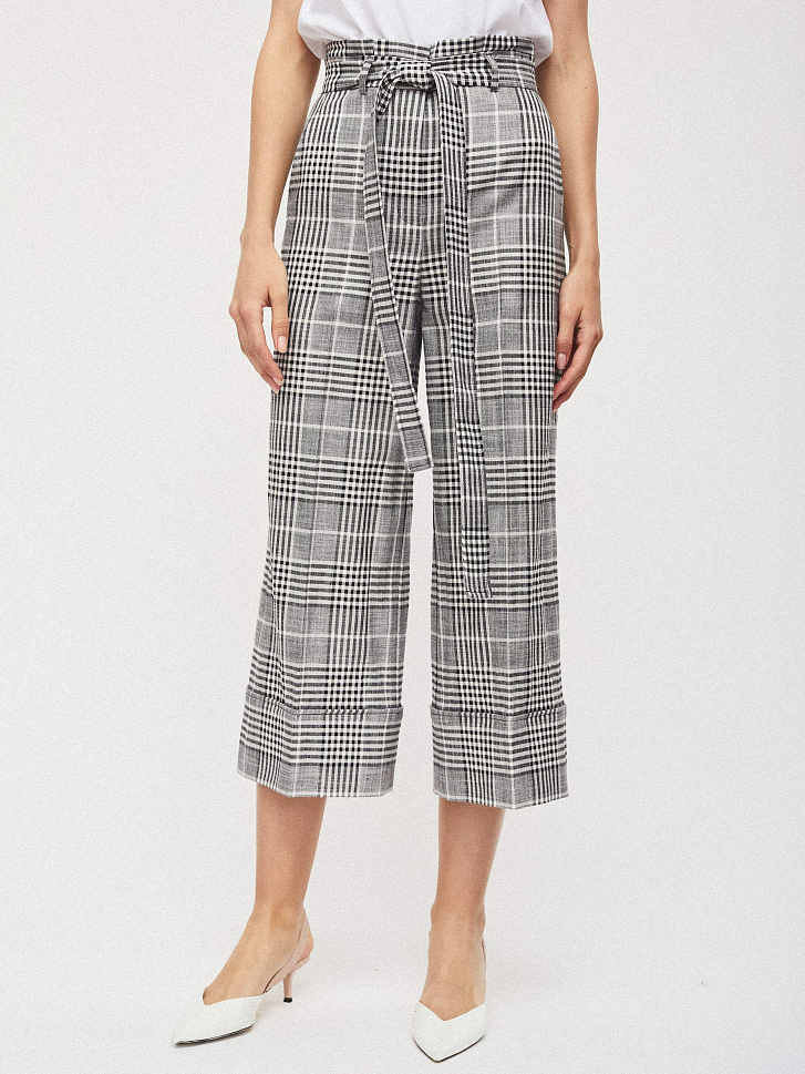 Брюки-кюлоты широкого кроя. Высокая посадка, пояс-хомут в тон основной ткани, прорезные карманы по бокам, декоративный карман сзади.