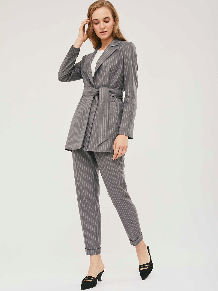 Брюки из поливискозы с завышенной талией и широким съёмным поясом в цвет из основной ткани с круглой металлической пряжкой.  Изделие с карманами с отрезным бочком и защипами спереди. Брючины с зашитыми отворотами. Сзади ложный прорезной карман с листочкой. Застёжка на молнию и крючки скрытые планкой.  Изделие без подкладки.  Рост модели 173 см, размер 42 (российский)