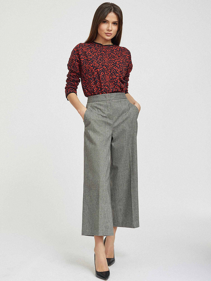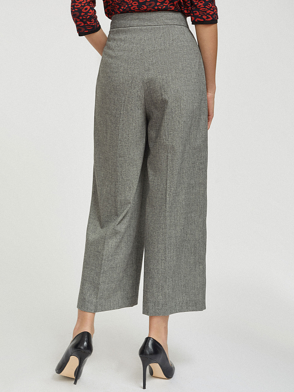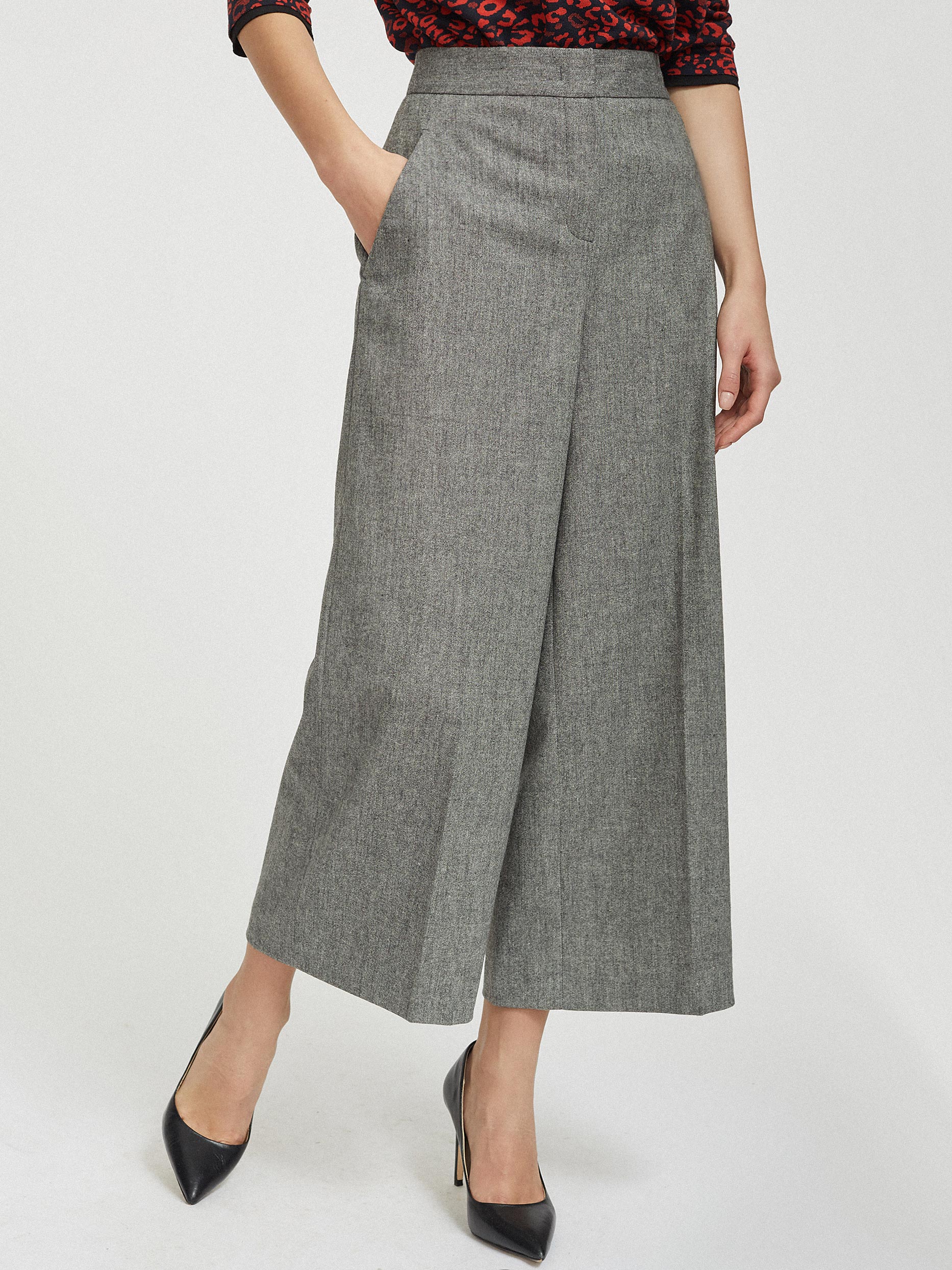Однотонные кюлоты, выполненные из смесовой шерсти. Высокая посадка, втачной пояс, прорезные карманы по бокам.