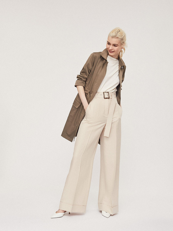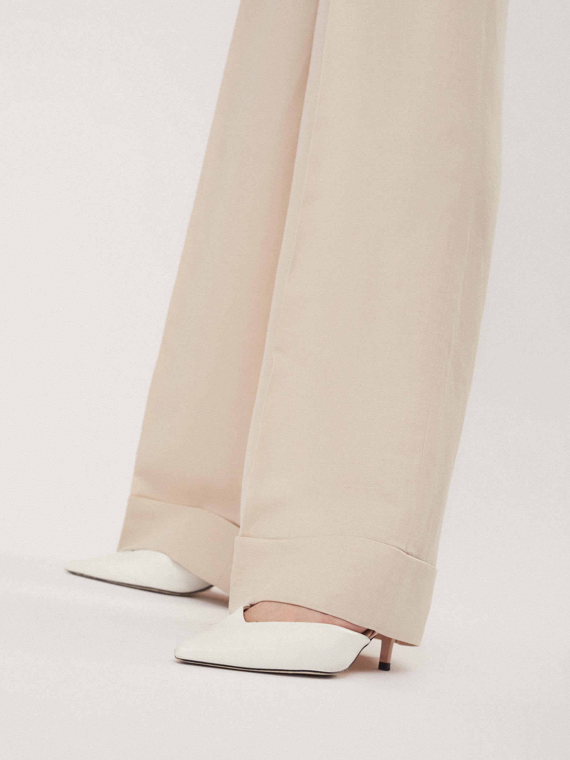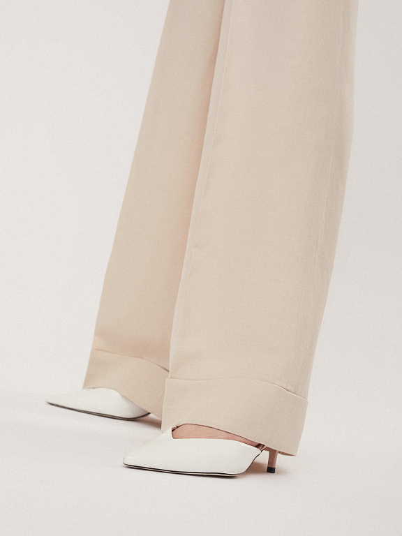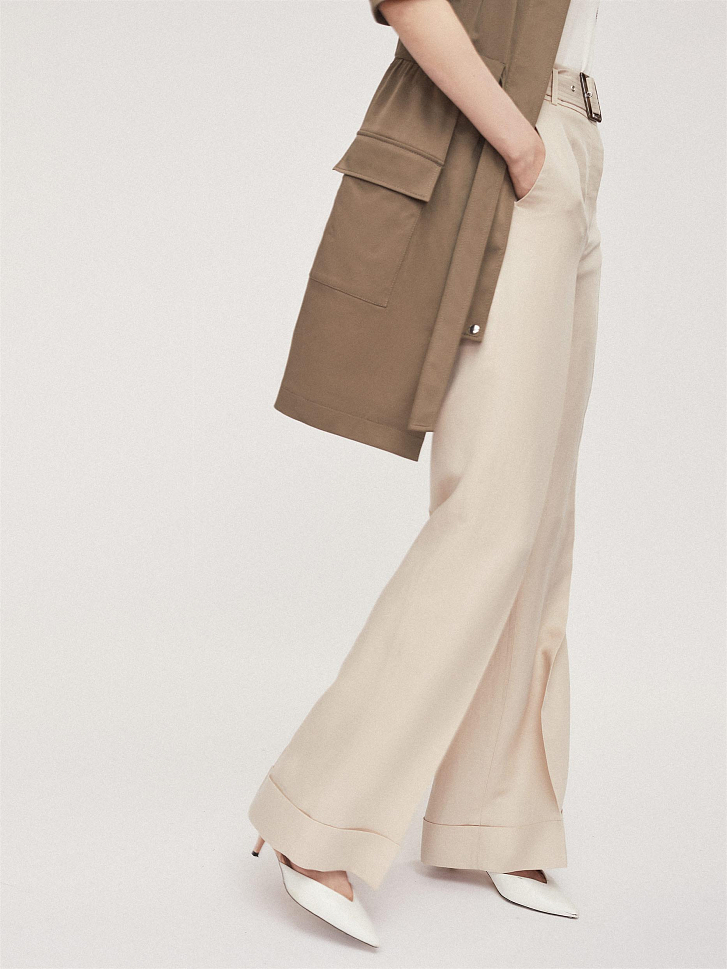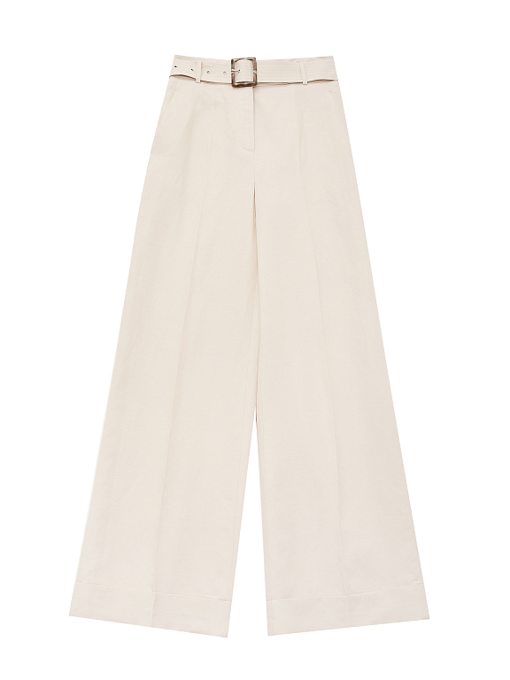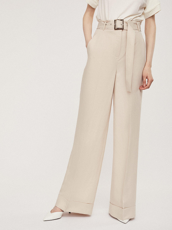 Брюки широкого кроя из смесового льна на талии с поясом в тон и боковыми карманами. Низ брюк с отворотами.