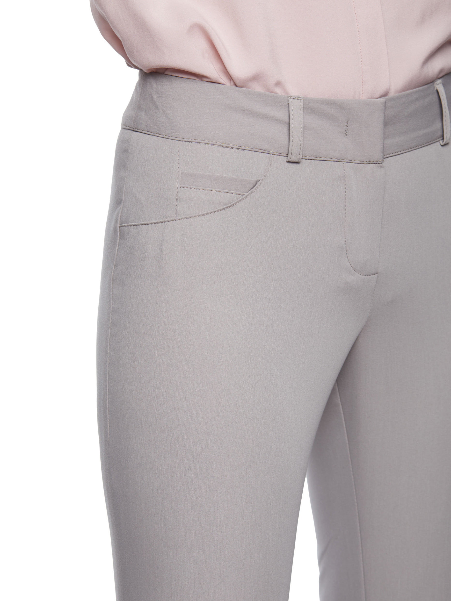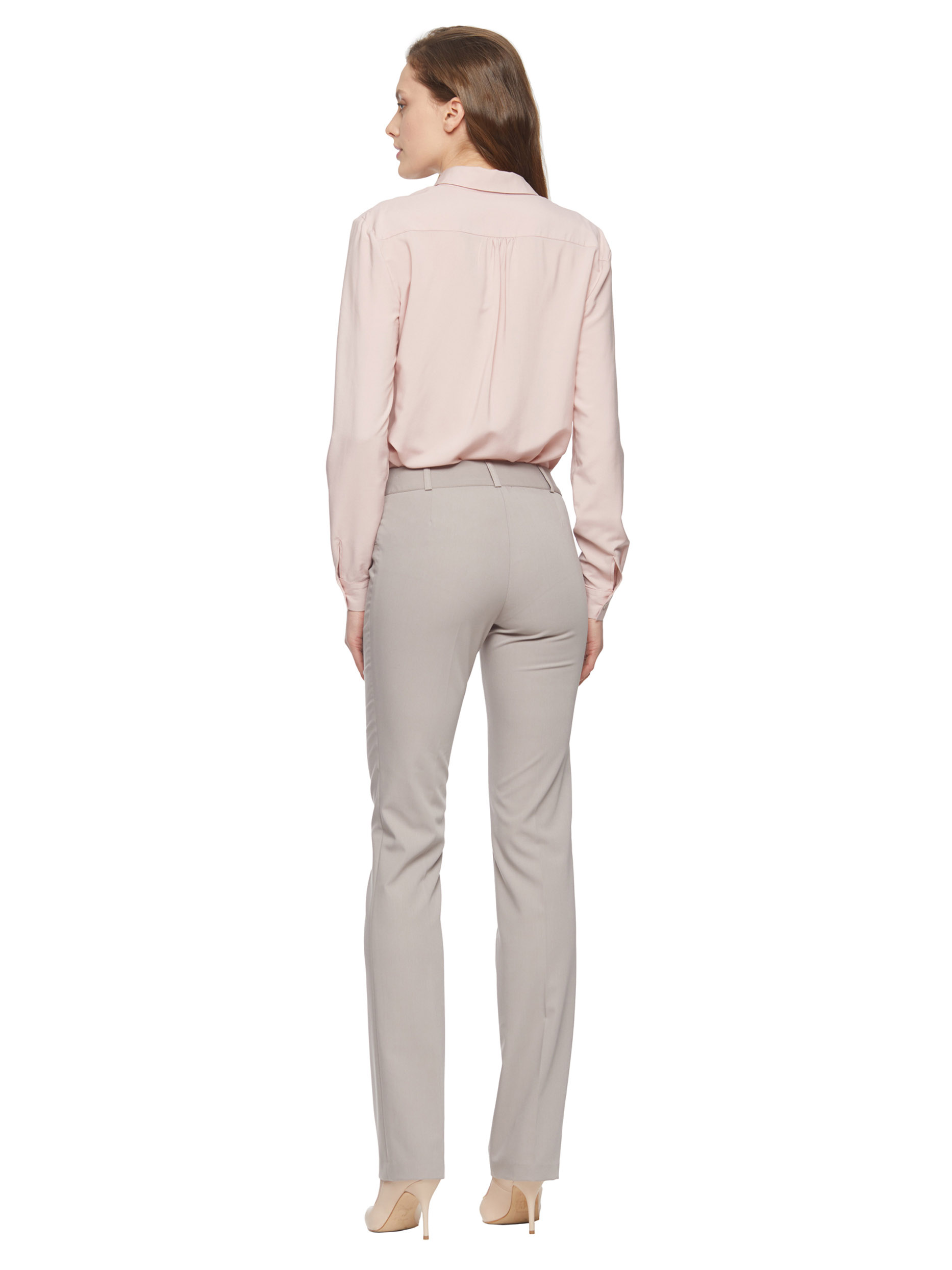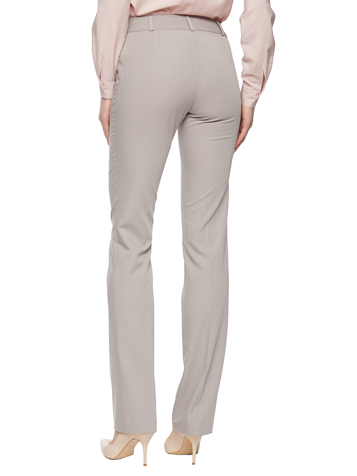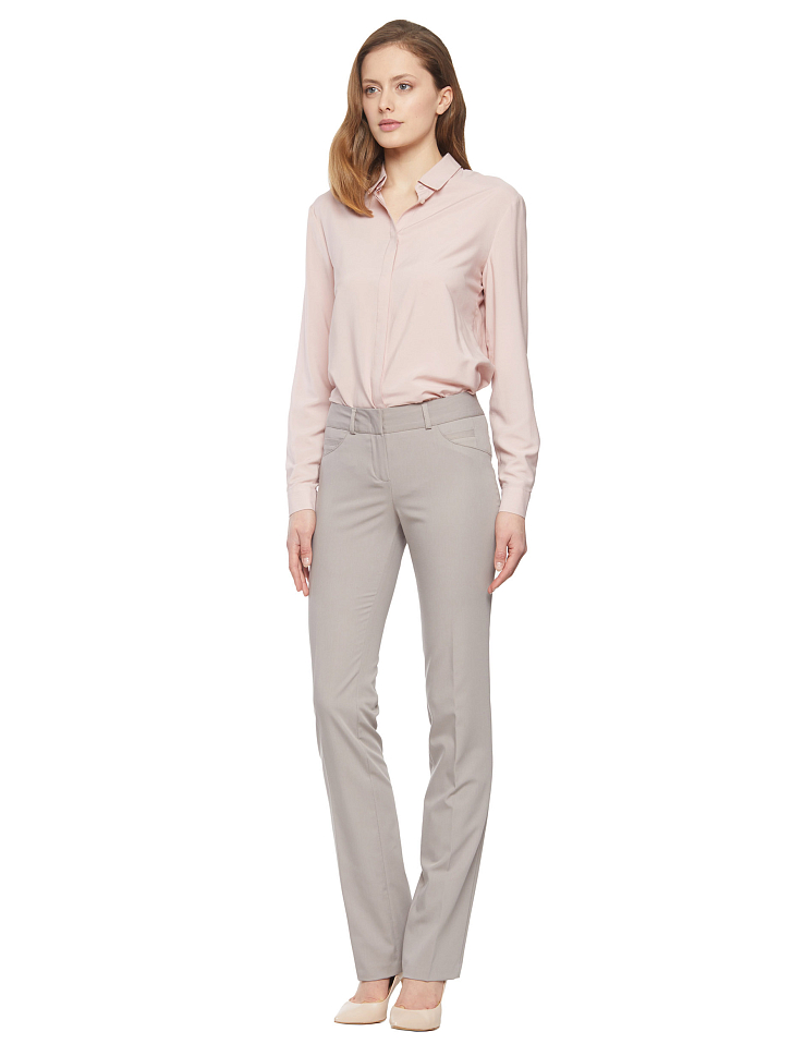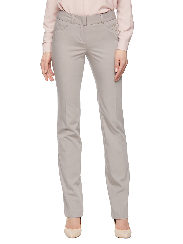Брюки прямого кроя со стрелками. Средняя посадка, прорезные карманы по бокам, втачной пояс, шлевки.