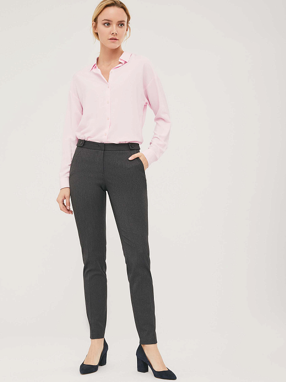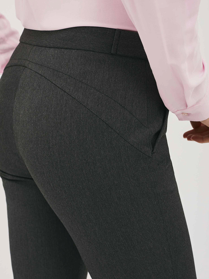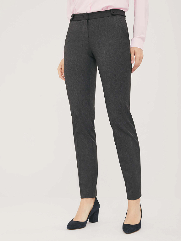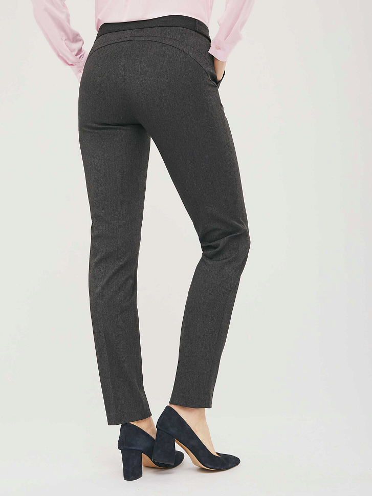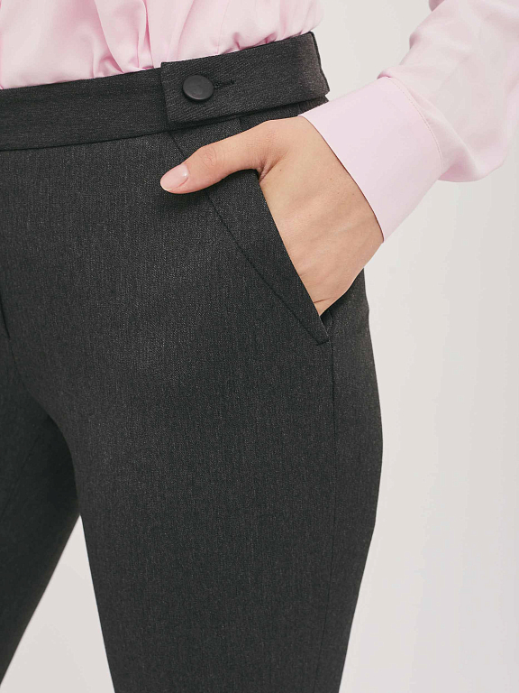 Однотонные брюки из эластичной ткани. Облегающий силуэт, средняя посадка, втачной пояс с планками на пуговицах, боковые карманы.