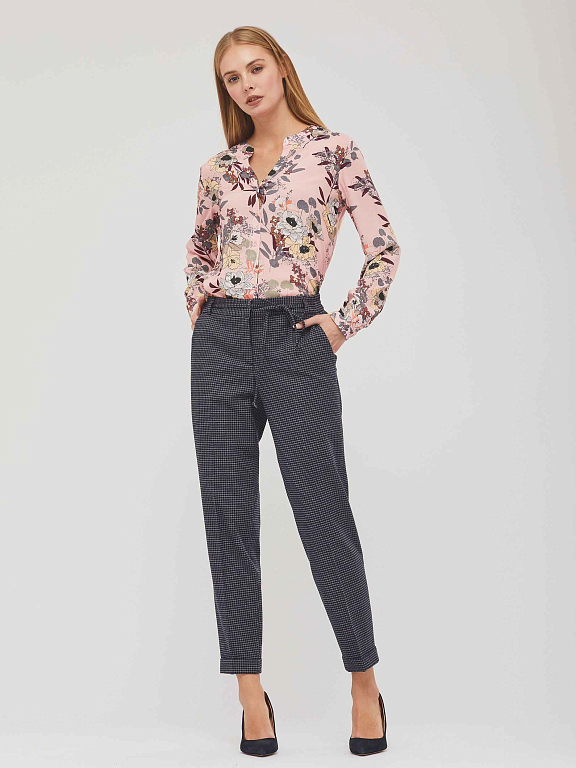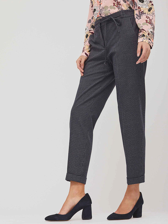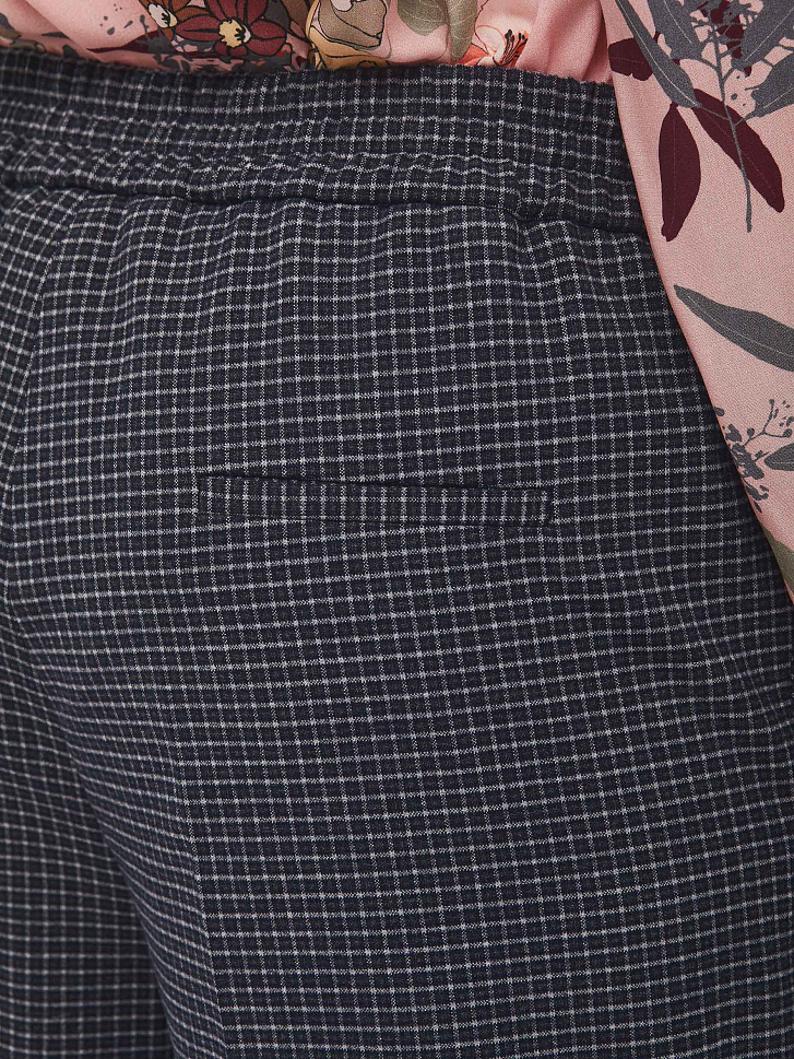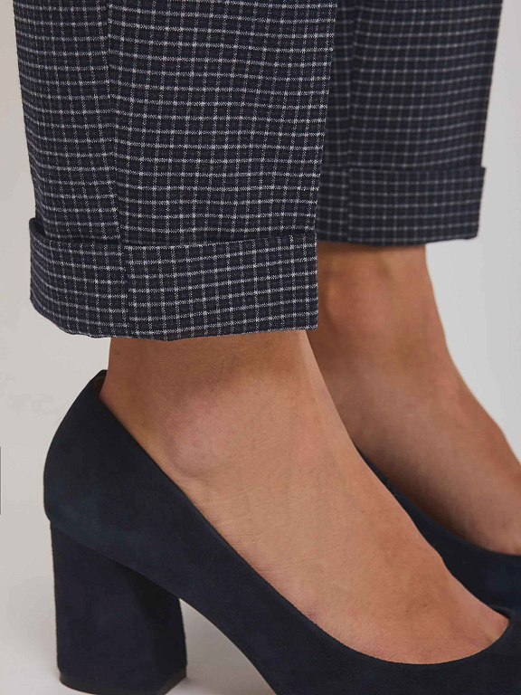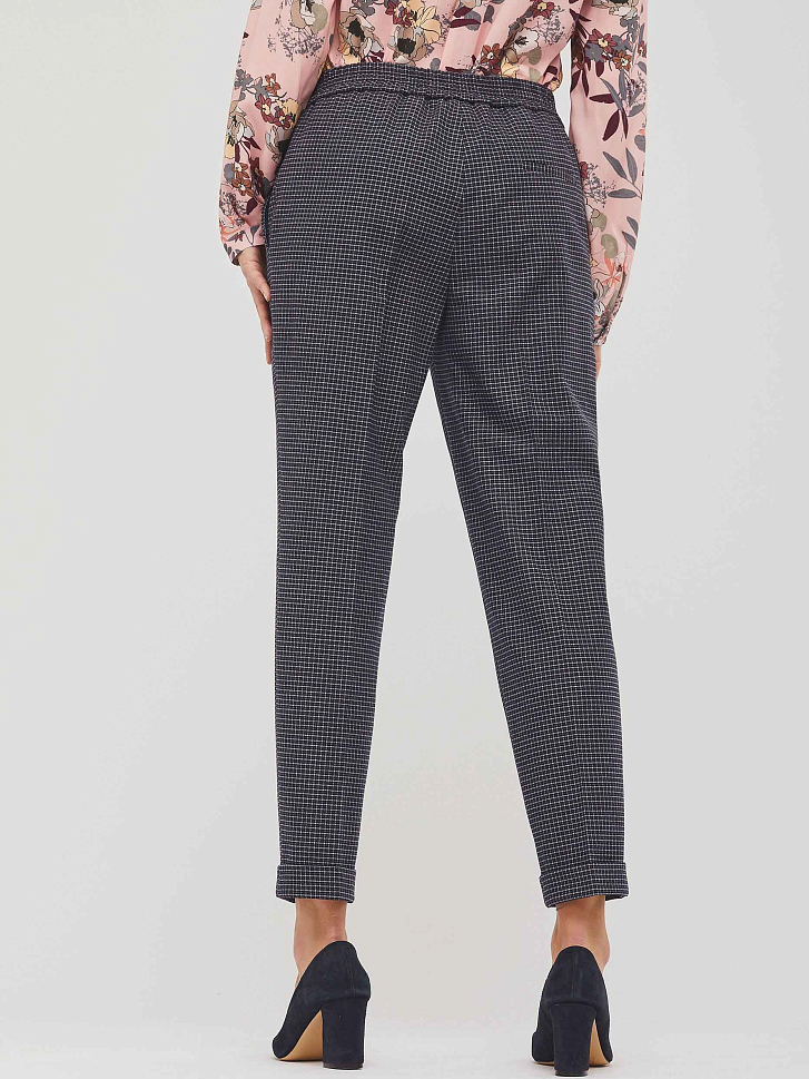 Зауженные брюки средней посадки в клетку. Изделие с заглаженными стрелками, боковыми карманами и тонким поясом на бант. Брючины с зашитыми отворотами снизу. Сзади ложный прорезной карман с листочкой. Застёжка на крючок, молнию и пуговицу. Изделие без подкладки.  Рост модели 173 см, размер 42 (российский). Плотность ткани: 270 г/м2
