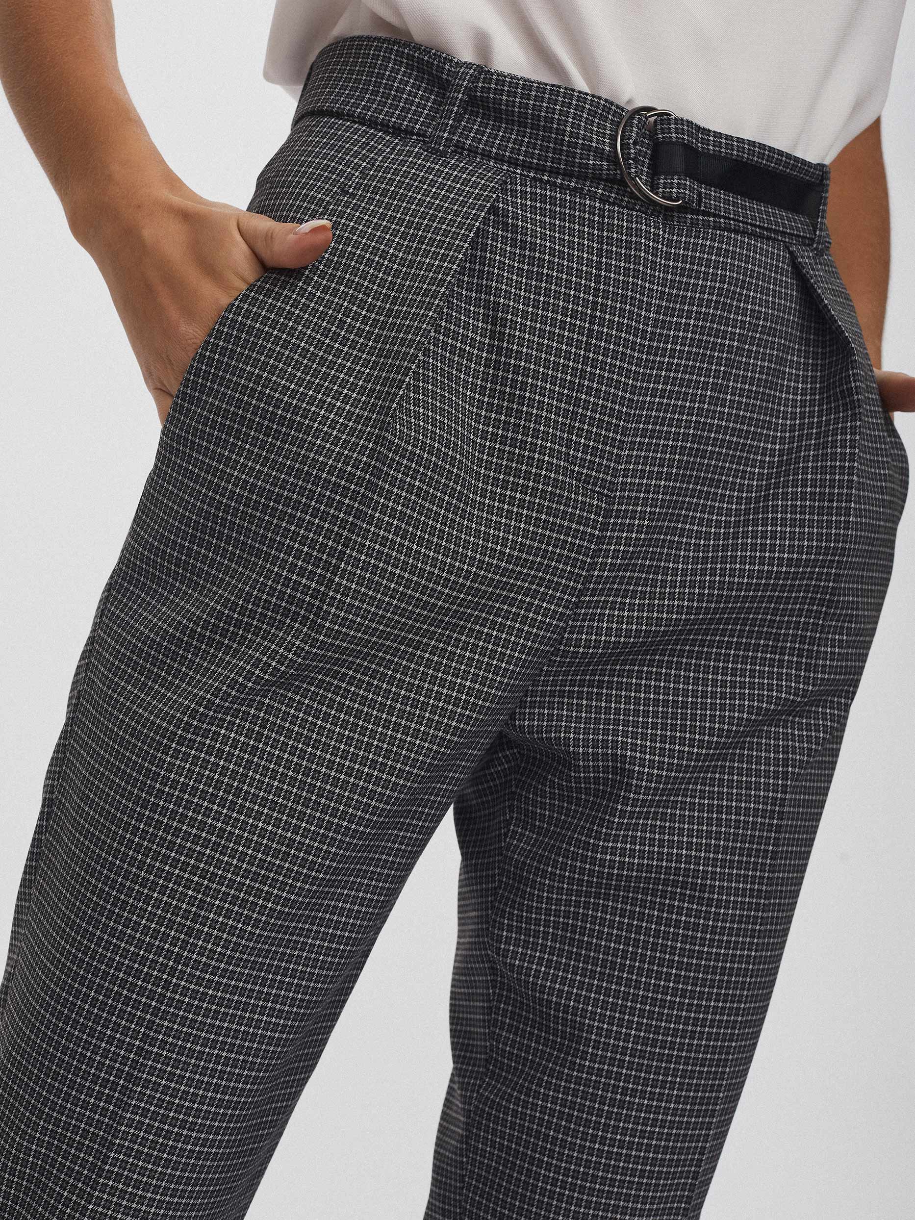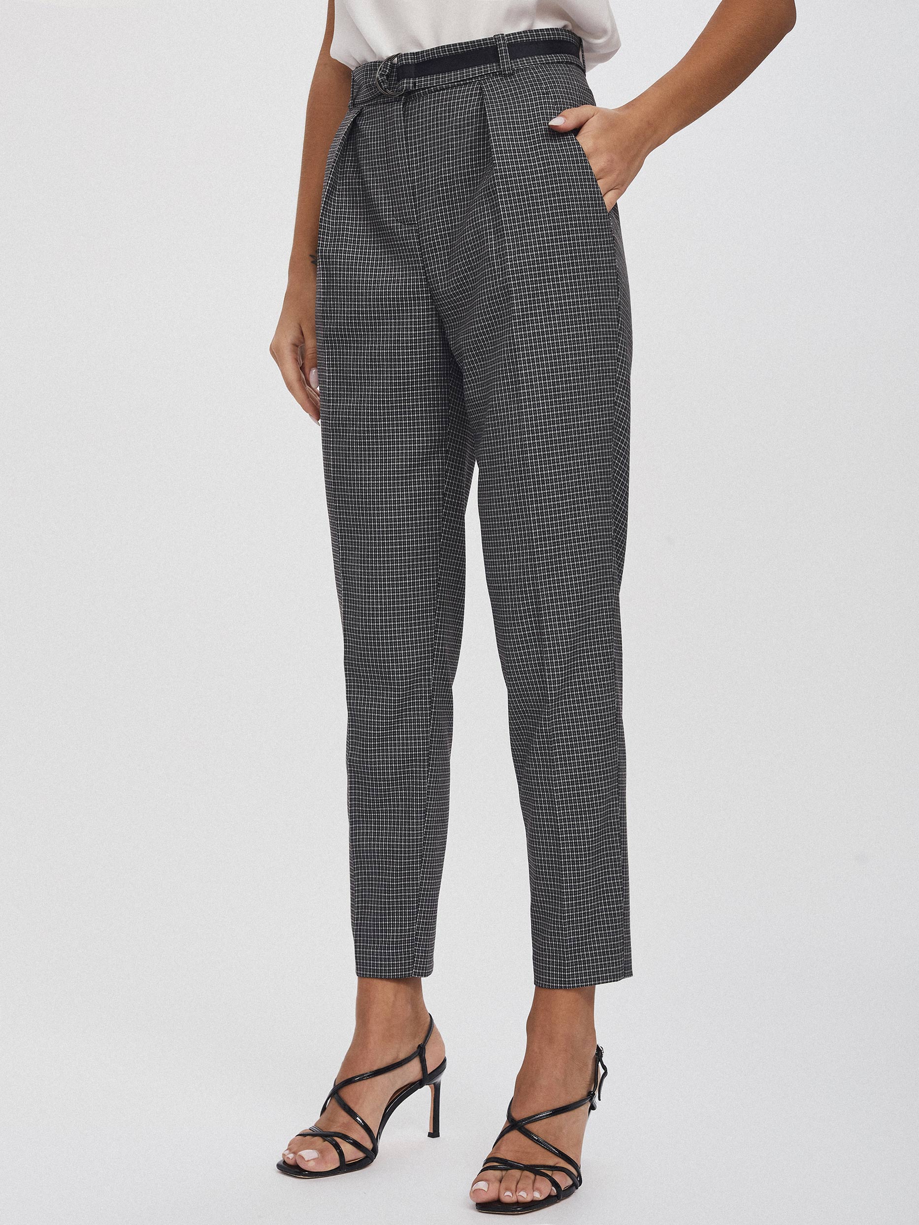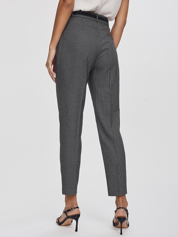 Брюки зауженного кроя, выполненные из смесовой вискозы. Высокая посадка, съемный пояс с контрастной лентой, защипы, прорезные карманы по бокам.