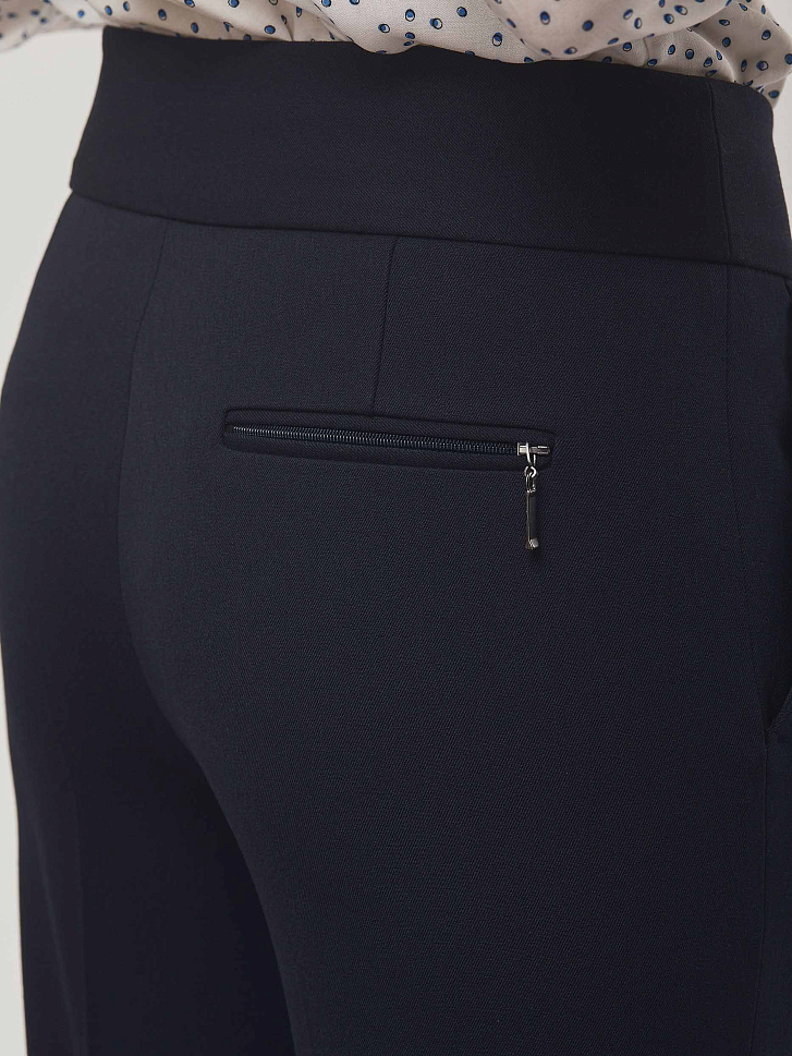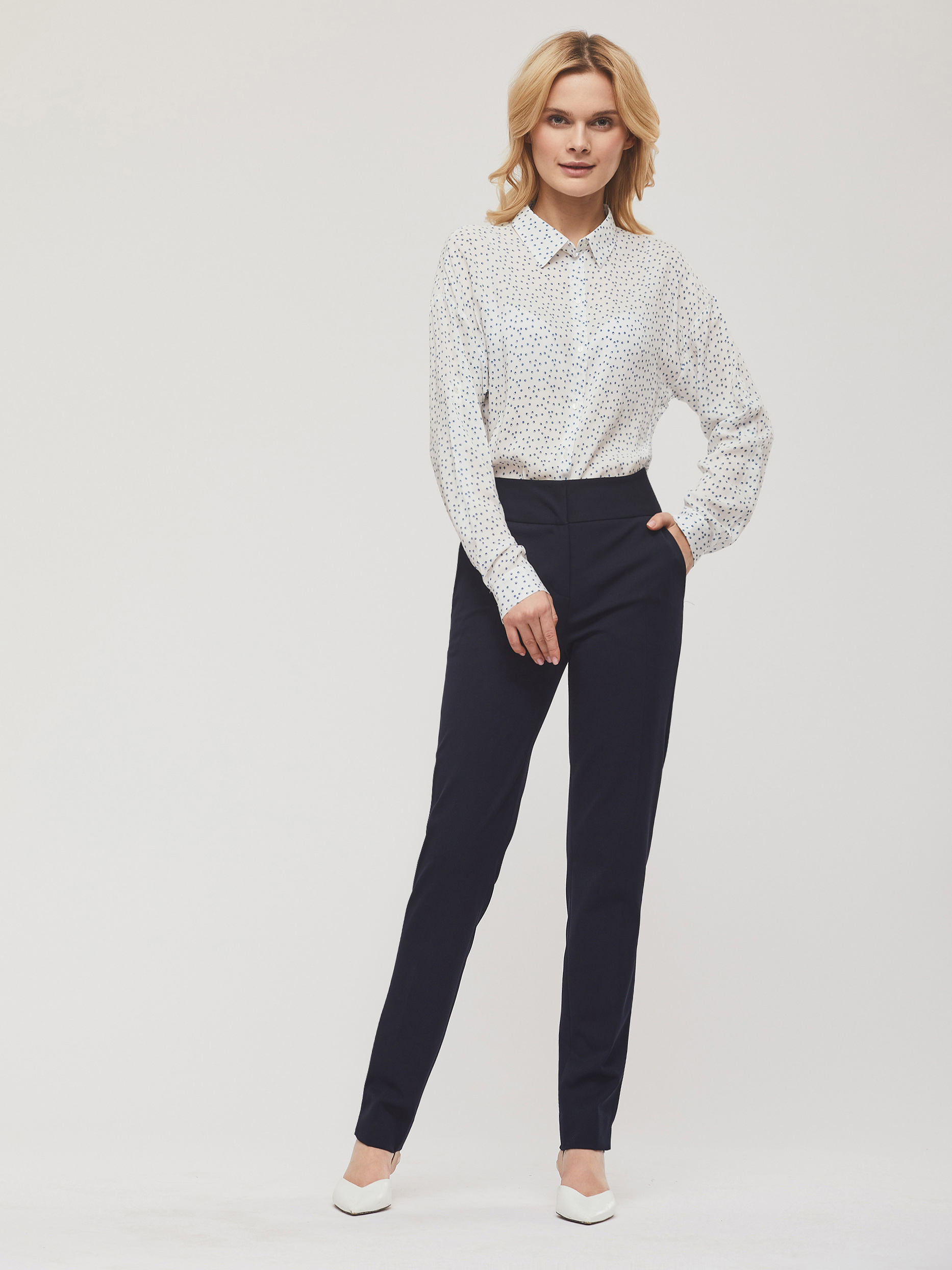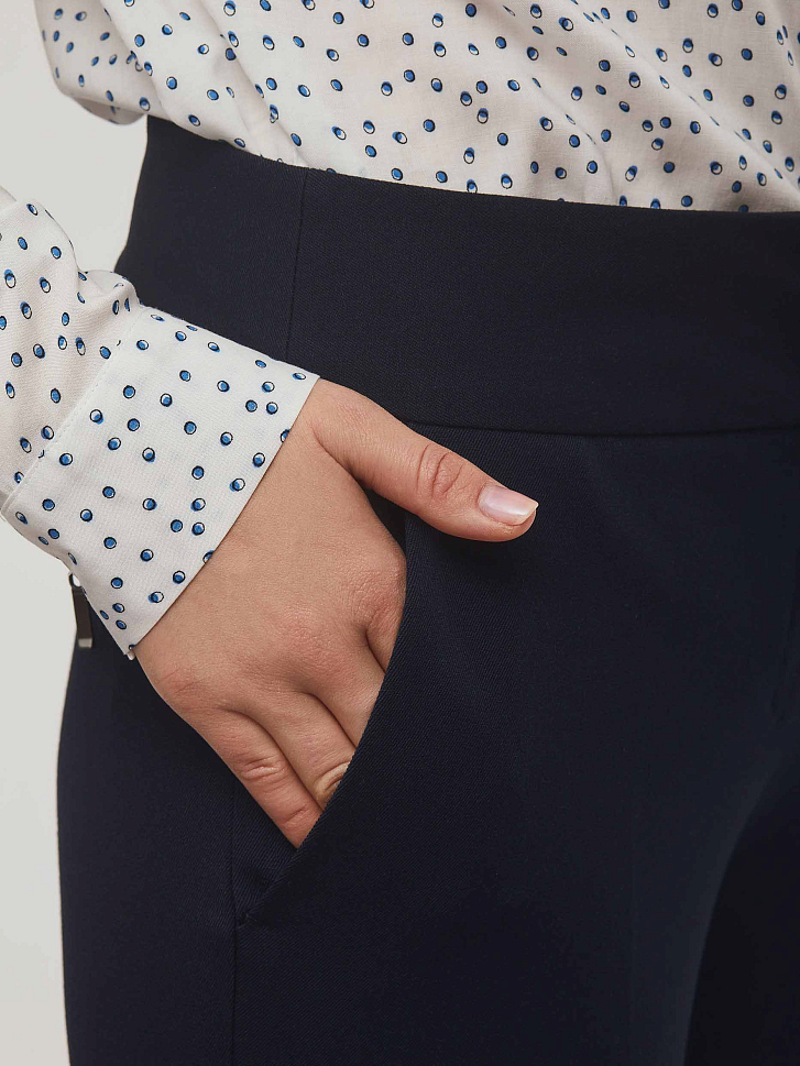 Брюки зауженного кроя, выполненные из смесовой вискозы. Средняя посадка, широкий втачной пояс, прорезные карманы по бокам, декоративный карман на молнии сзади. Стрелки, разрезы по бокам нижнего края.