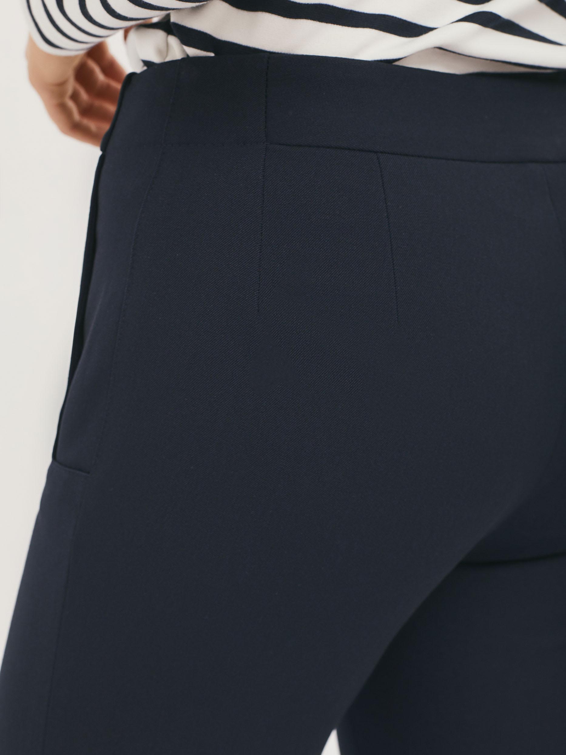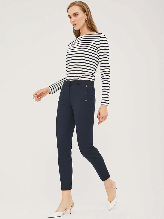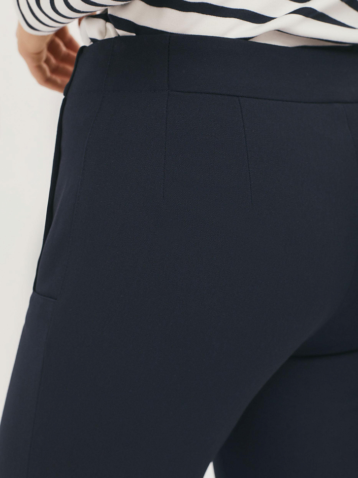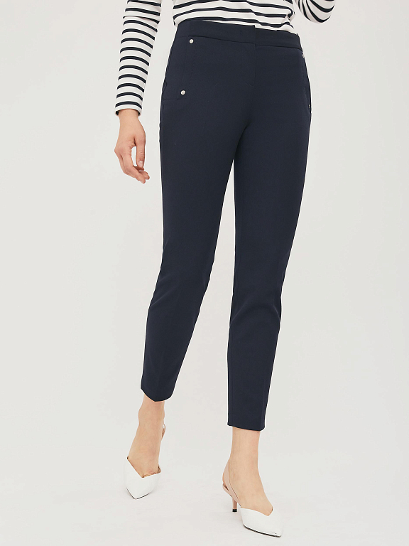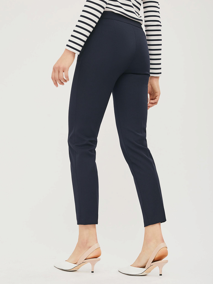 Зауженные брюки из плотной поливискозы с ложными  карманами с листочкой и металлическими хольнитенами. Брюки с отделочной строчкой в цвет. Изделие  застёгивается на молнию и крючки, скрытые планкой. Изделие без подкладки. Рост модели 172 см, размер 42 (российский)