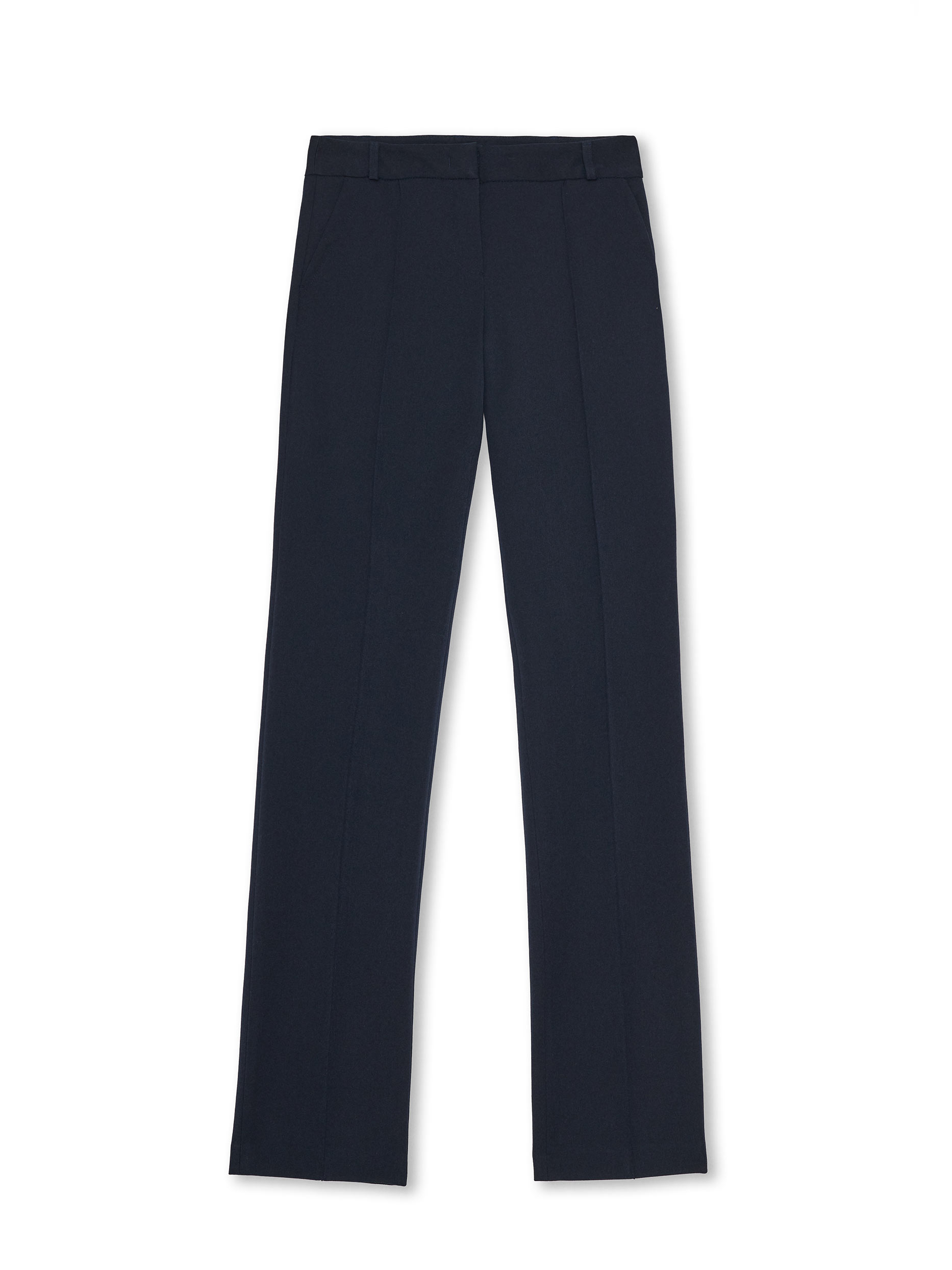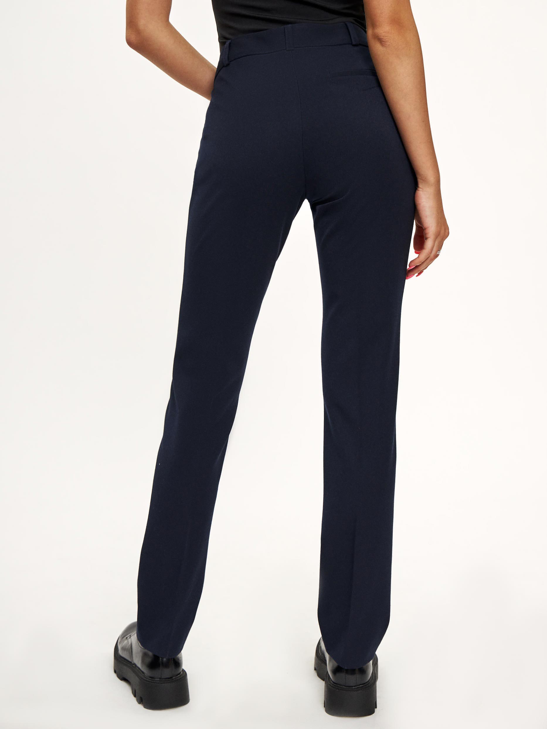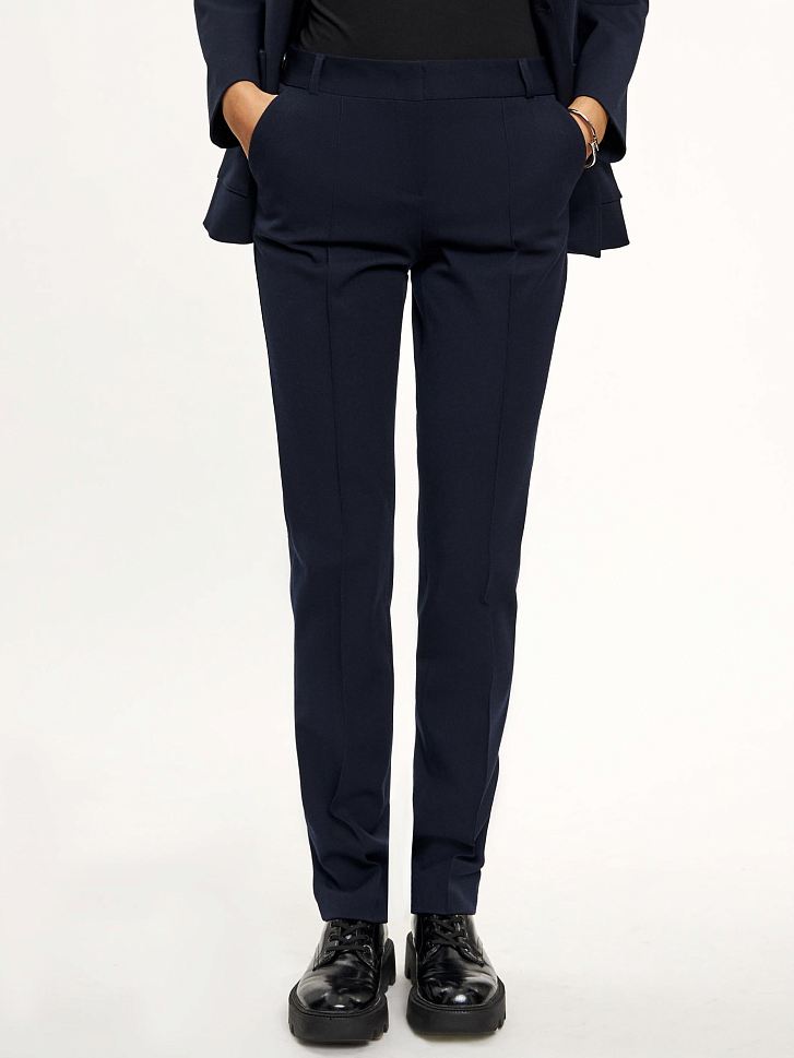 Брюки средней посадки из плотной ткани. Прямые брючины с застроченными стрелками и с прорезными карманами с отрезным бочком. На поясе есть шлёвки для ремня. Сзади ложный прорезной карман с листочкой с декоративной отстрочкой. Изделие без подкладки. Рост модели 175 см, размер 42 (российский)