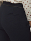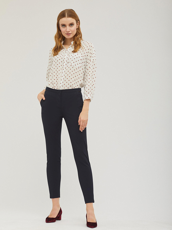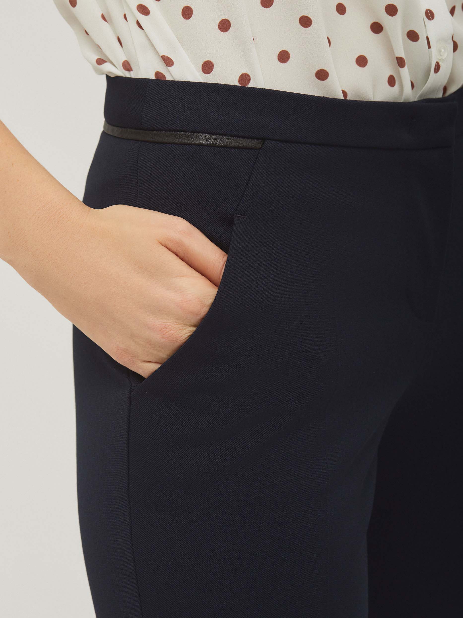 Зауженные брюки из плотной поливискозы с  кожаным кантом по поясу и карманами с отрезным бочком. Брючины с заглаженными стрелками. Сзади ложный карман с листочкой. Изделие без подкладки.  Рост модели 172 см, размер 42 (российский)