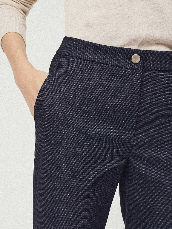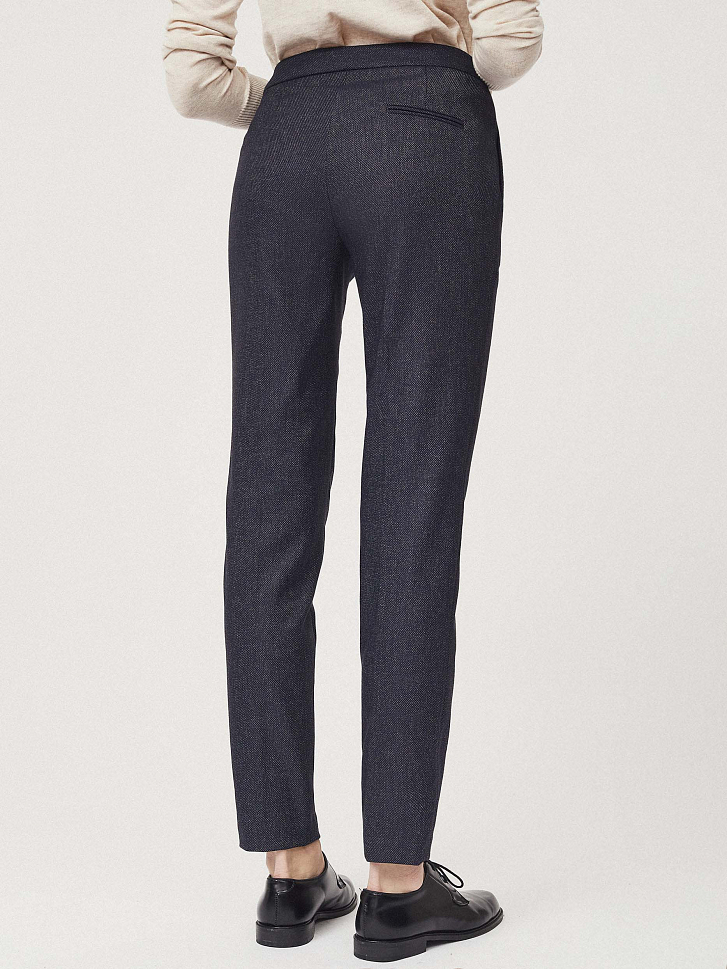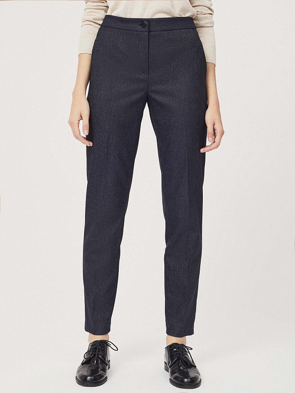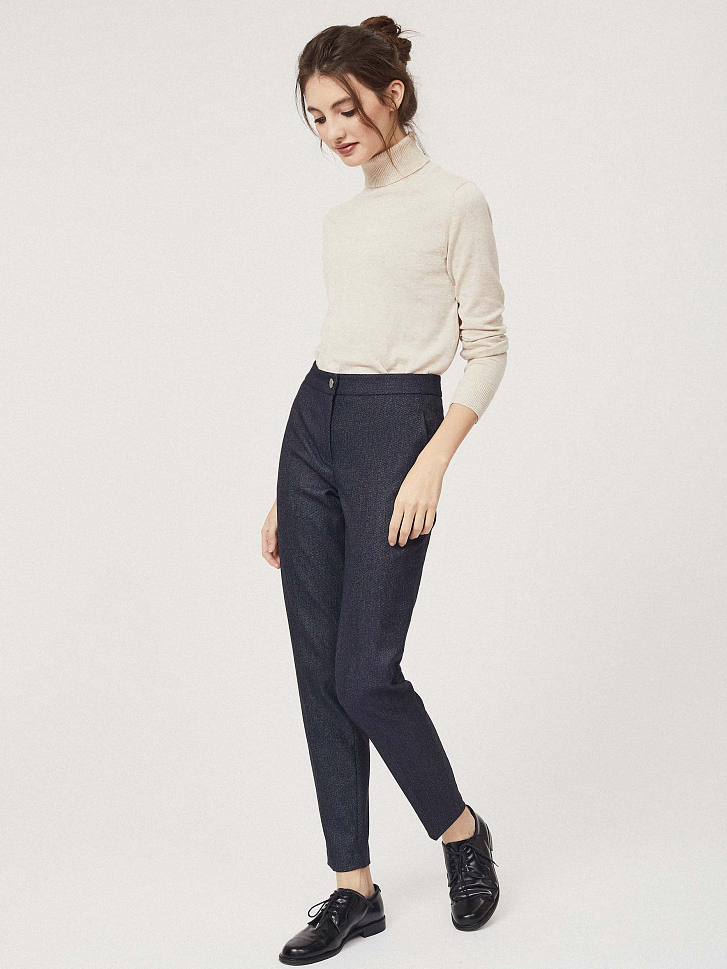 Брюки зауженного кроя с имитацией денима. Средняя посадка, прорезные карманы по бокам, декоративный карман сзади.