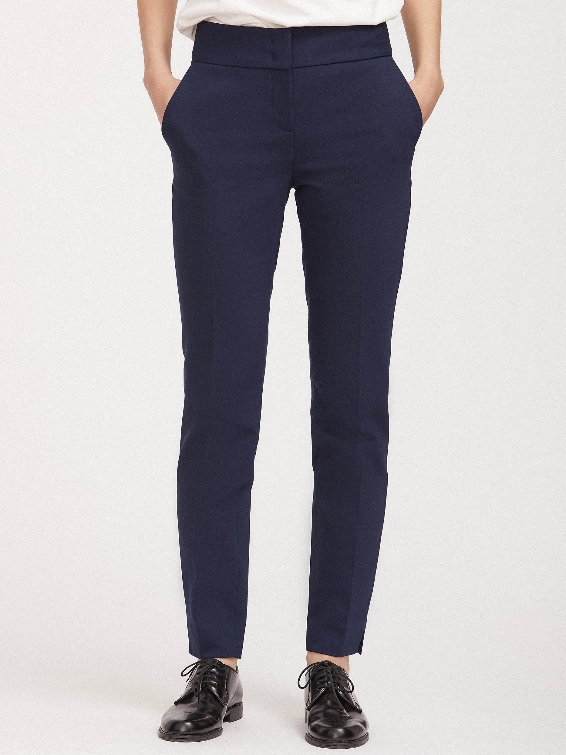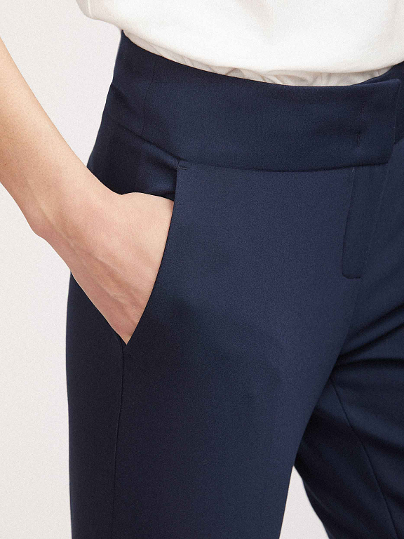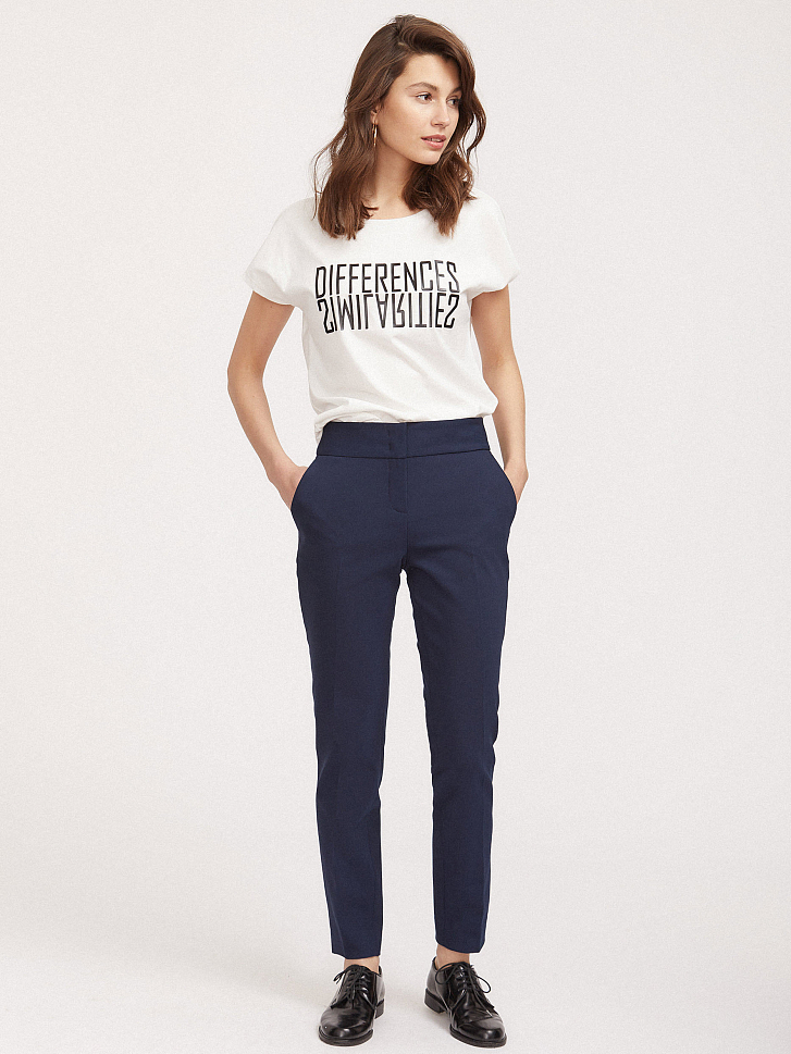 Однотонные брюки зауженного кроя, выполненные из смесового хлопка. Высокая посадка, широкий втачной пояс, прорезные карманы по бокам, декоративный карман на молнии сзади. Стрелки, разрезы по бокам нижнего края.