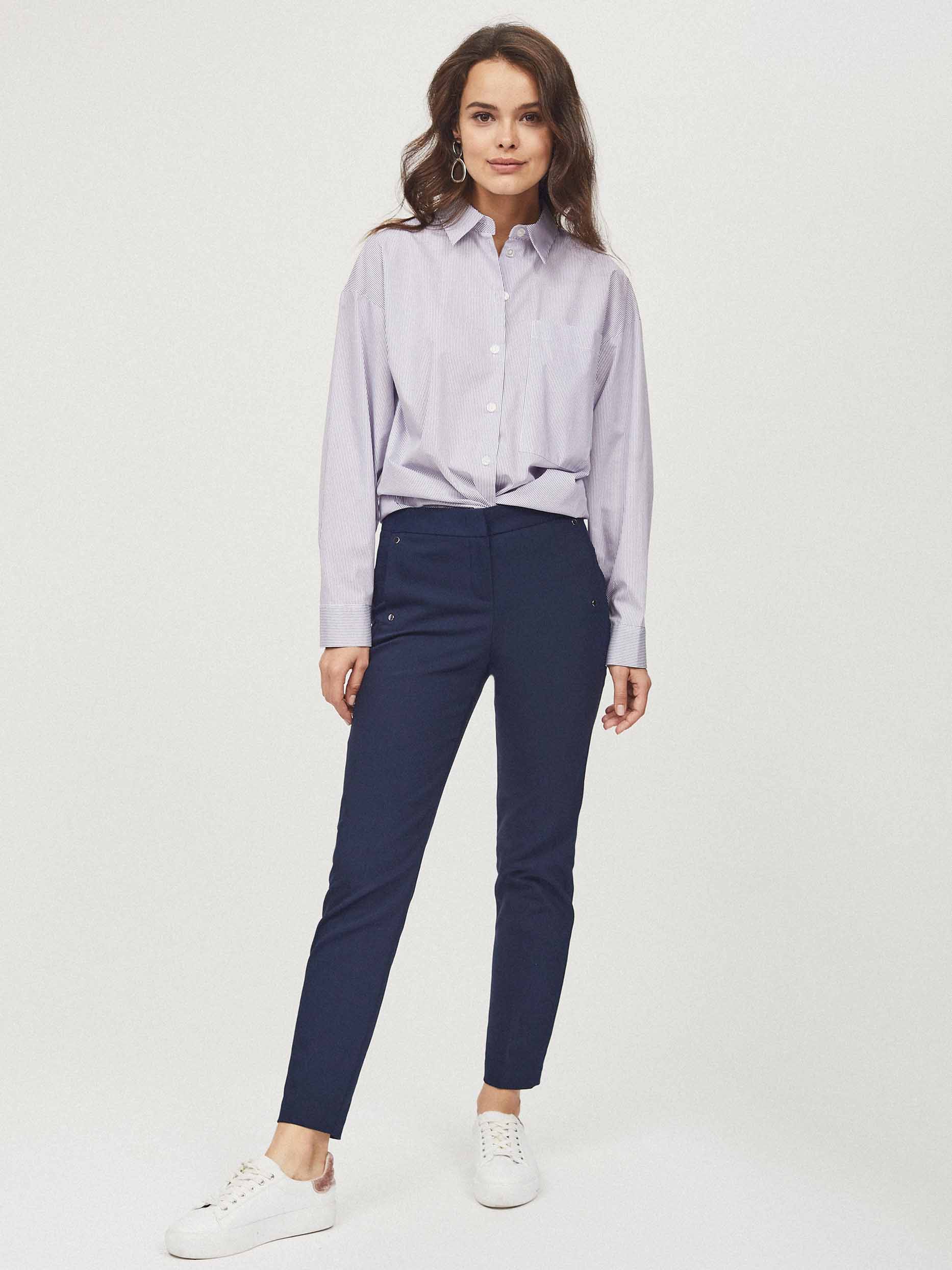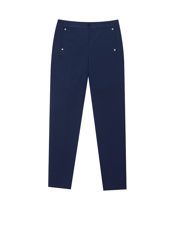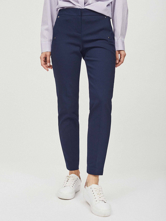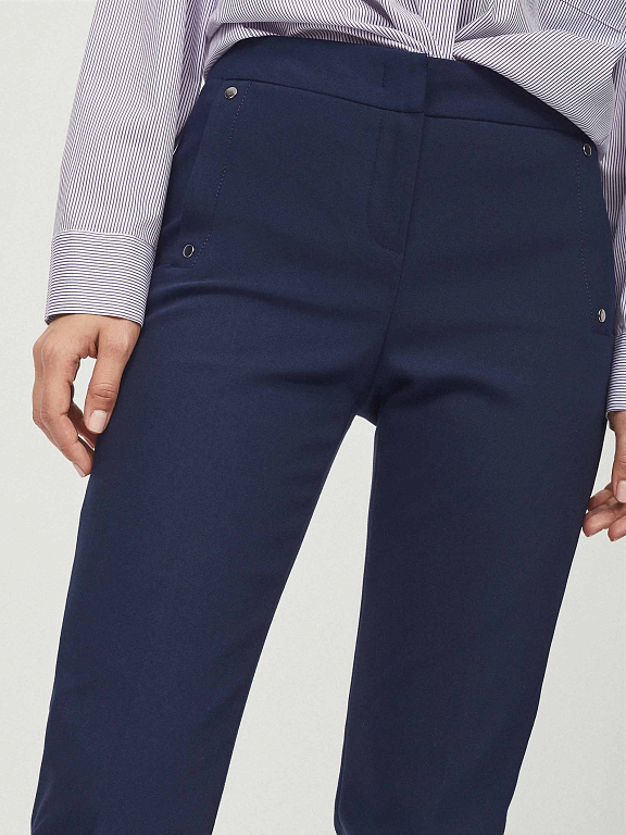 Укороченные брюки зауженного кроя. Средняя посадка, втачной пояс, прорезные карманы по бокам с декоративными заклепками.