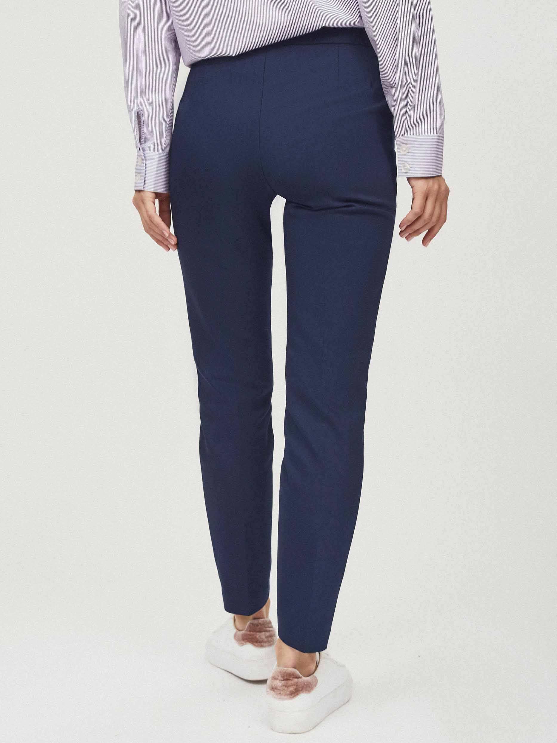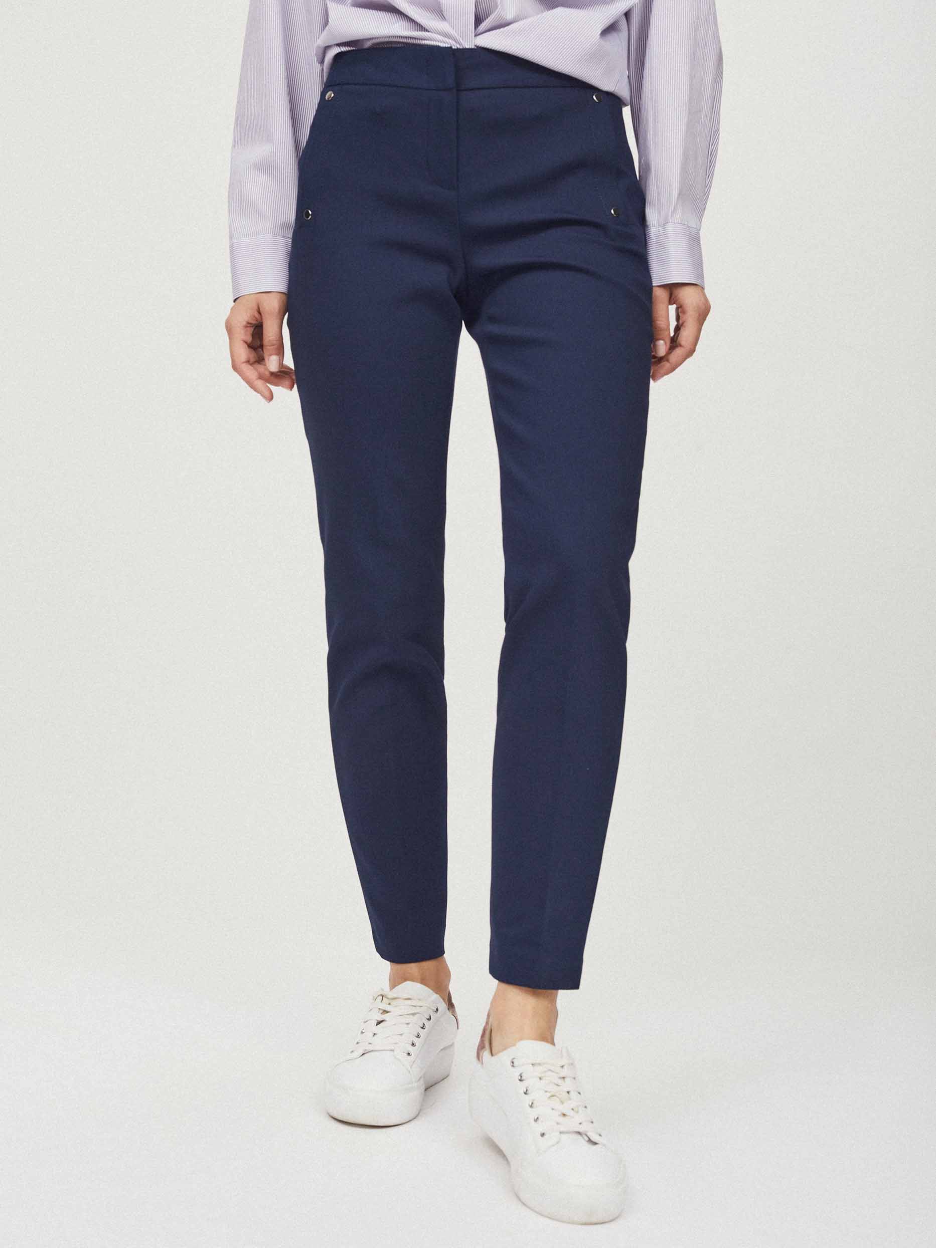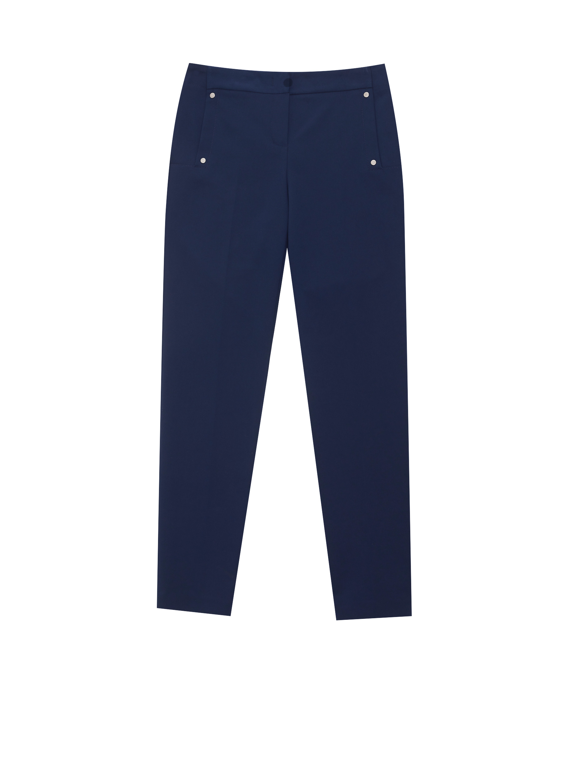 Укороченные брюки зауженного кроя. Средняя посадка, втачной пояс, прорезные карманы по бокам с декоративными заклепками.