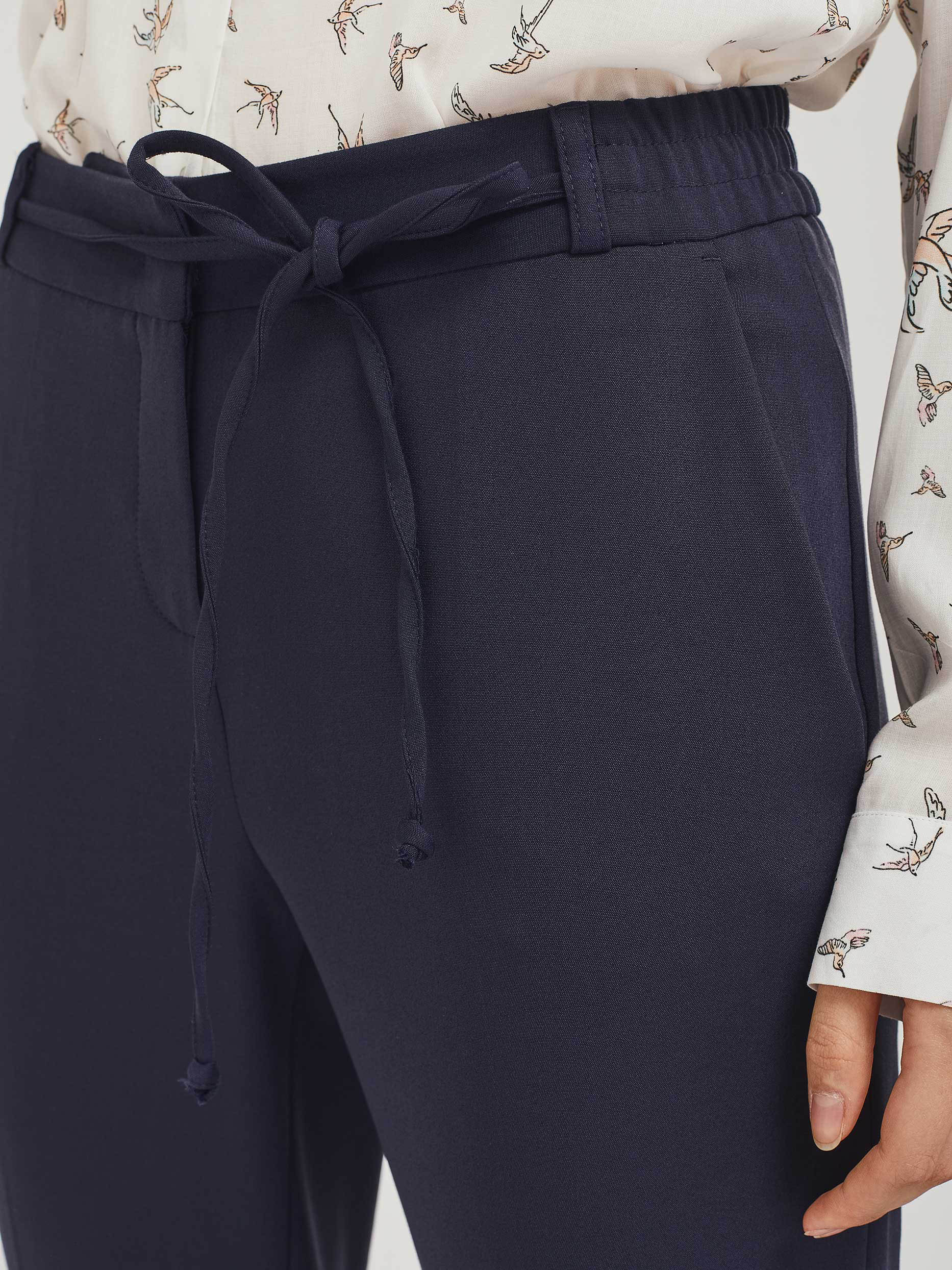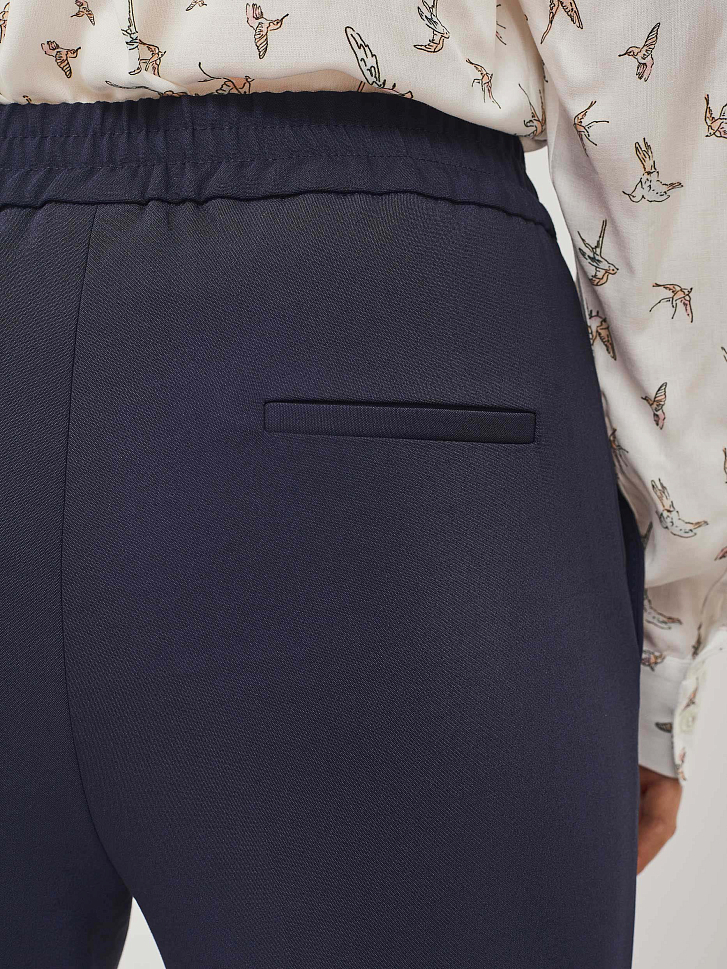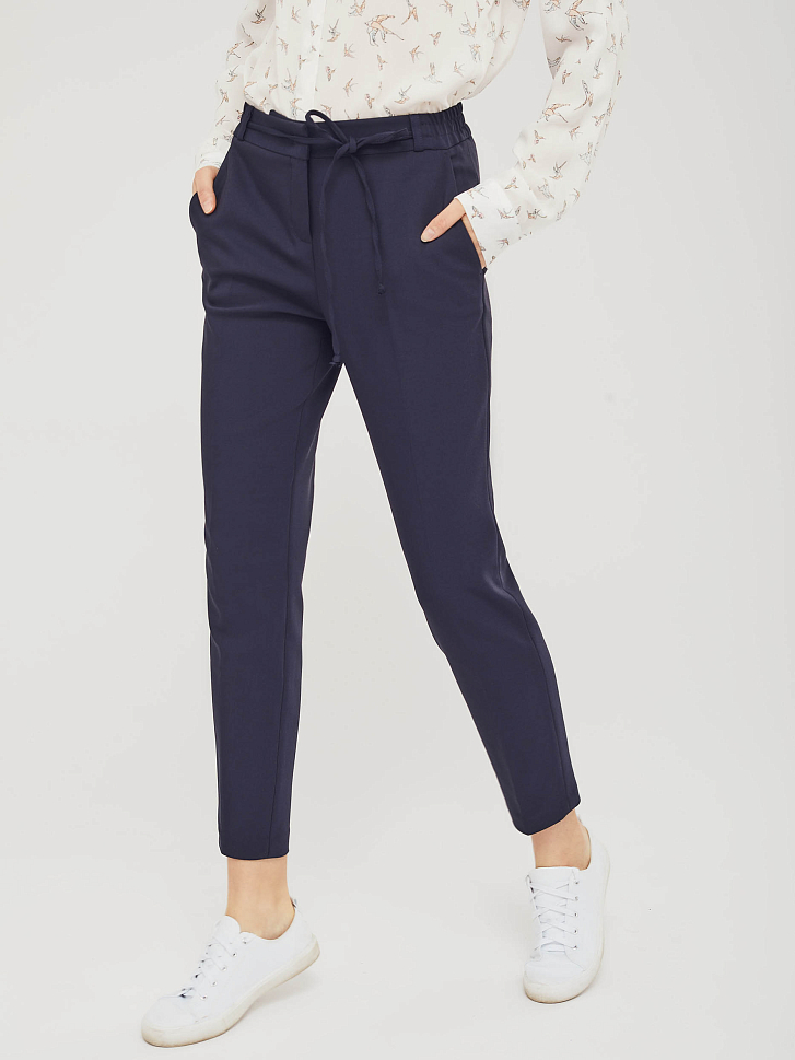 Однотонные брюки зауженного кроя из смесового хлопка. Средняя посадка, эластичный пояс с завязками, боковые карманы, декоративный карман сзади.