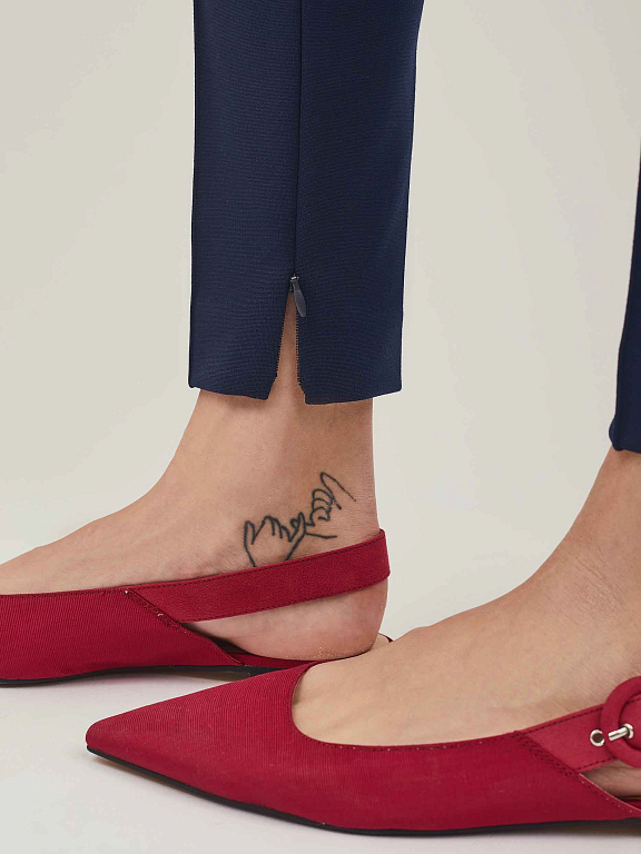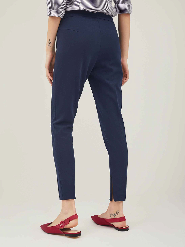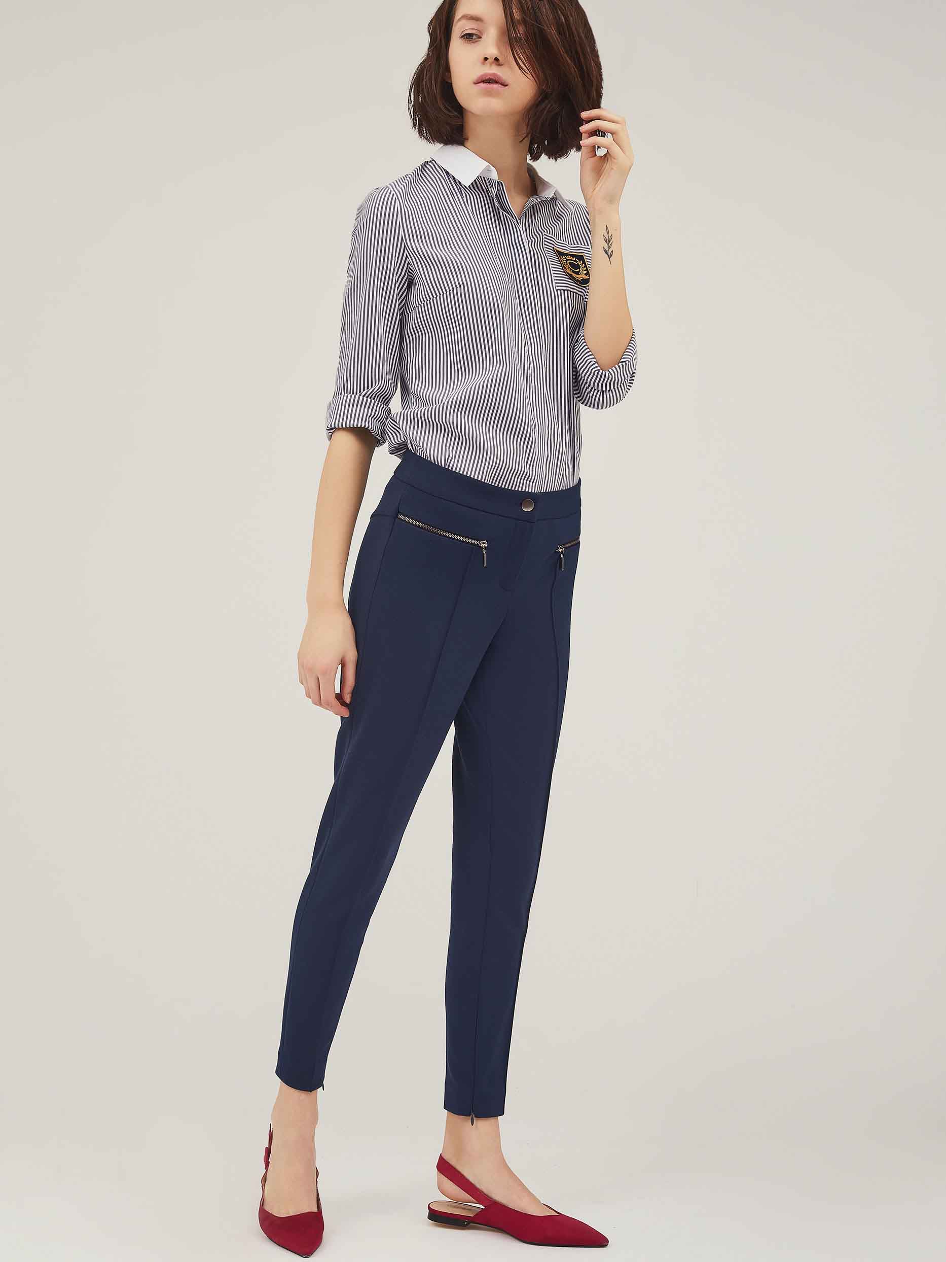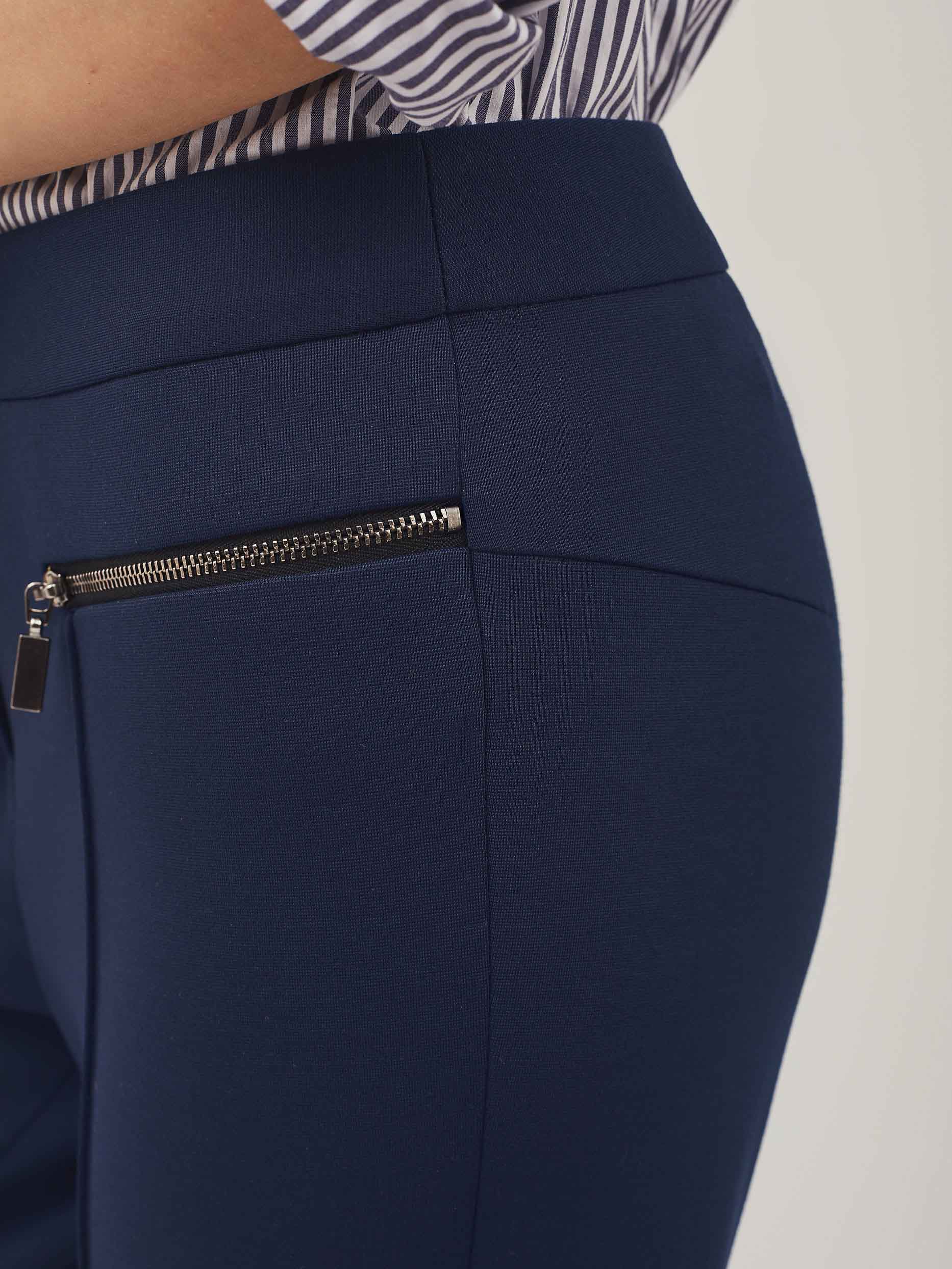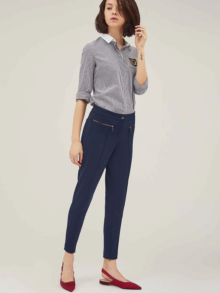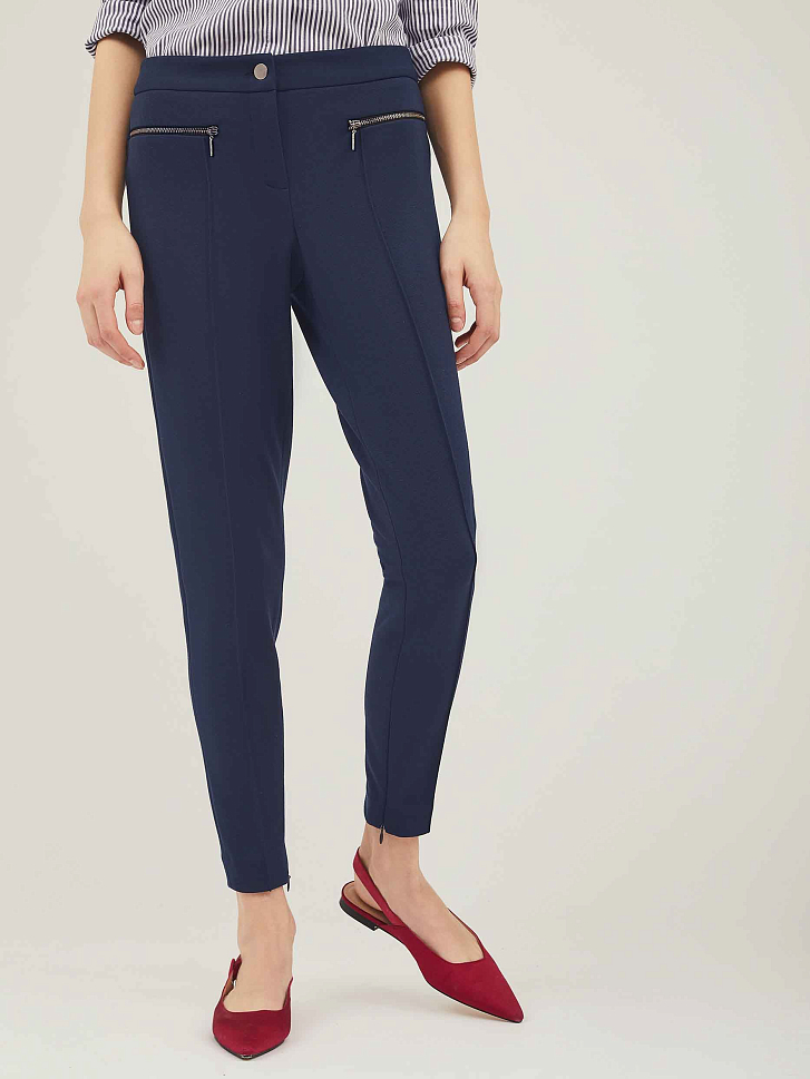 Брюки силуэта слим из эластичной трикотажной ткани с застроченными стрелками спереди.  Брюки с ложными карманами с металлическими молниями. Брючины снизу с потайными молниями в боковых швах. Изделие без подкладки.  Рост модели 177 см, размер 42 (российский)