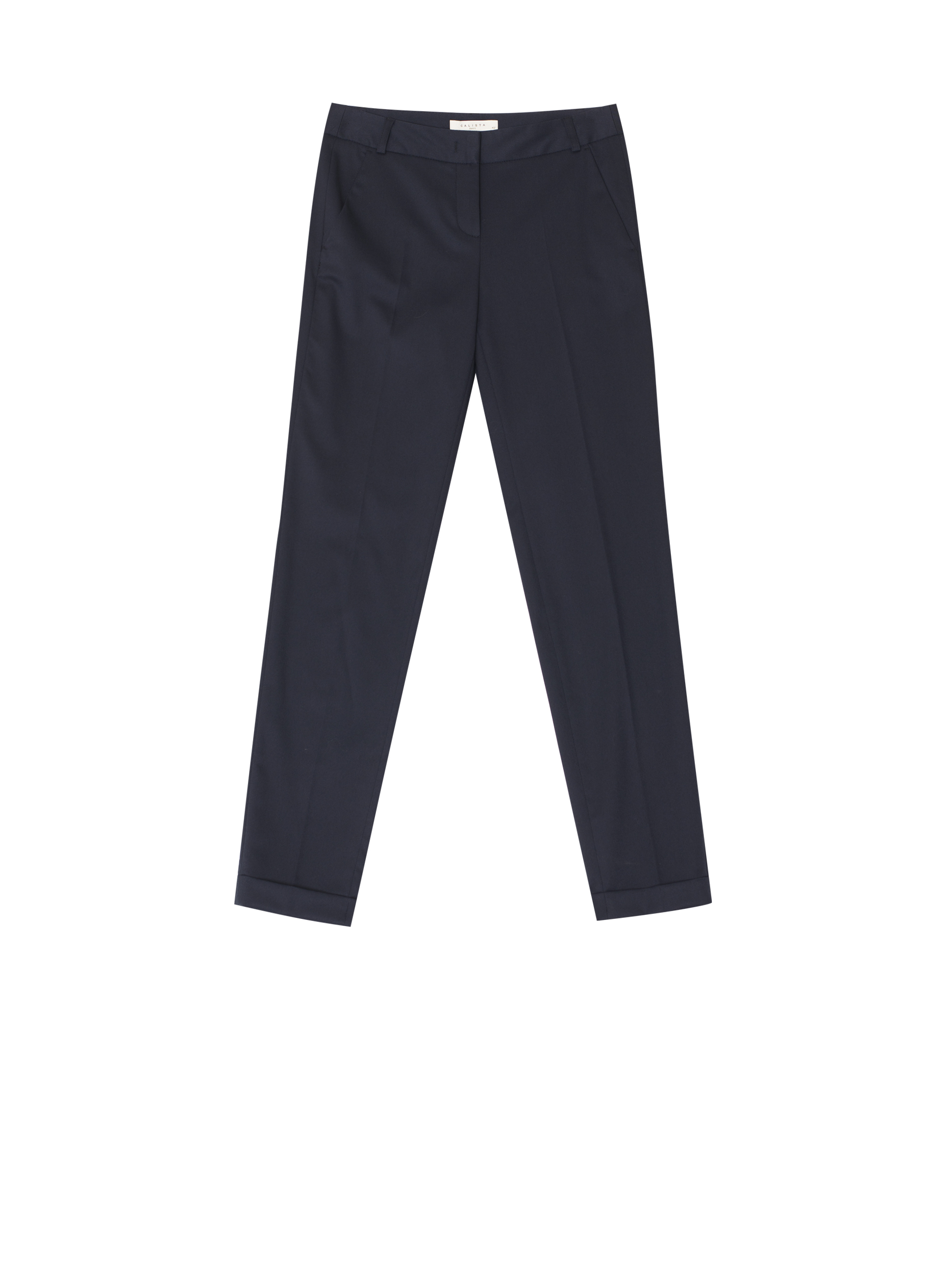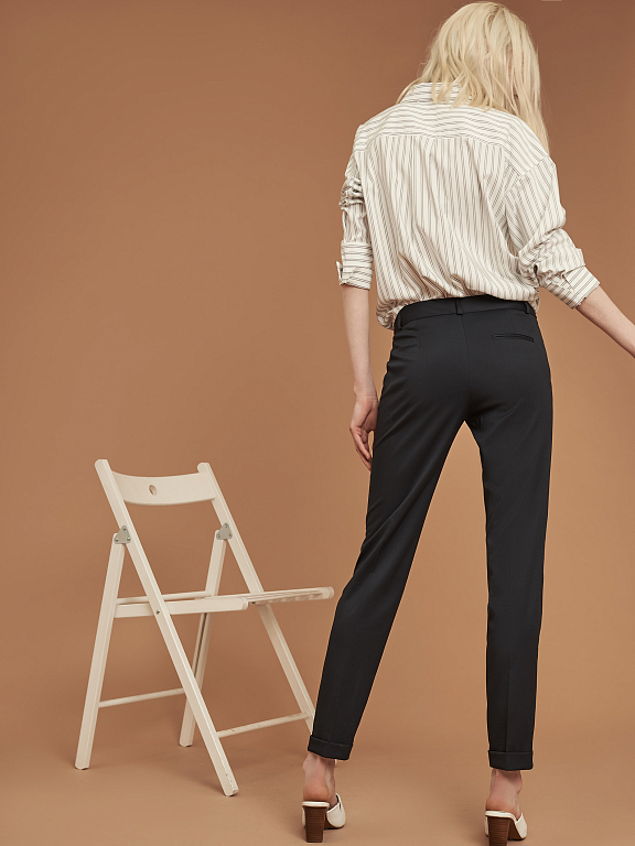Брюки зауженного кроя, выполненные из смесовой вискозы. Средняя посадка, втачной пояс, прорезные карманы по бокам, декоративный карман сзади, отвороты по нижнему краю.