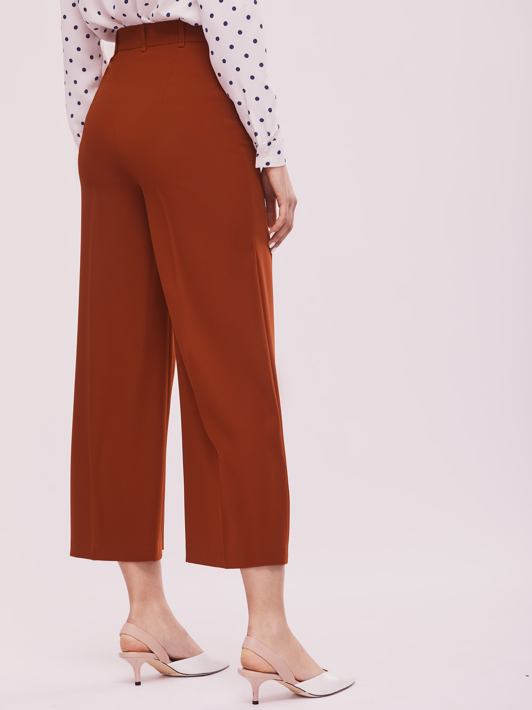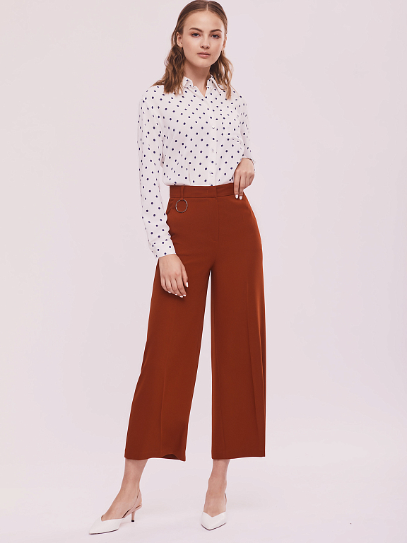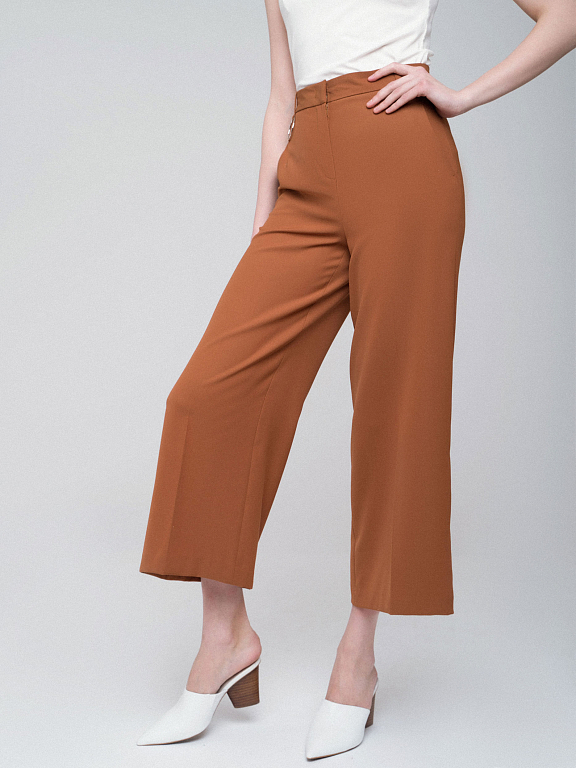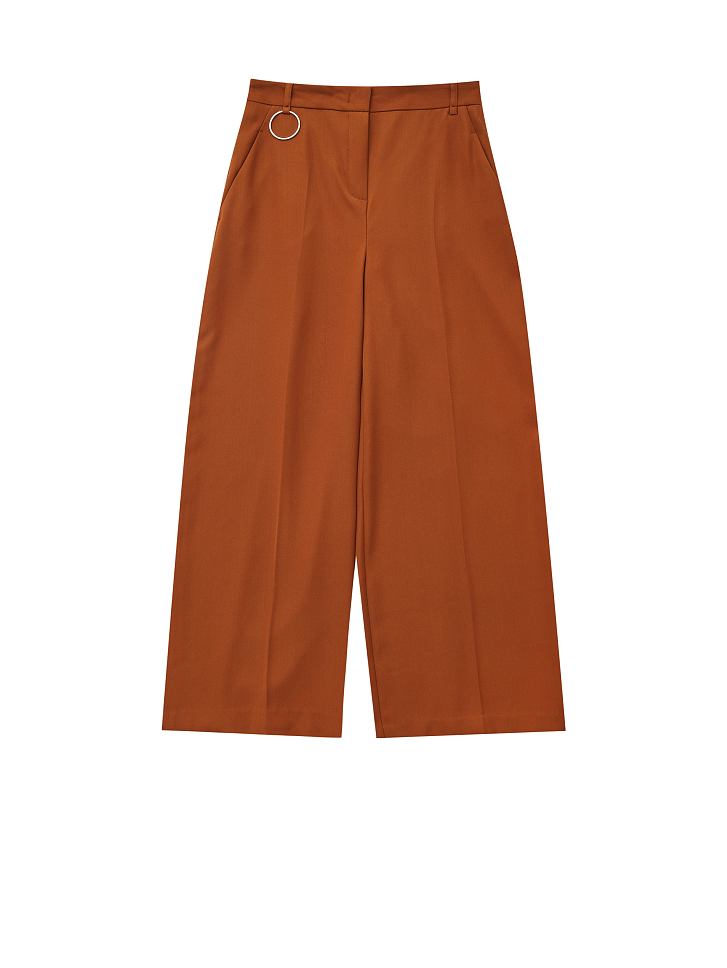 Брюки-кюлоты на талии. Втачной пояс с декоративным металлическим кольцом, прорезные карманы по бокам.