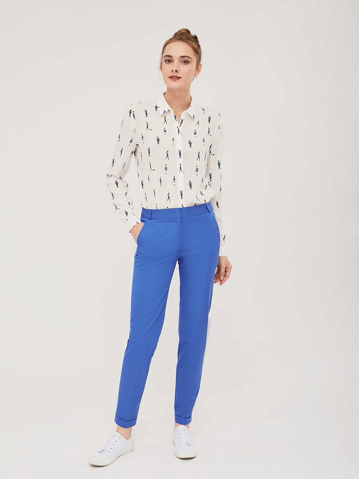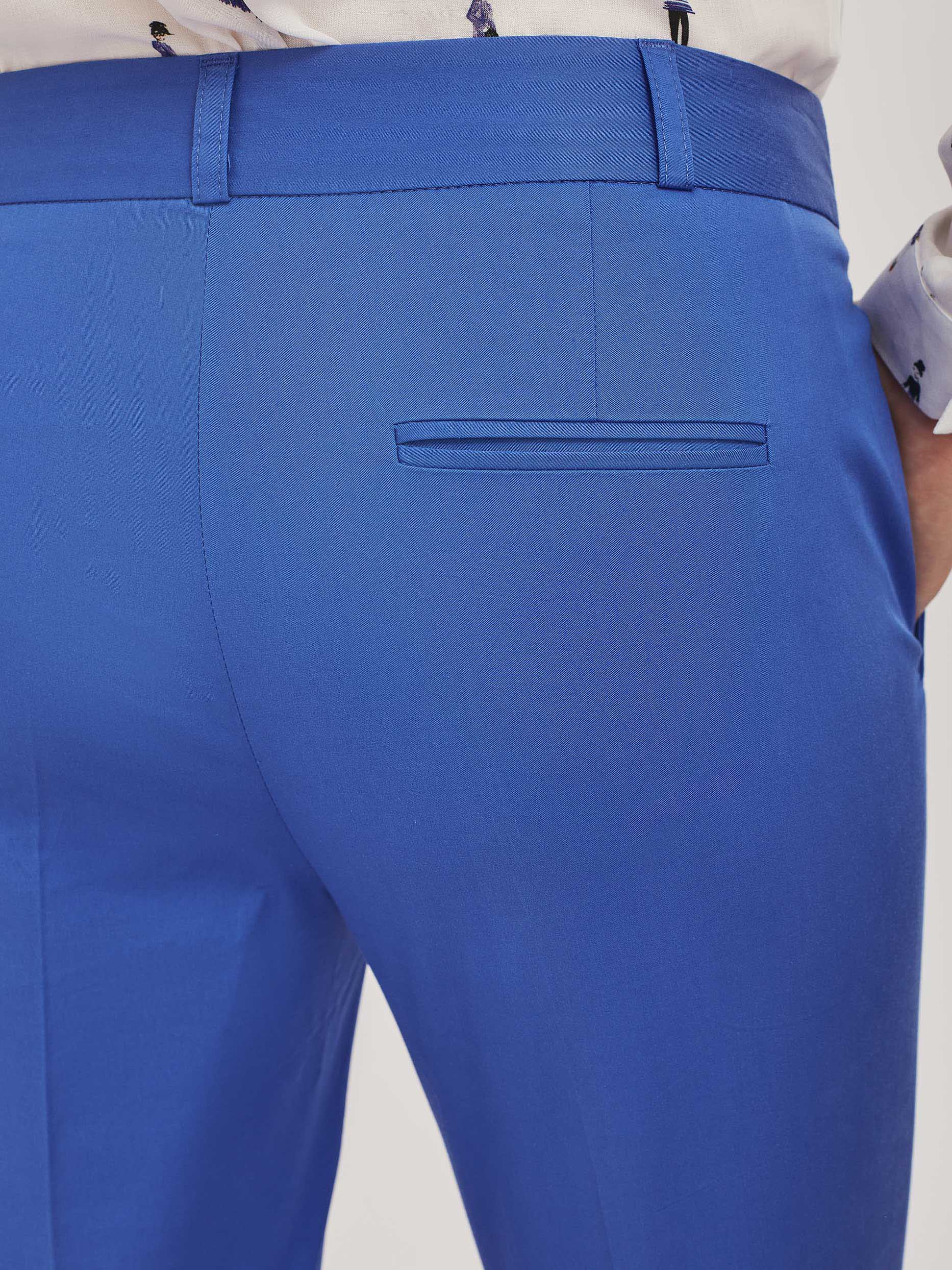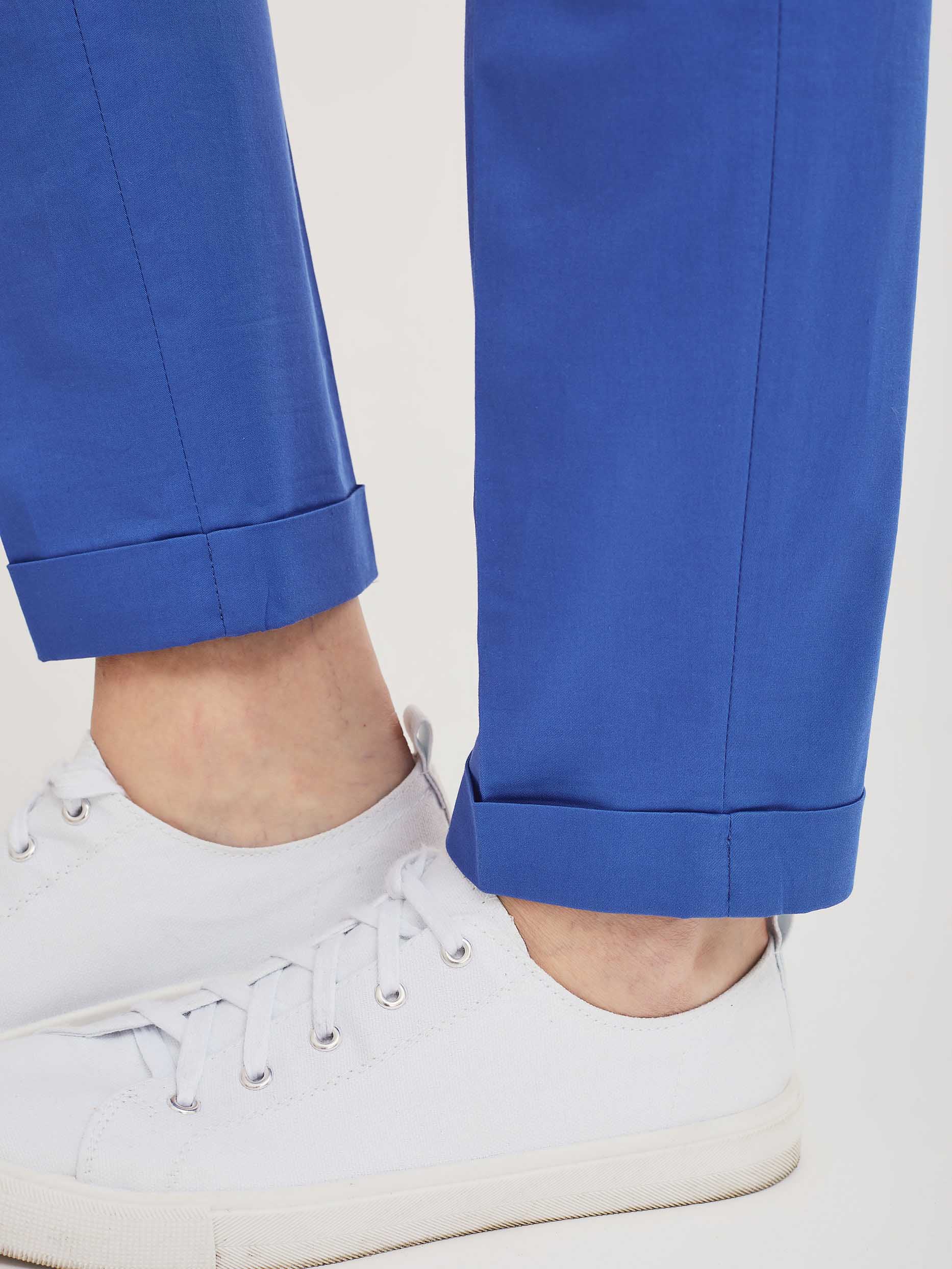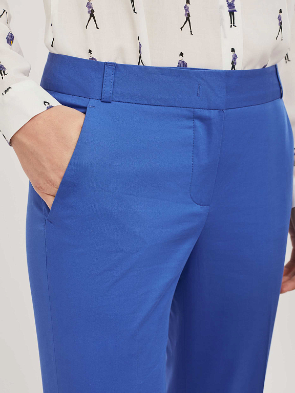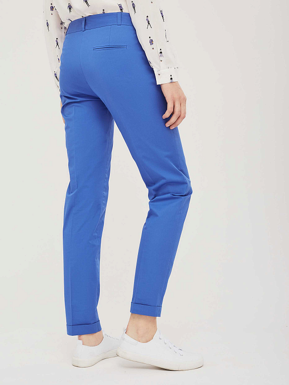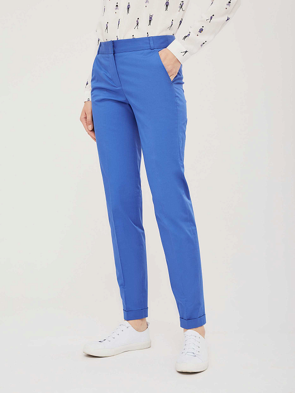 Хлопковые зауженные брюки с зашитыми отворотами снизу и боковыми карманами. Брюки со шлёвками для ремня на талии. Сзади прорезной карман в рамку. Изделие без подкладки.  Рост модели 175 см, размер 42 (российский)