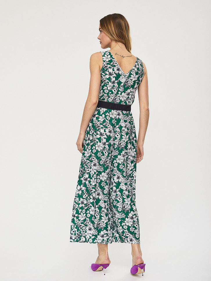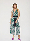 Комбинезон из 100% вискозы с принтом. Приталенный силуэт, V-образный вырез горловины, треугольный вырез на спине. Застегивается на ряд пуговиц. В комплекте пояс.