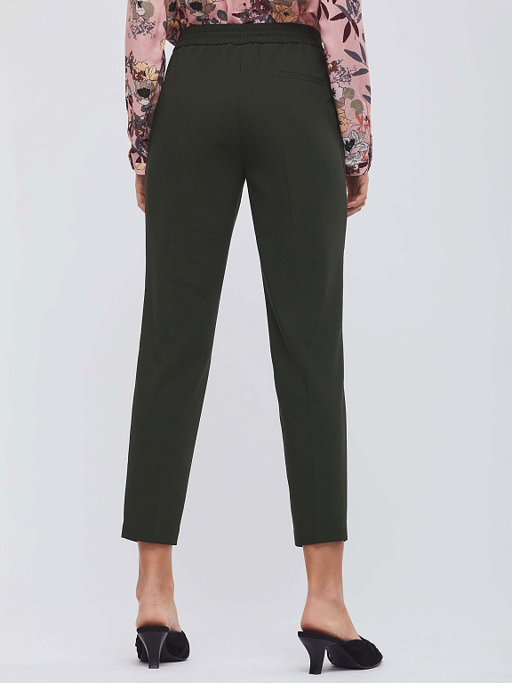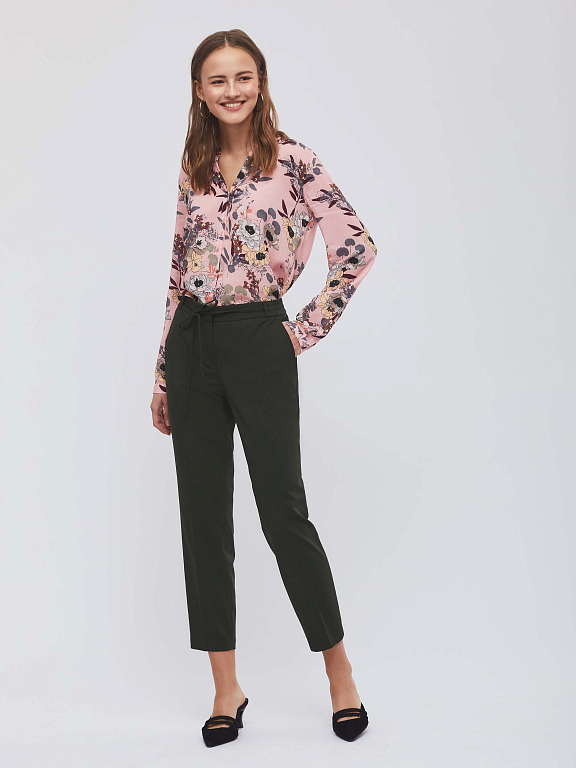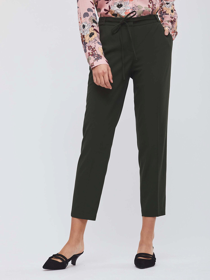 Укороченные брюки средней посадки из поливискозы. Изделие с заглаженными стрелками, боковыми карманами и тонким поясом на бант. Сзади ложный прорезной карман с листочкой. Застёжка на крючоки и молнию. Изделие без подкладки. Рост модели 173 см, размер 42 (российский). Плотность ткани: 250 г/м2