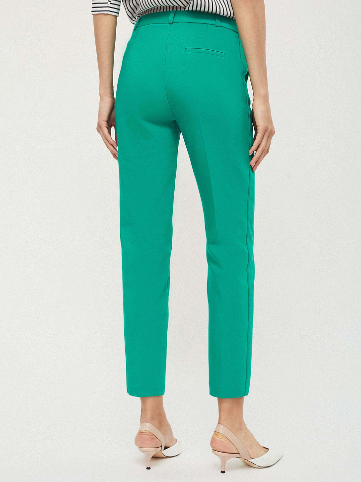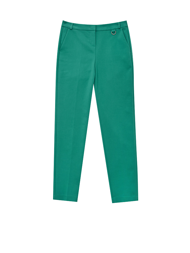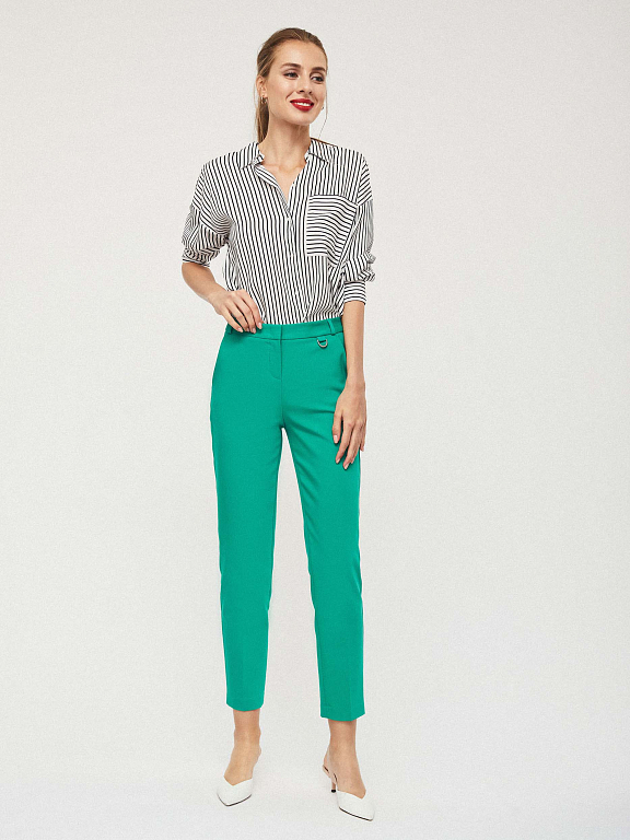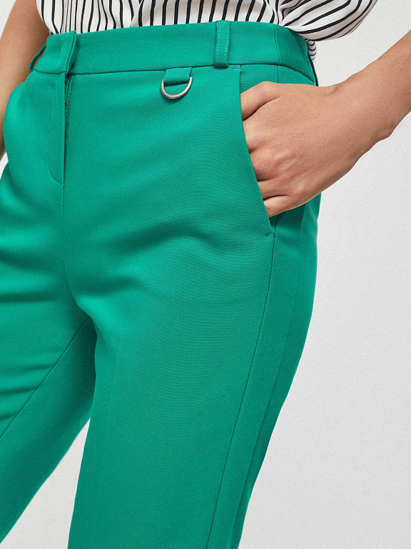 Зауженные брюки из плотного полихлопка с контрастными лампасами. На поясе есть шлёвки для ремня и декоративный элемент с металлическим полукольцом. Брюки с боковыми карманами. Изделие без подкладки. Рост модели 177 см, размер 42 (российский)