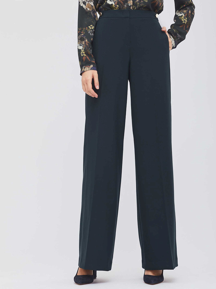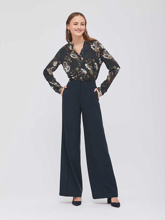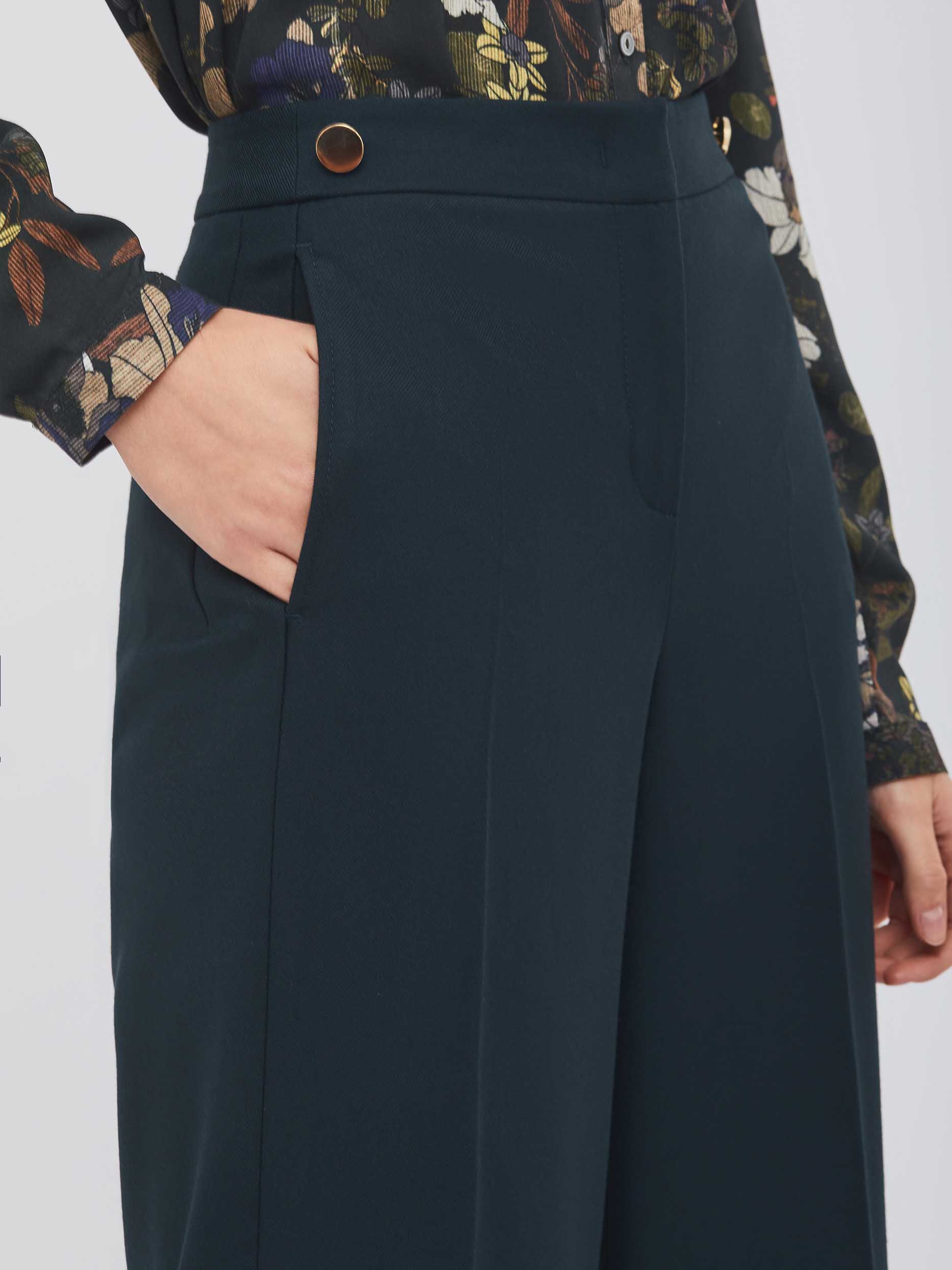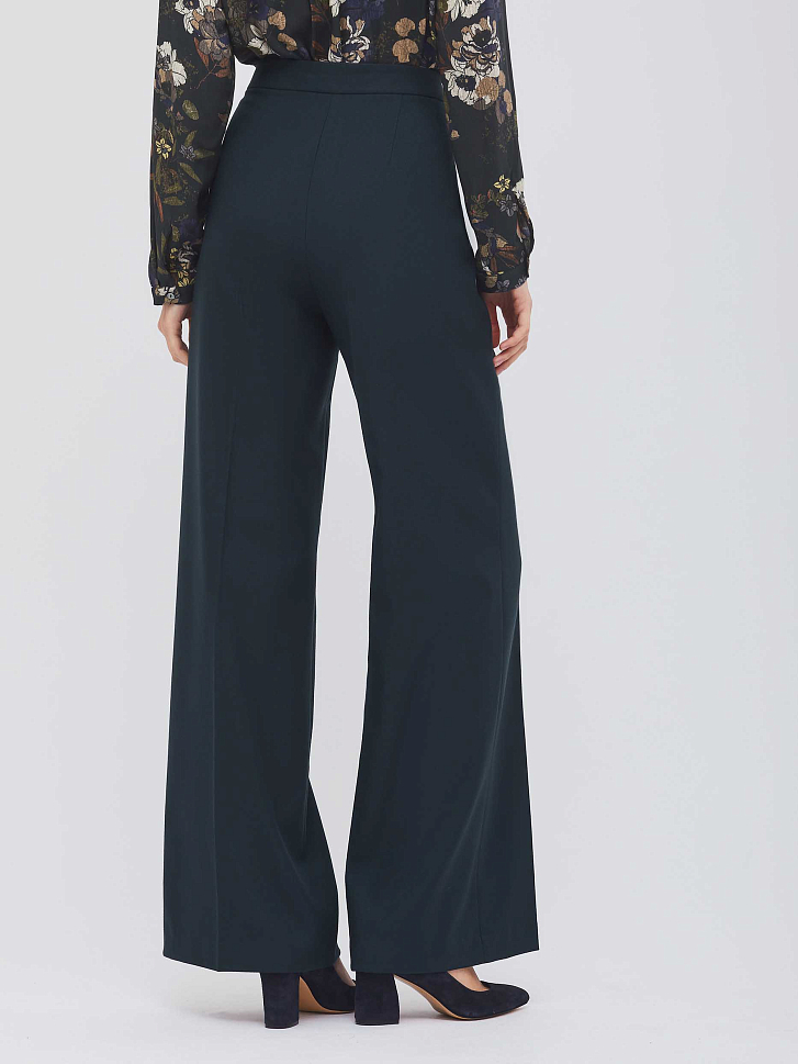 Брюки широкого кроя с высокой посадкой и декоративными пуговицами на линии талии. Застежка на крючки с петлями и молнию, два боковых кармана.