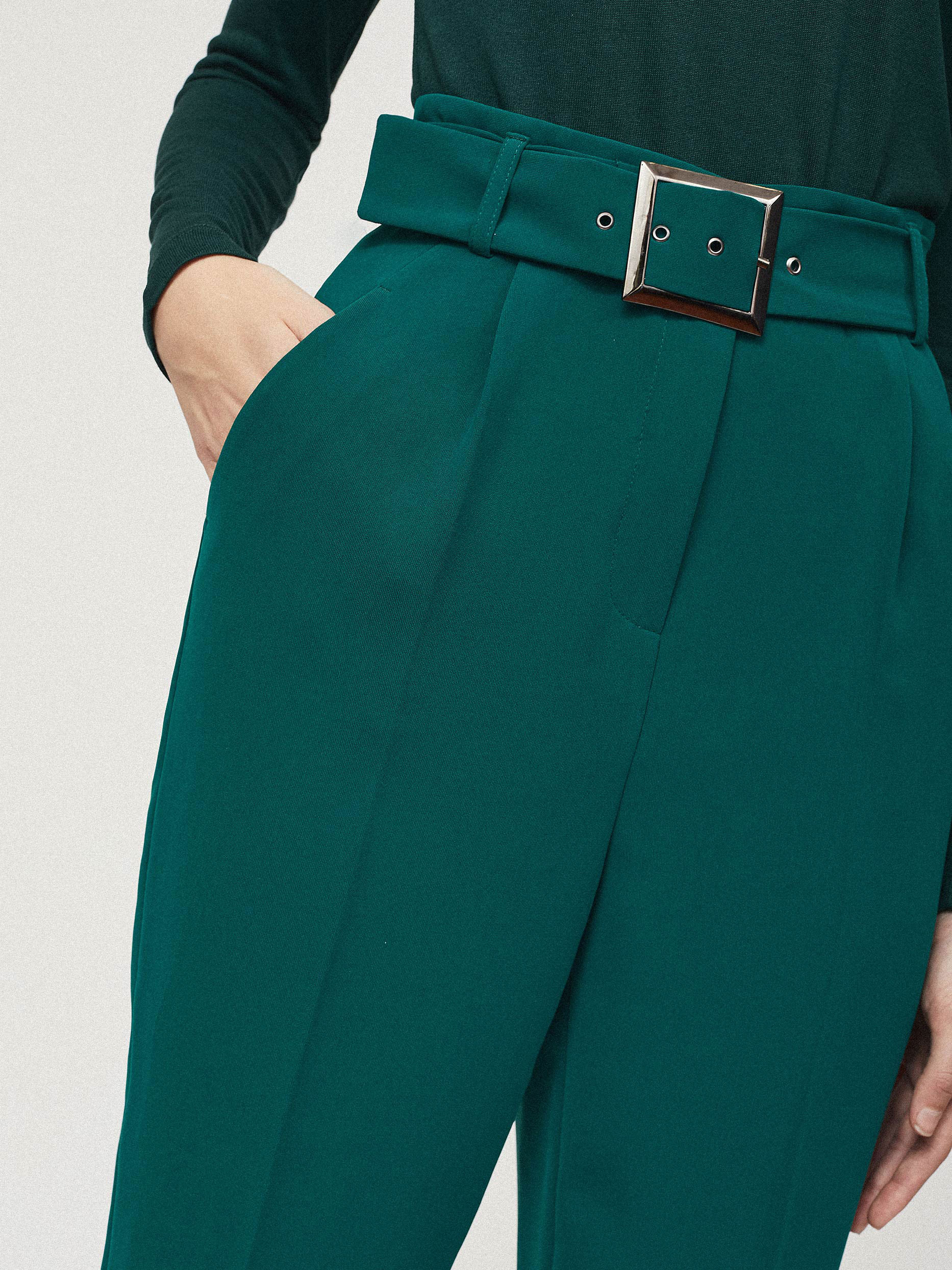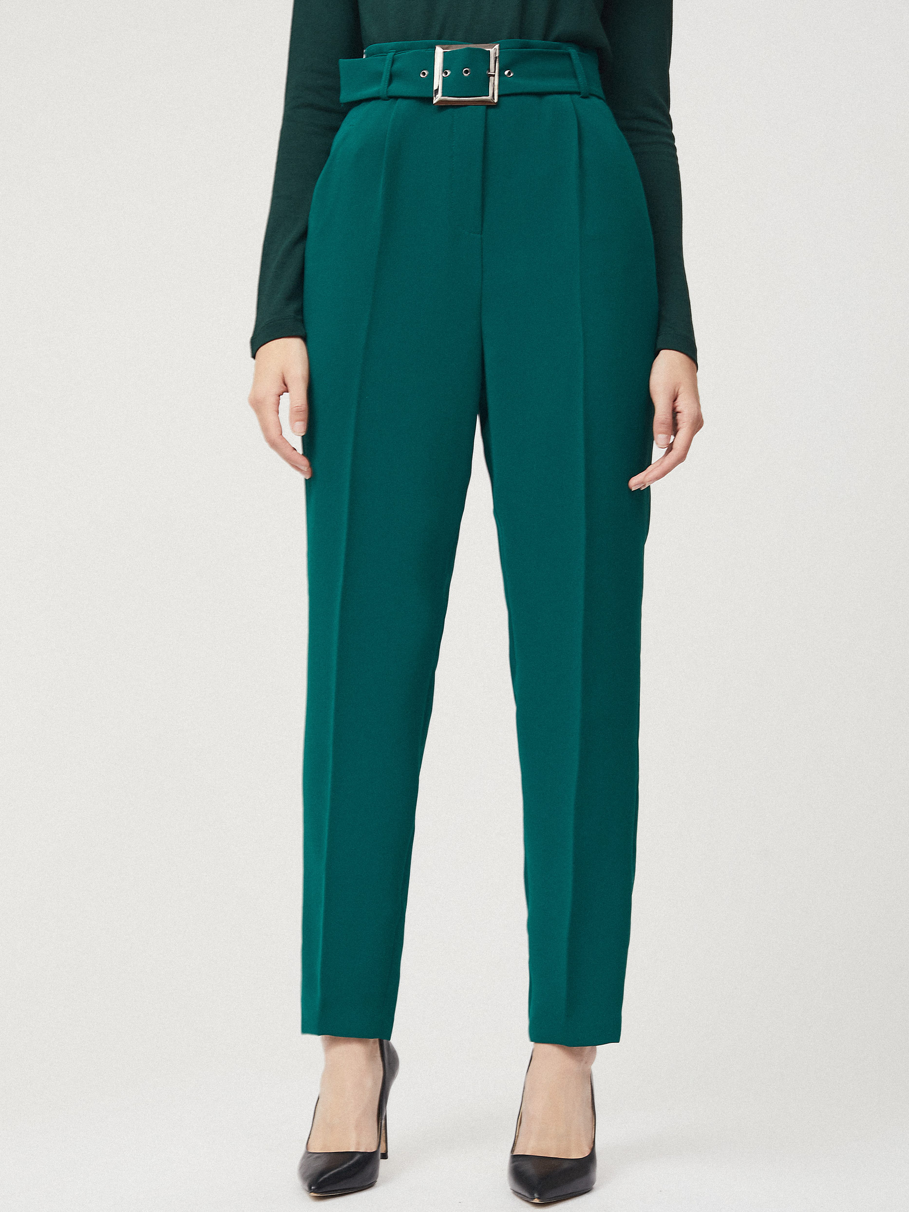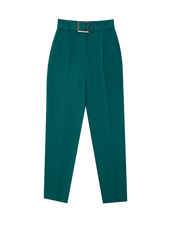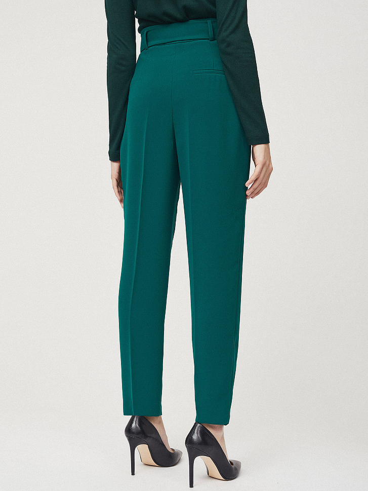 Однотонные брюки зауженного кроя с защипами. Высокая посадка, втачной пояс, прорезные карманы по бокам, декоративный карман сзади. В комплекте пояс с металлической пряжкой.