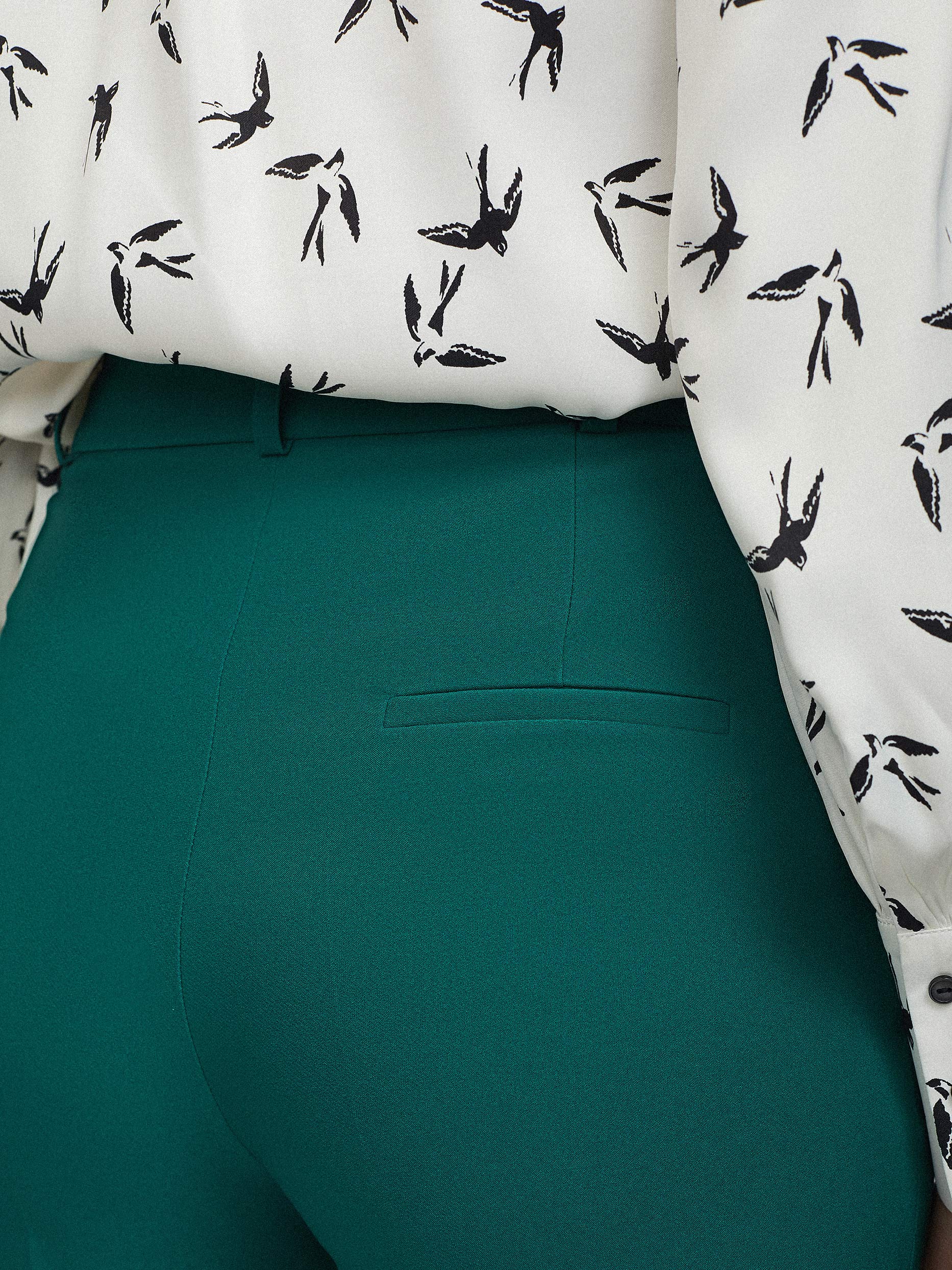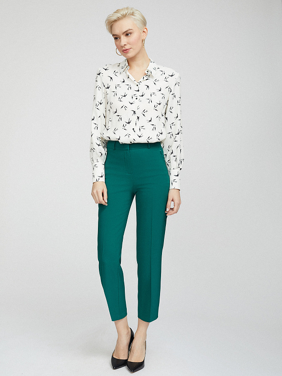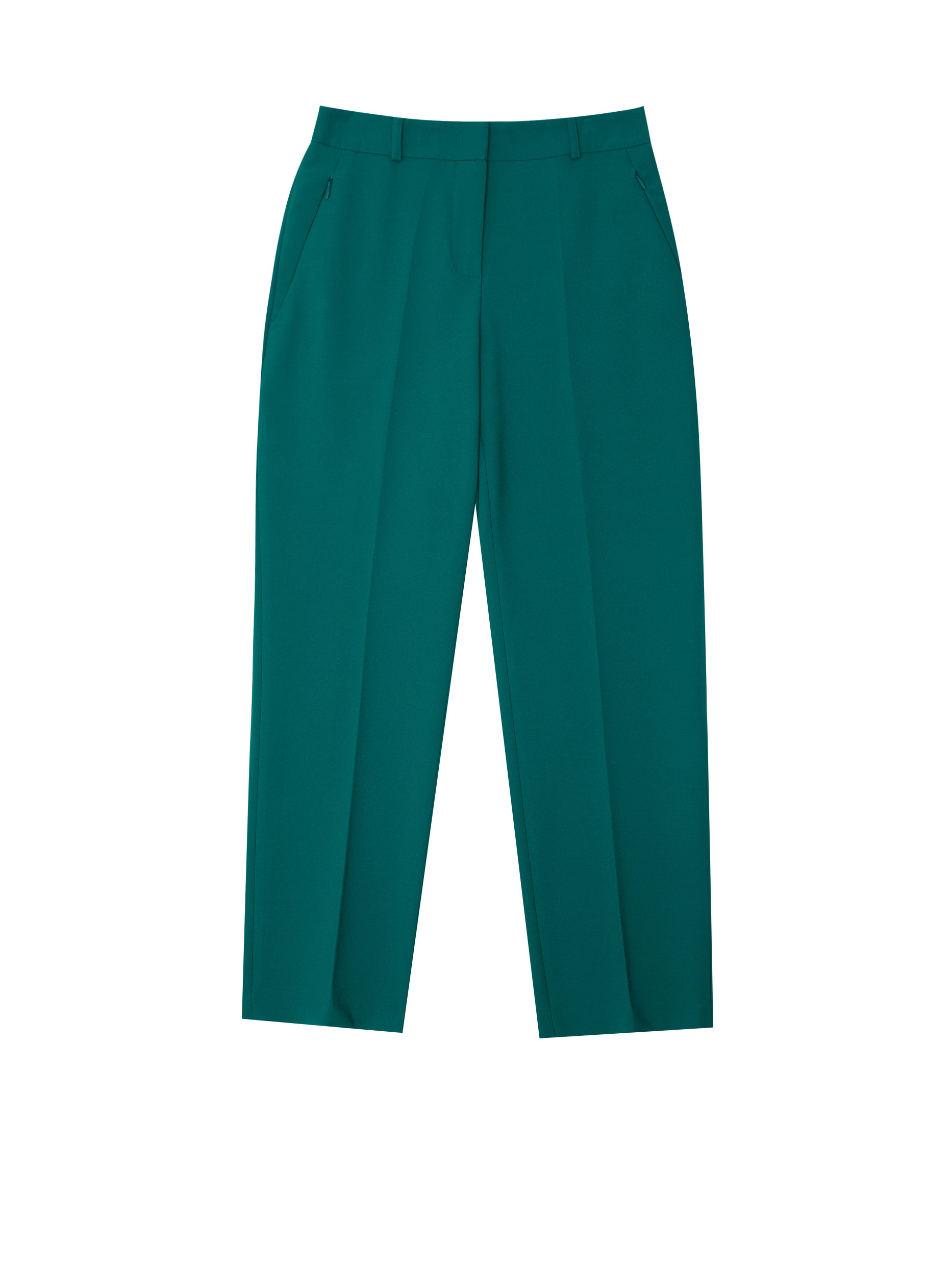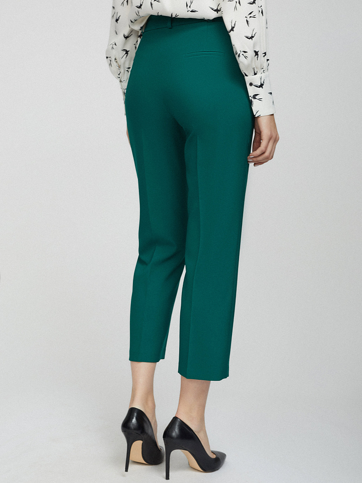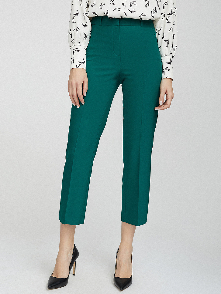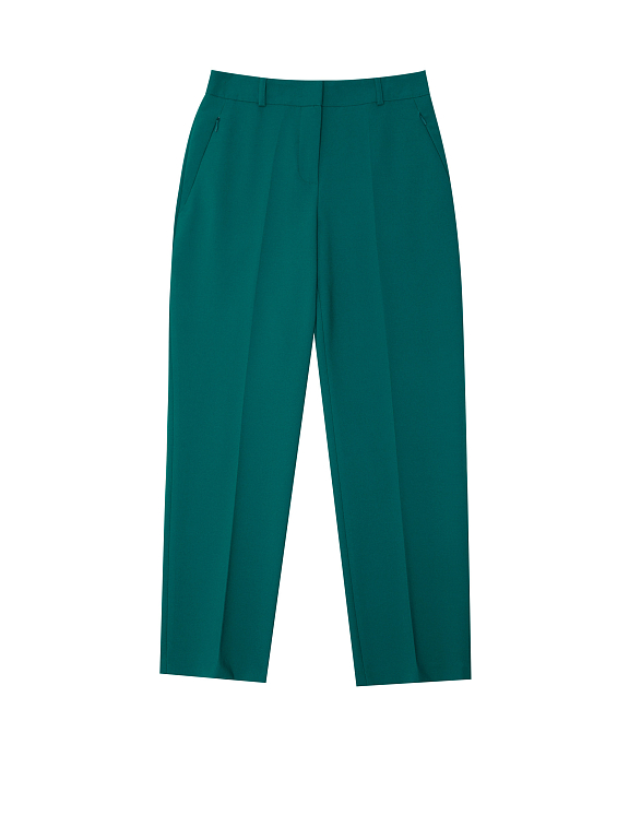 Однотонные укороченные брюки прямого кроя. Высокая посадка, втачной пояс, карманы на молниях по бокам, декоративный карман сзади, стрелки.