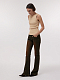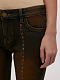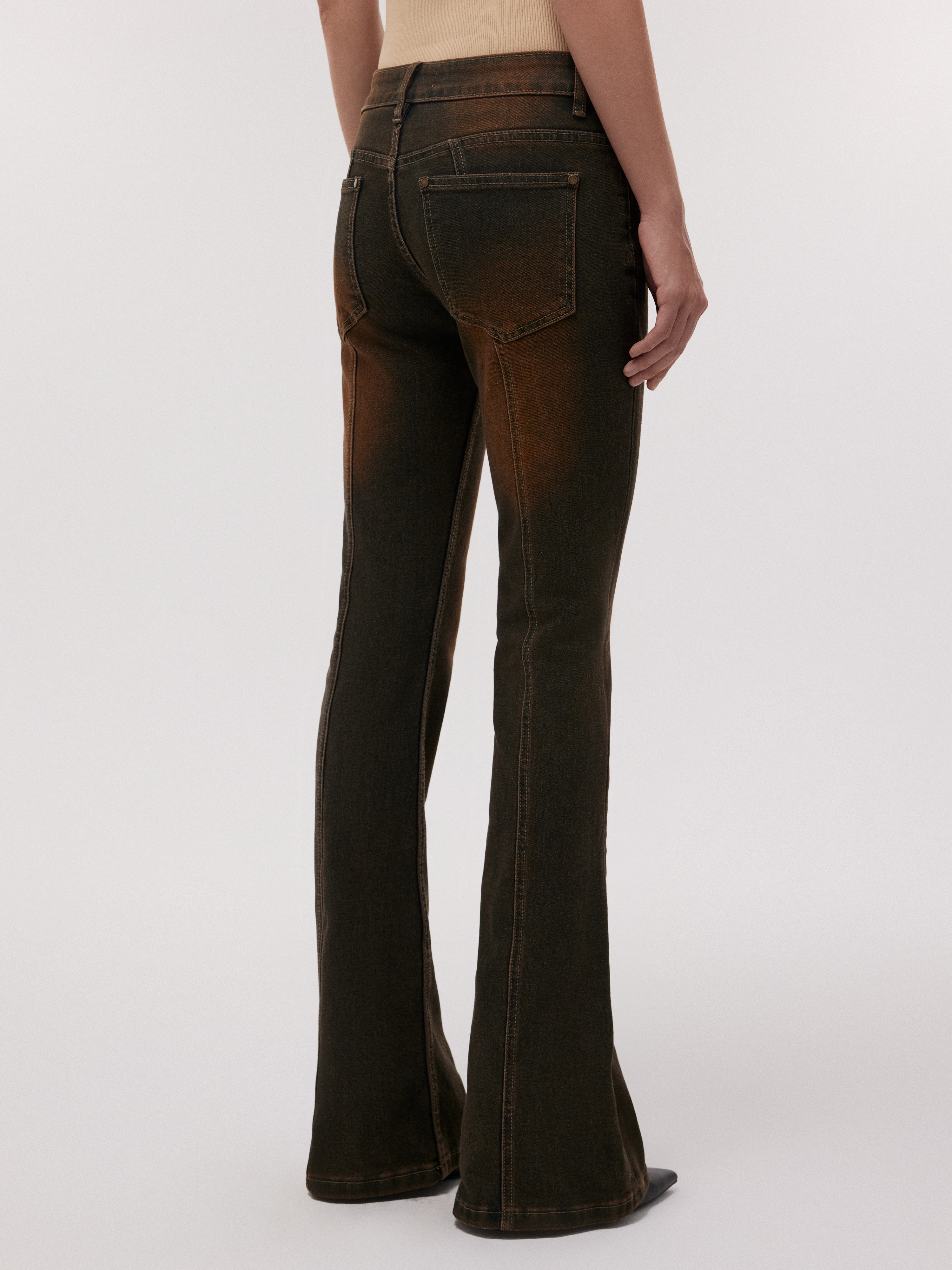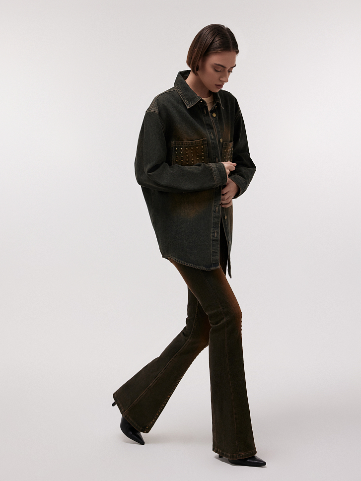 Расклешенные джинсы объединили в себе два тренда: низкую посадку и «ржавый» эффект. Плотный хлопковый деним обладает прочностью, а благодаря эластичным волокнам хорошо тянется и комфортно сидит по фигуре. Вертикальный ряд клепок визуально стройнит силуэт.
