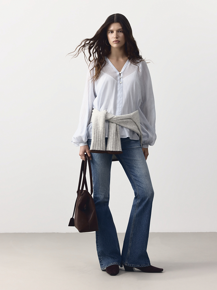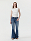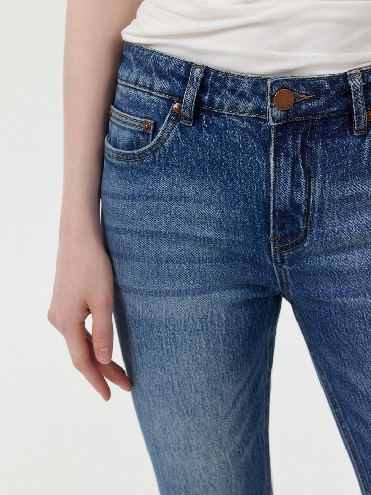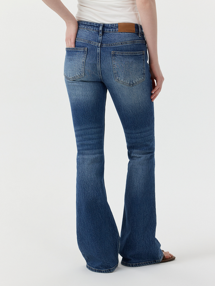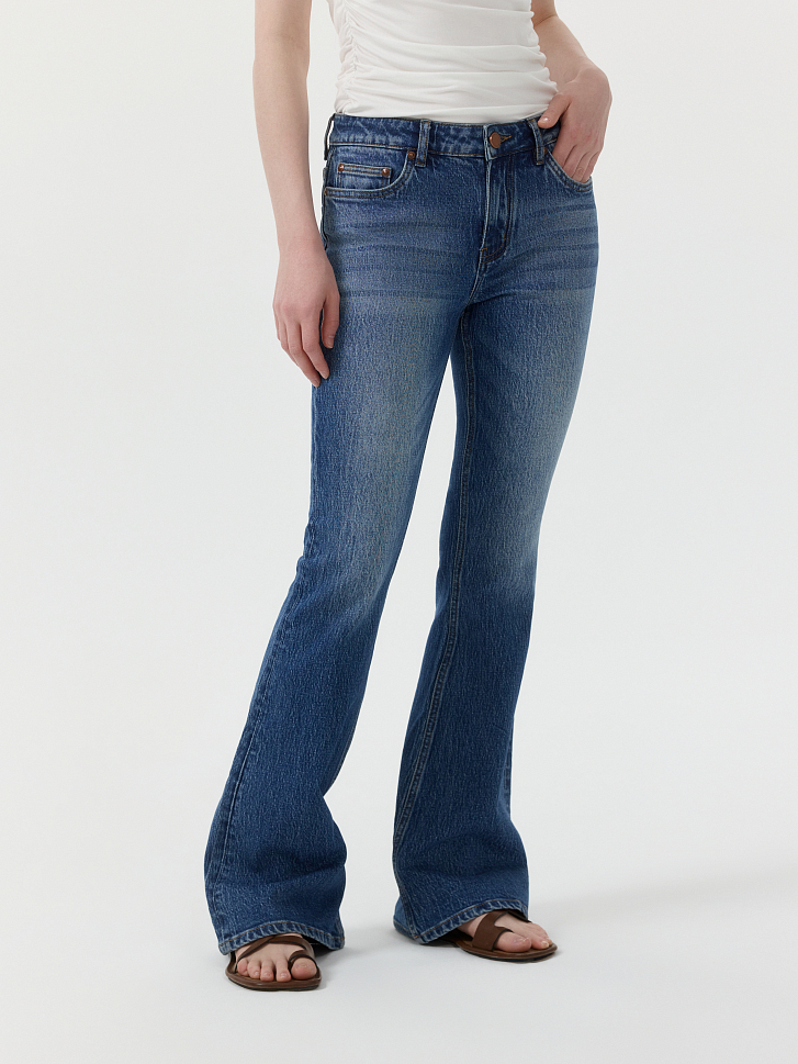 Расклешенные джинсы с трендовой низкой посадкой станут основной для десятка повседневных образов. Плотный деним из хлопка не вытягивается и обладает износоустойчивостью. Потертости придают винтажный эффект.