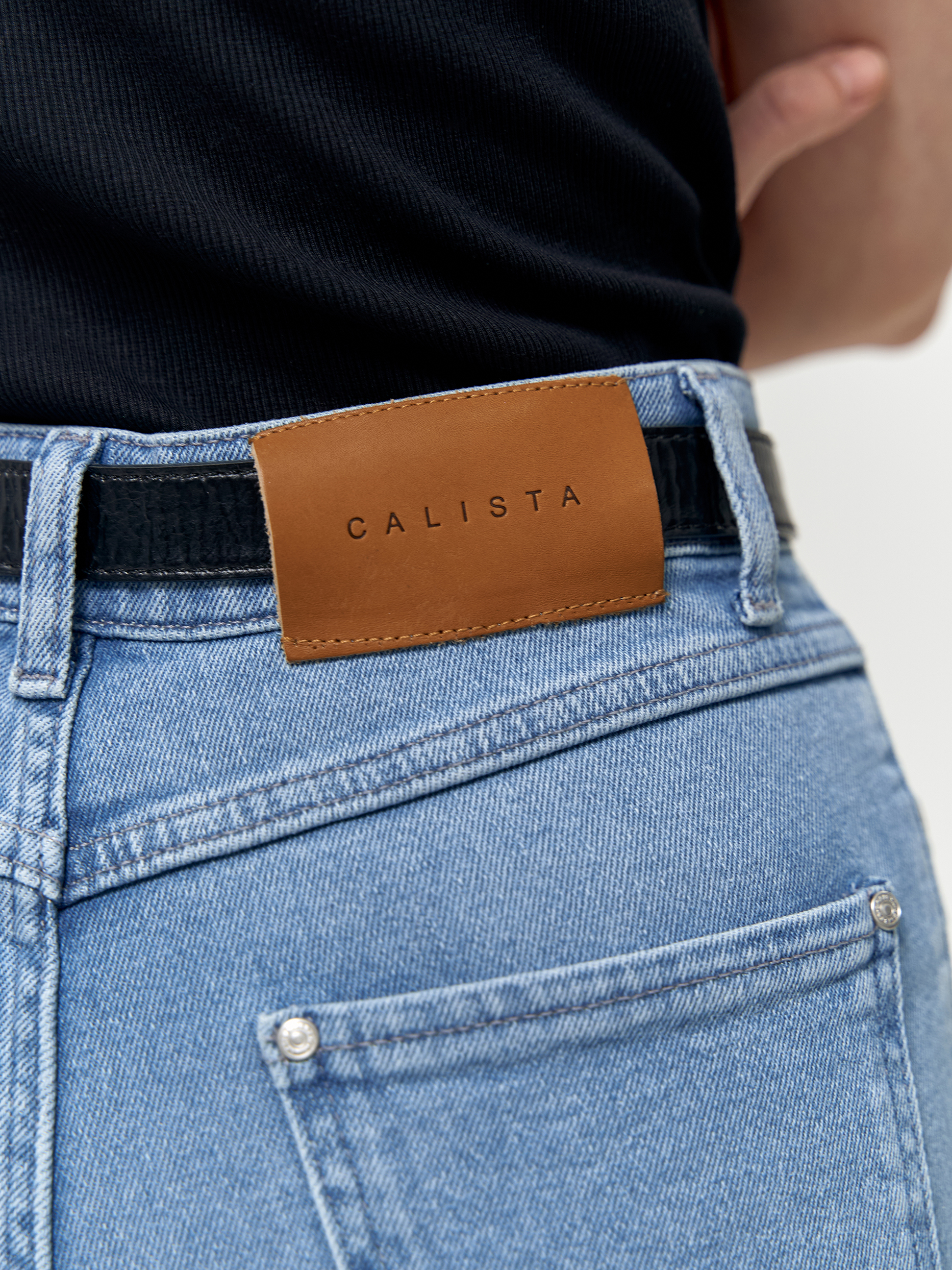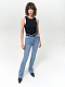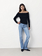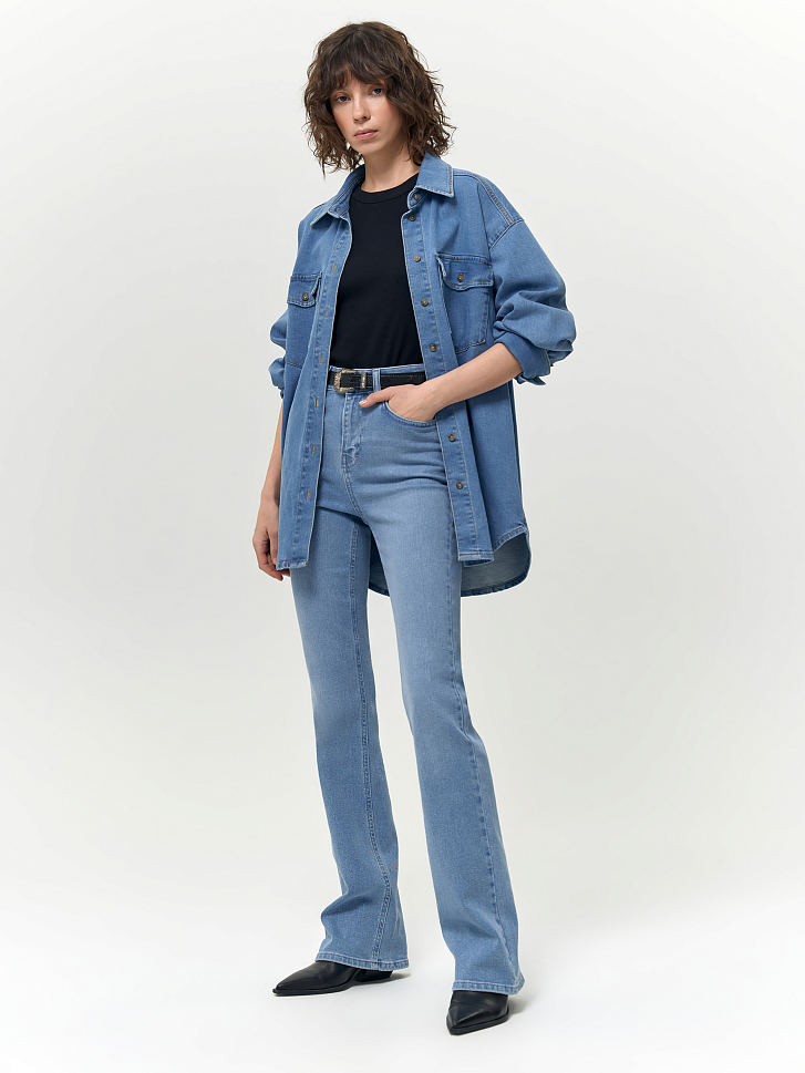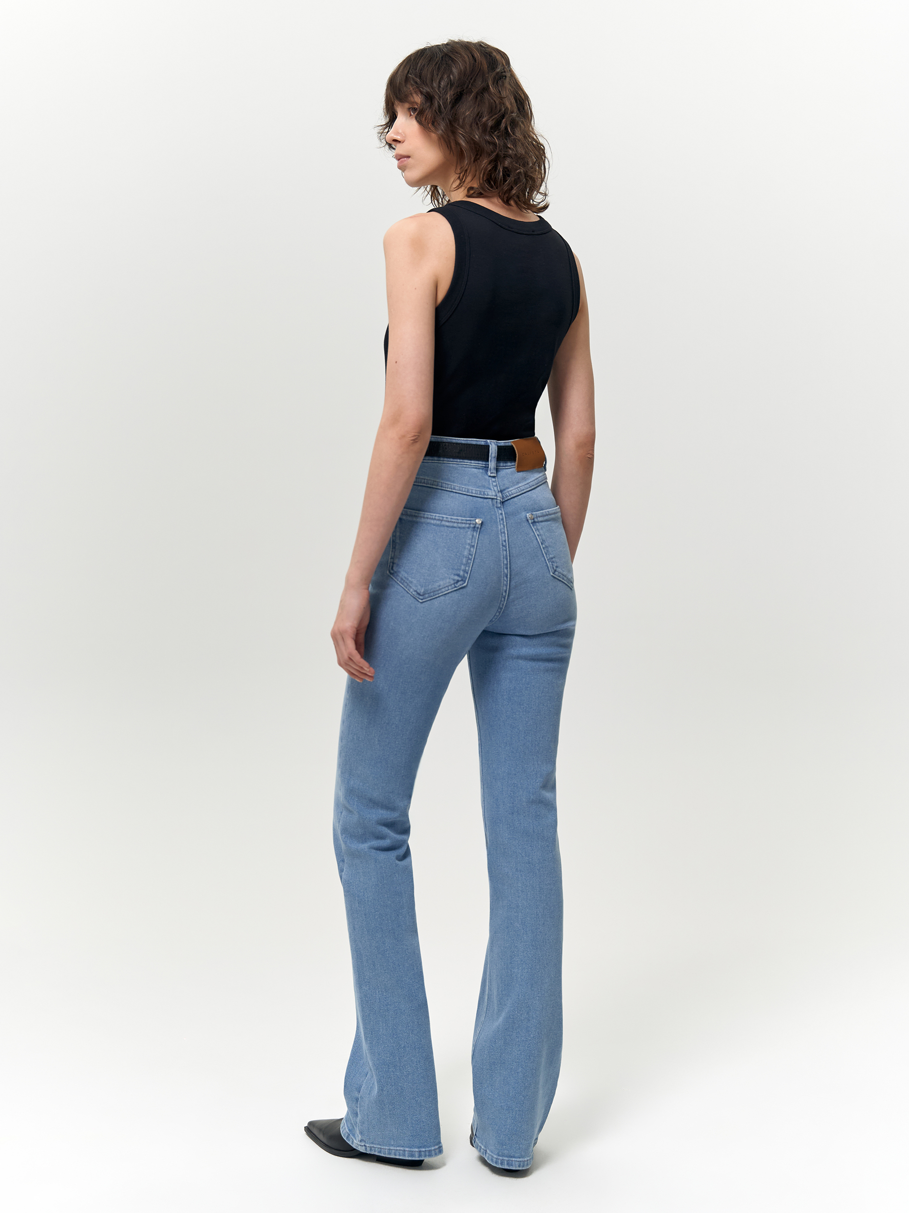 Джинсы с высокой посадкой — актуальная модель, которая сочетается со всеми вещами в гардеробе. Джинсы плотно облегают в бедрах и расклешаются от колена. Деним на основе хлопка слегка тянется благодаря эластичным волокнам и не сковывает движения.