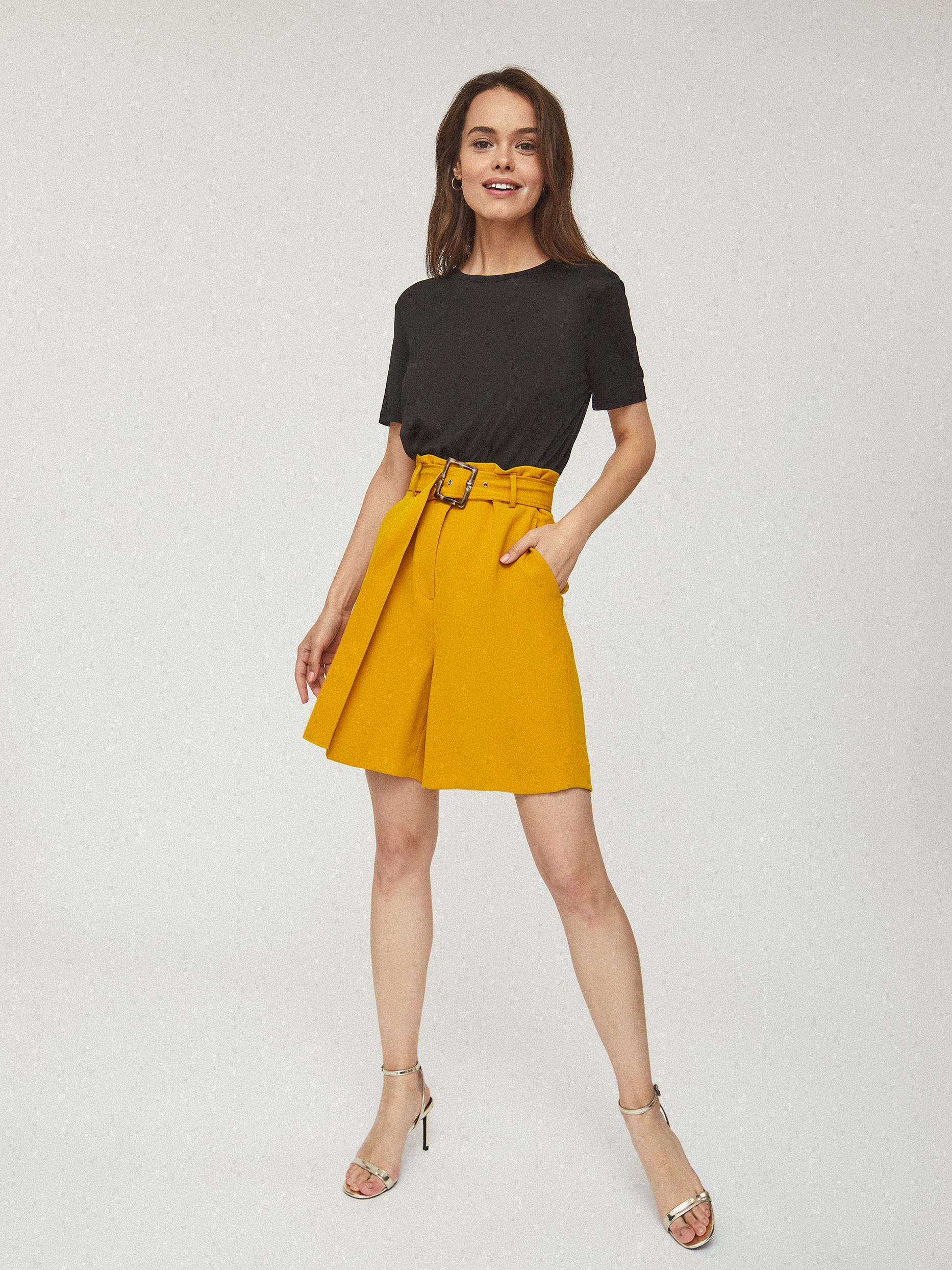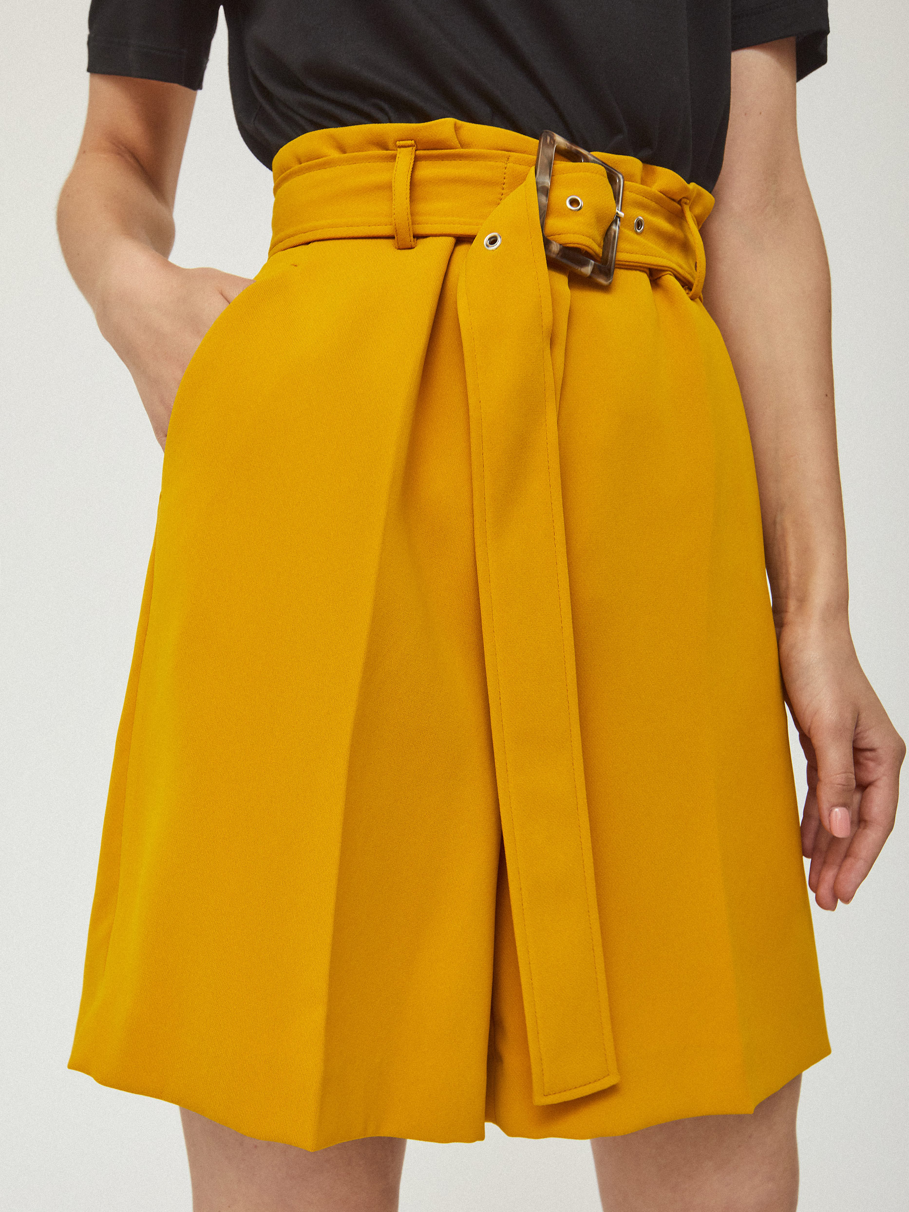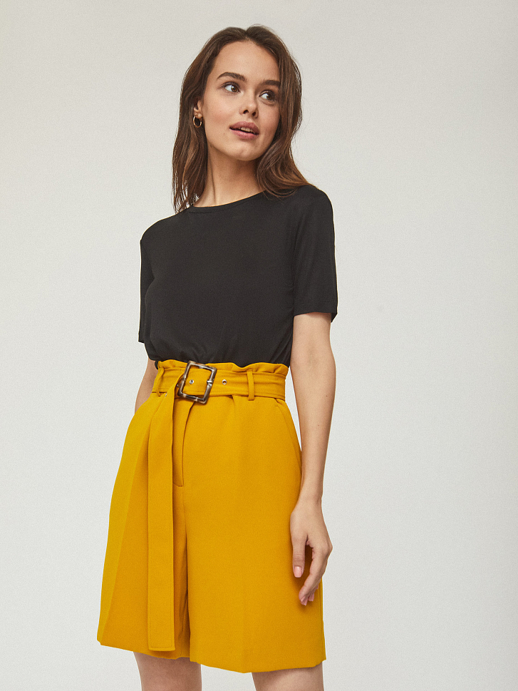 Приталенные шорты с поясом в тон. Высокая посадка, прорезные карманы по бокам, декоративный карман – сзади.