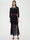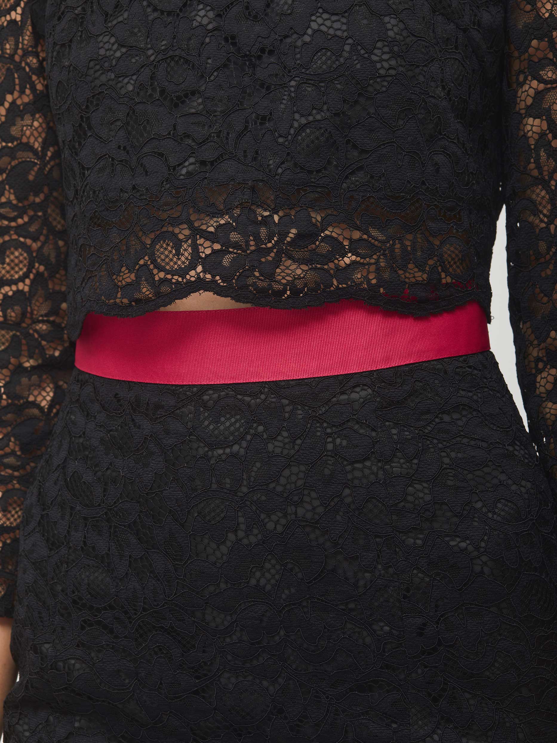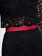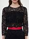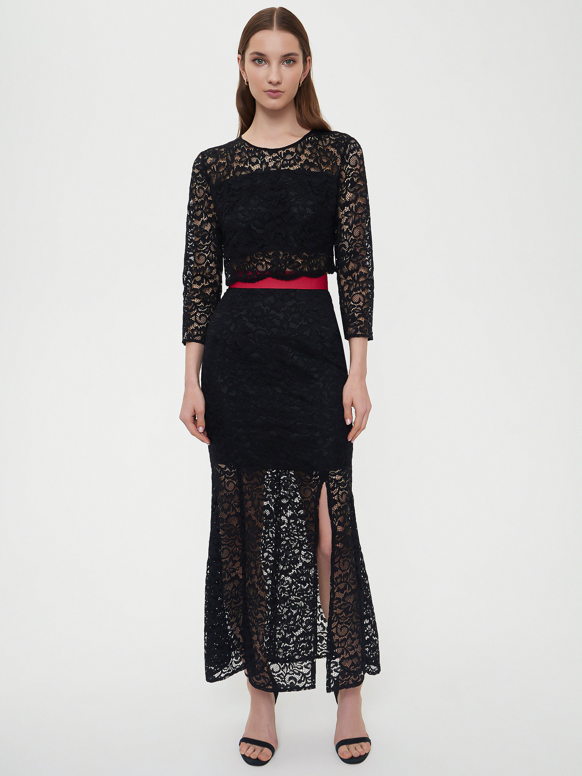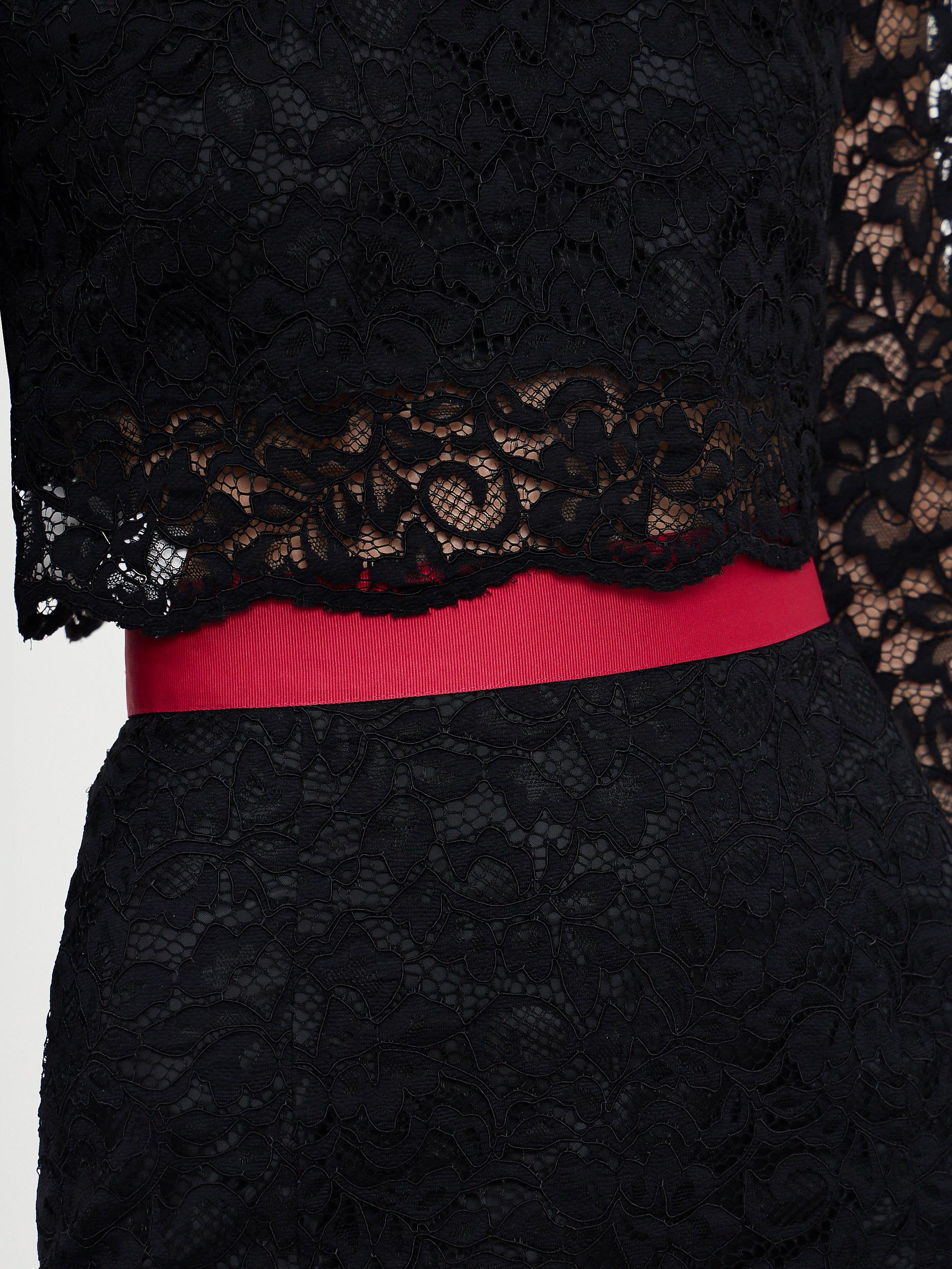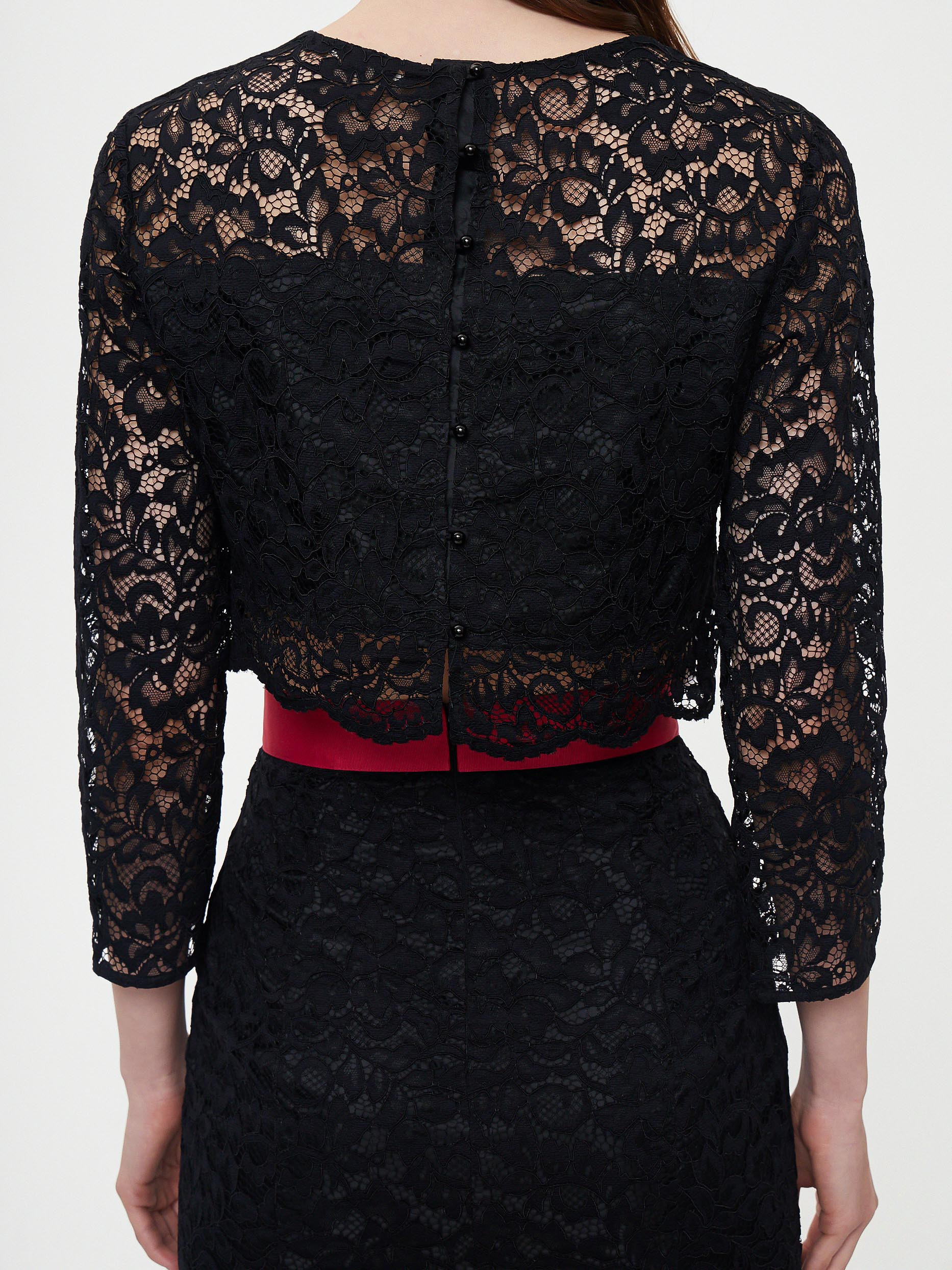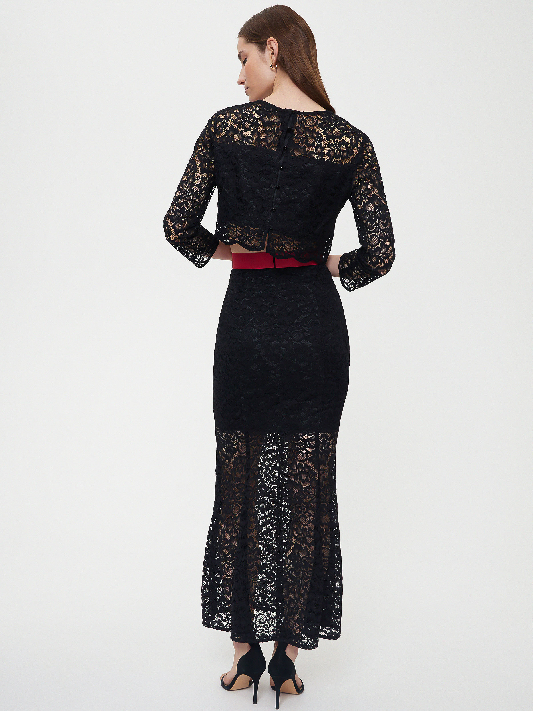 Кружевной костюм из укороченного топа и юбки-годе. На линии талии юбки контрастный пояс, спереди шлица. Топ с застежкой на пуговицы и рукавами ¾.Изделие на подкладке.
