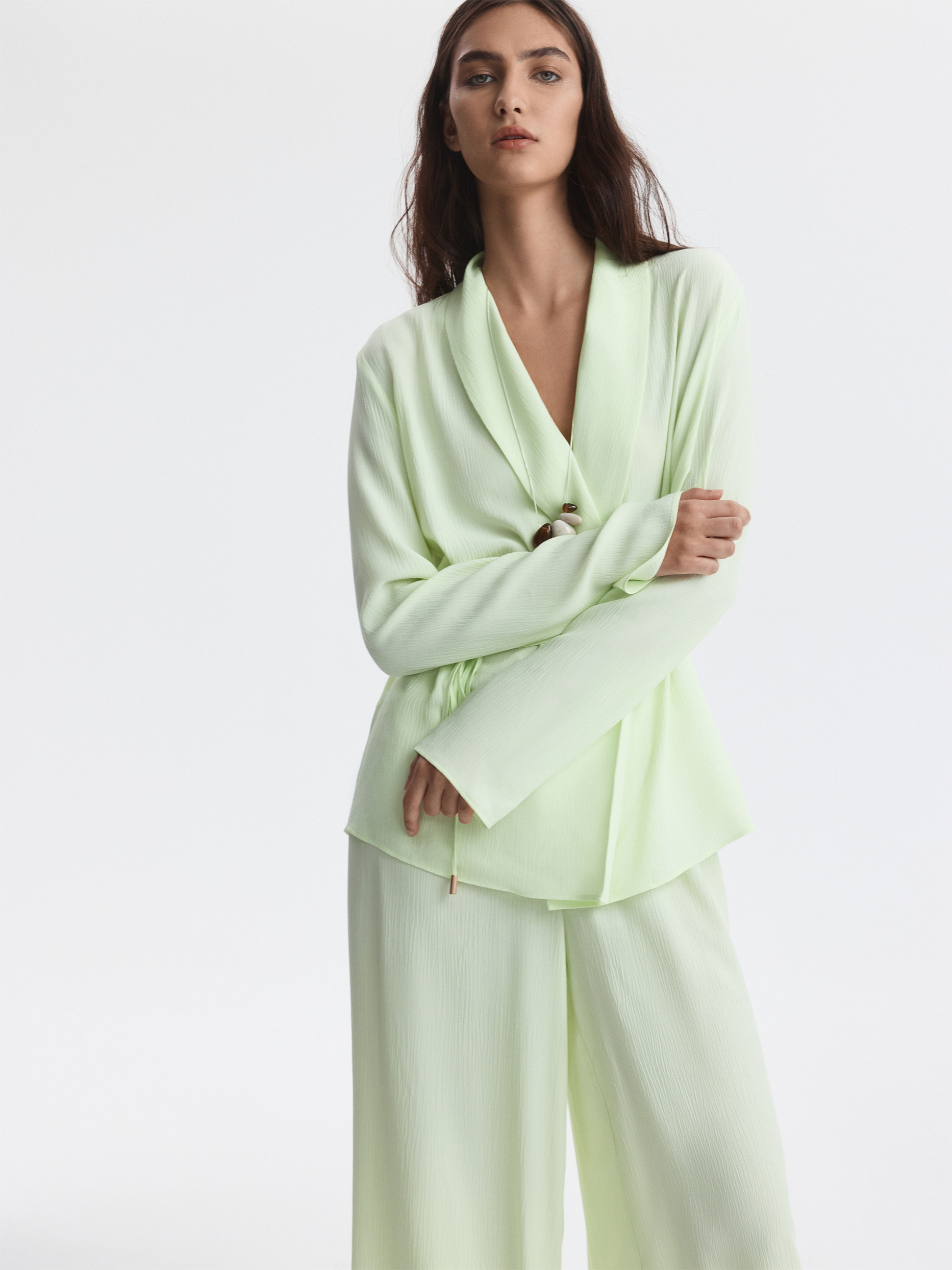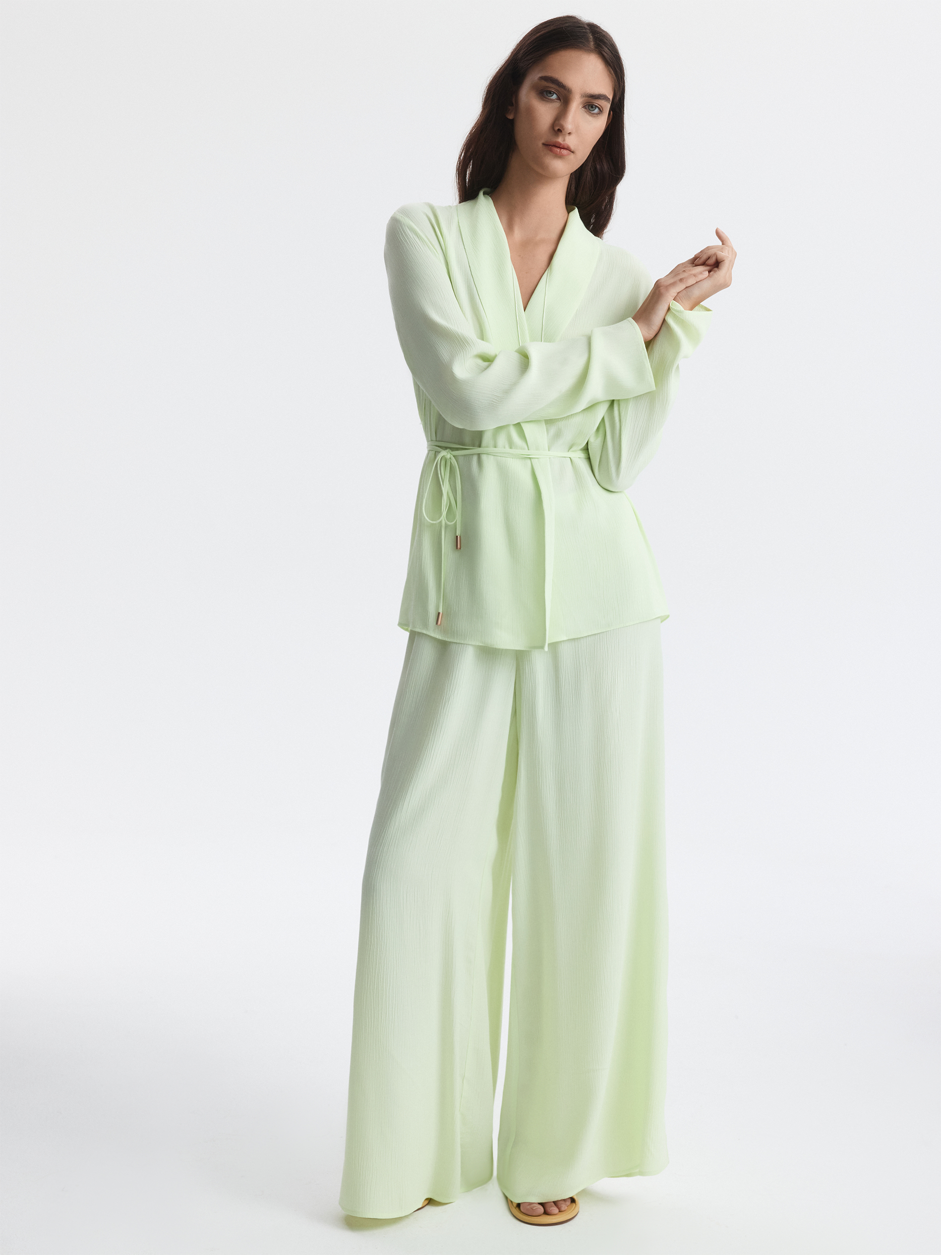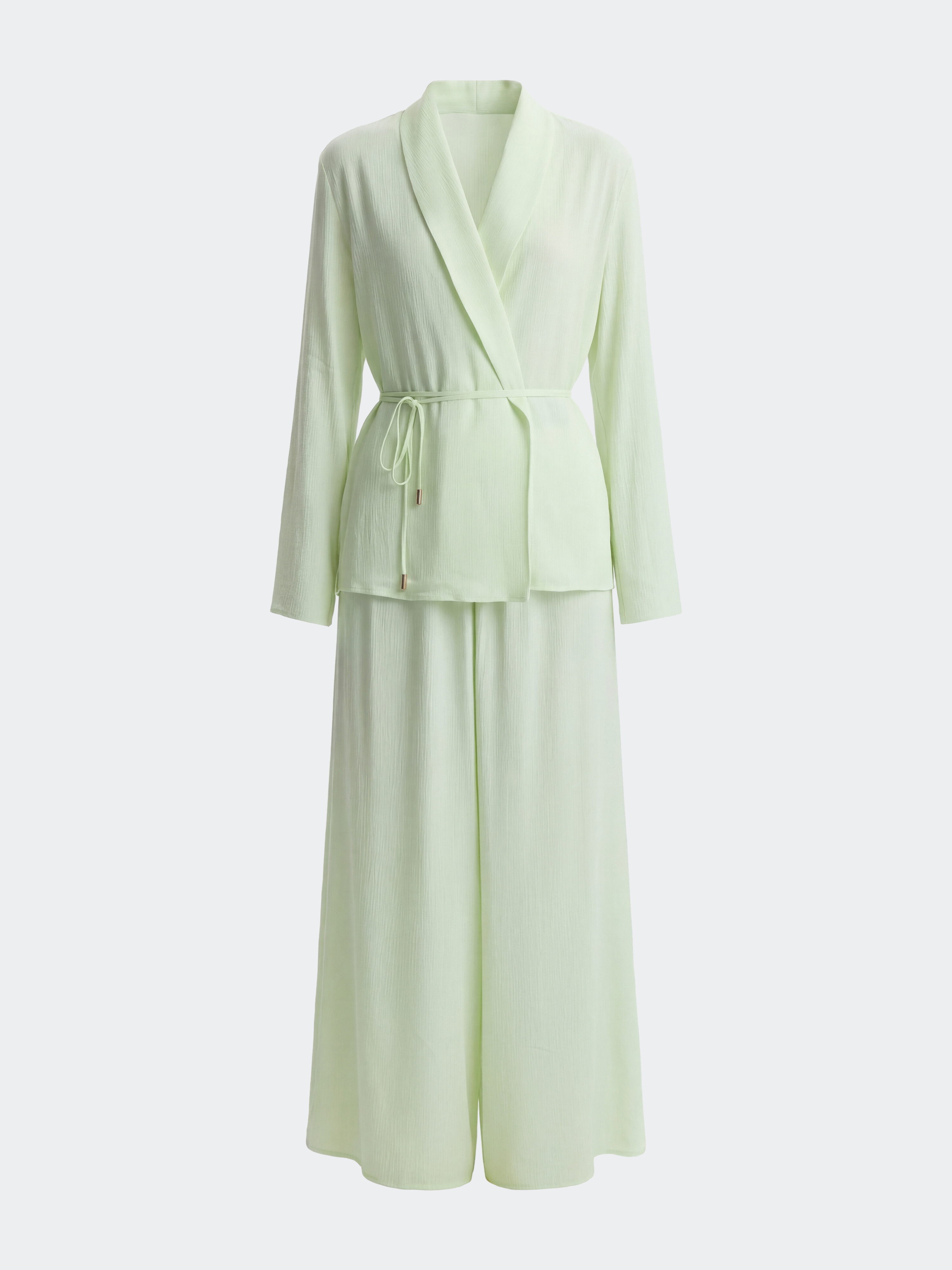 Костюм в пижамном стиле отвечает за ощущение легкости и расслабленности. Тонкий жатый текстиль из вискозы почти не просвечивает, хорошо пропускает воздух и дарит комфорт. Комплект свободно сидит по фигуре и не сковывает движения.