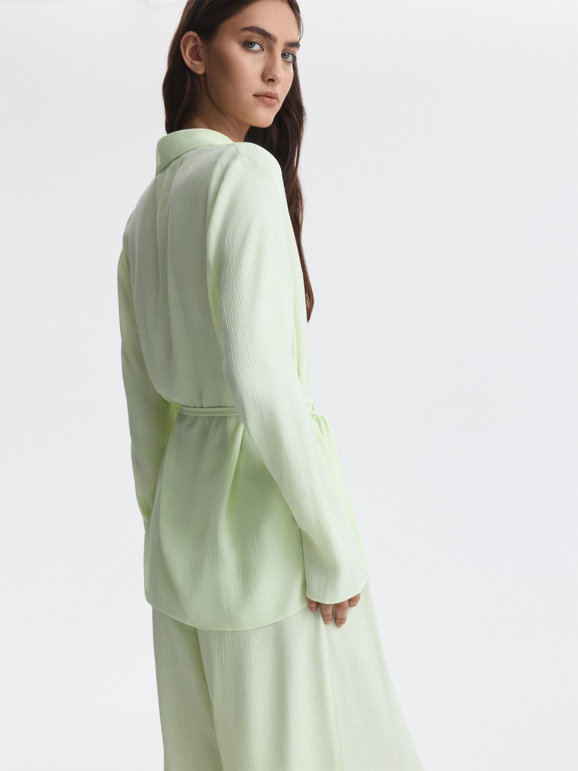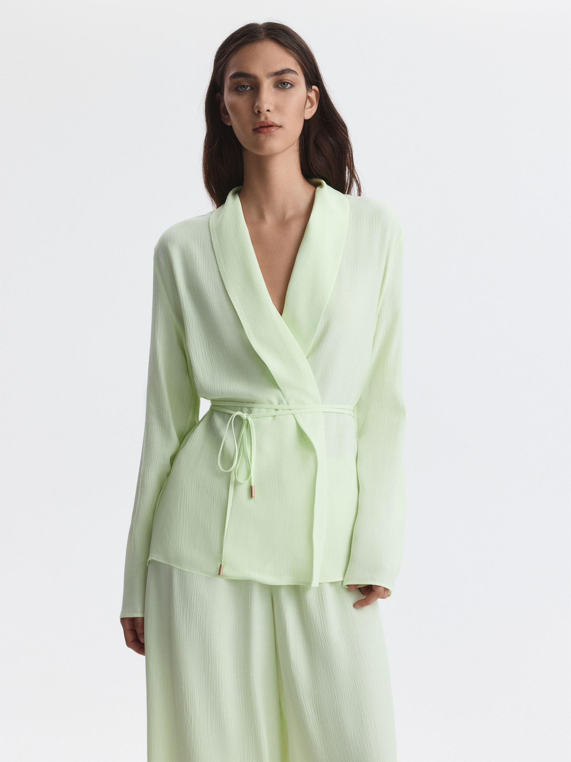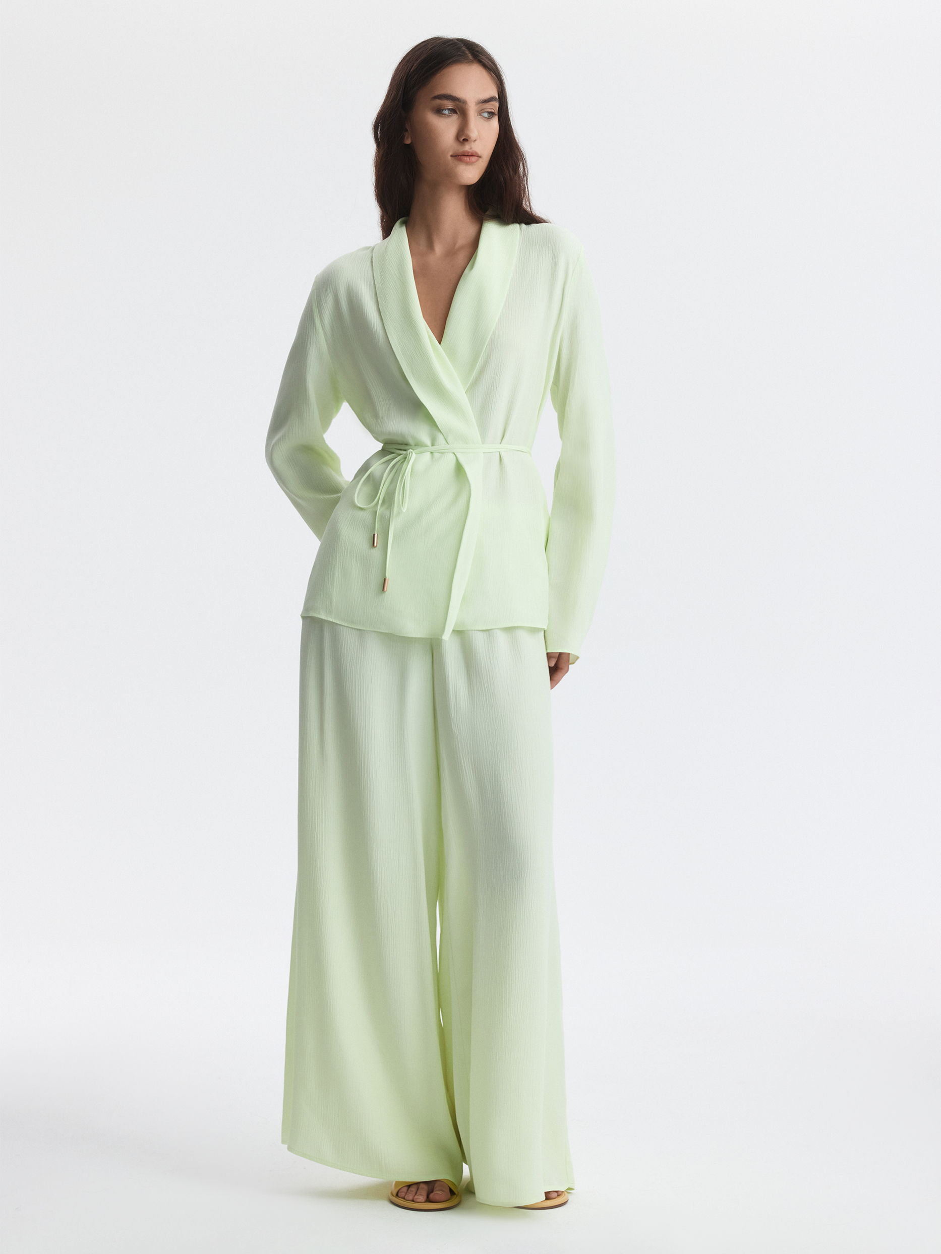Костюм в пижамном стиле отвечает за ощущение легкости и расслабленности. Тонкий жатый текстиль из вискозы почти не просвечивает, хорошо пропускает воздух и дарит комфорт. Комплект свободно сидит по фигуре и не сковывает движения.